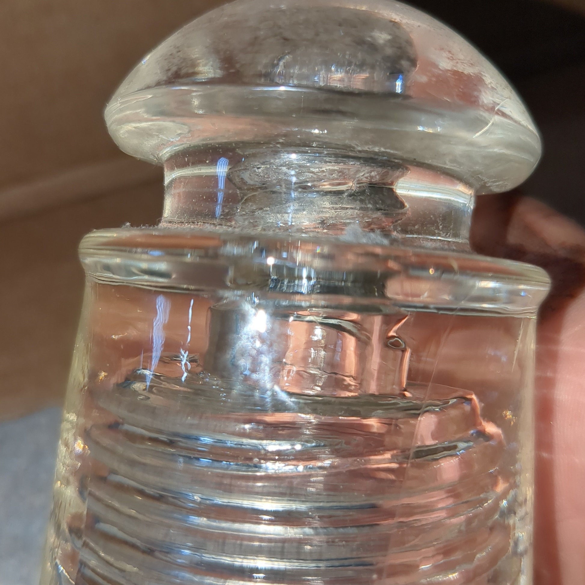 clear Pyrex insulator. in good condition no major chips cracks damage seen. 4" tall and 2 5/8" diameter. Please see photos as they are part of the description.