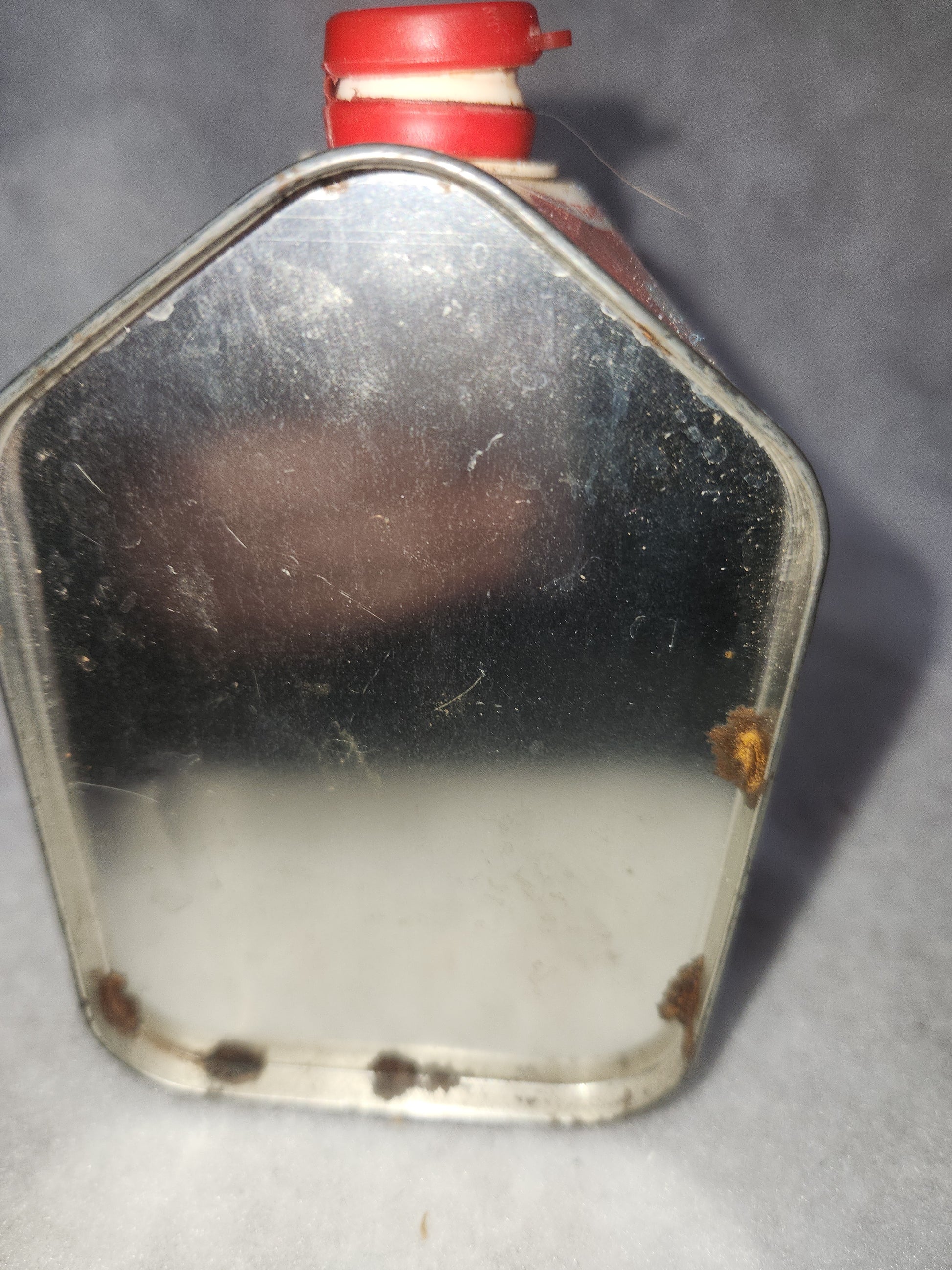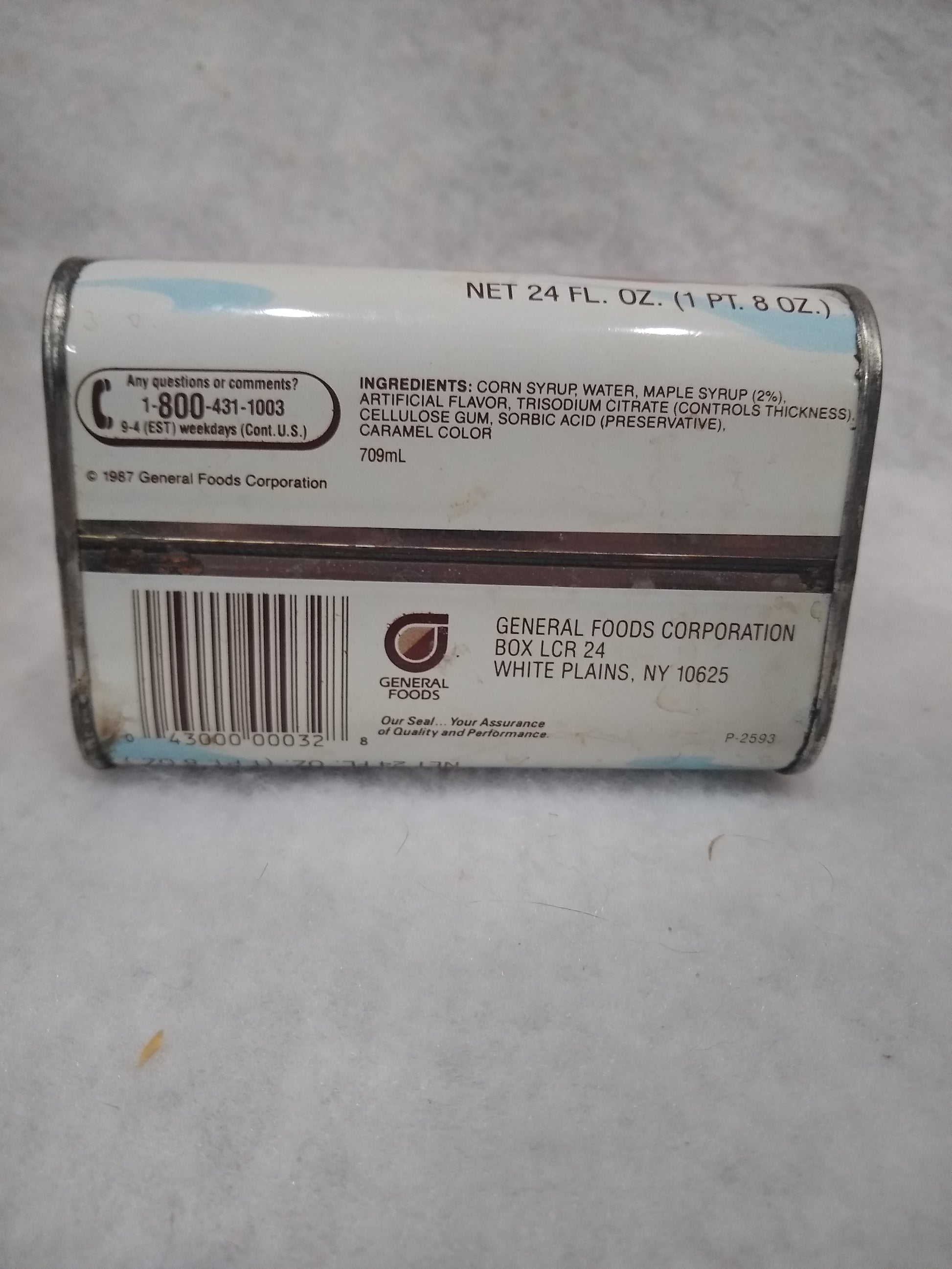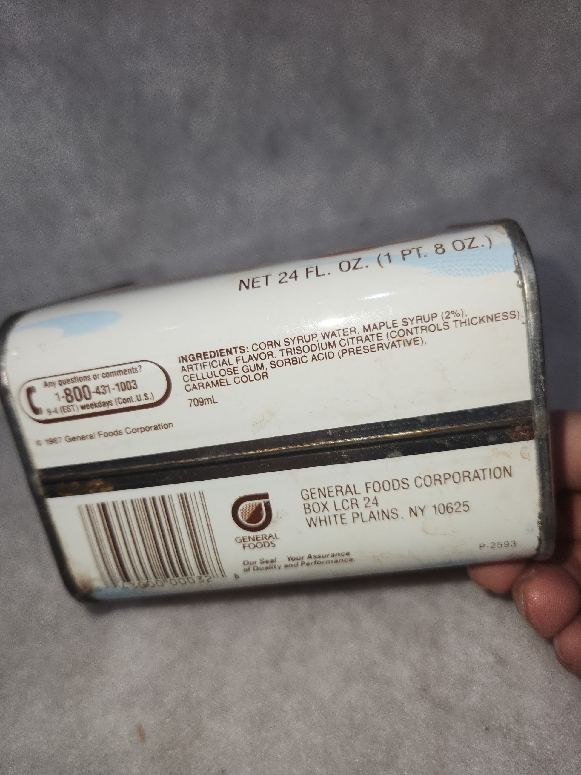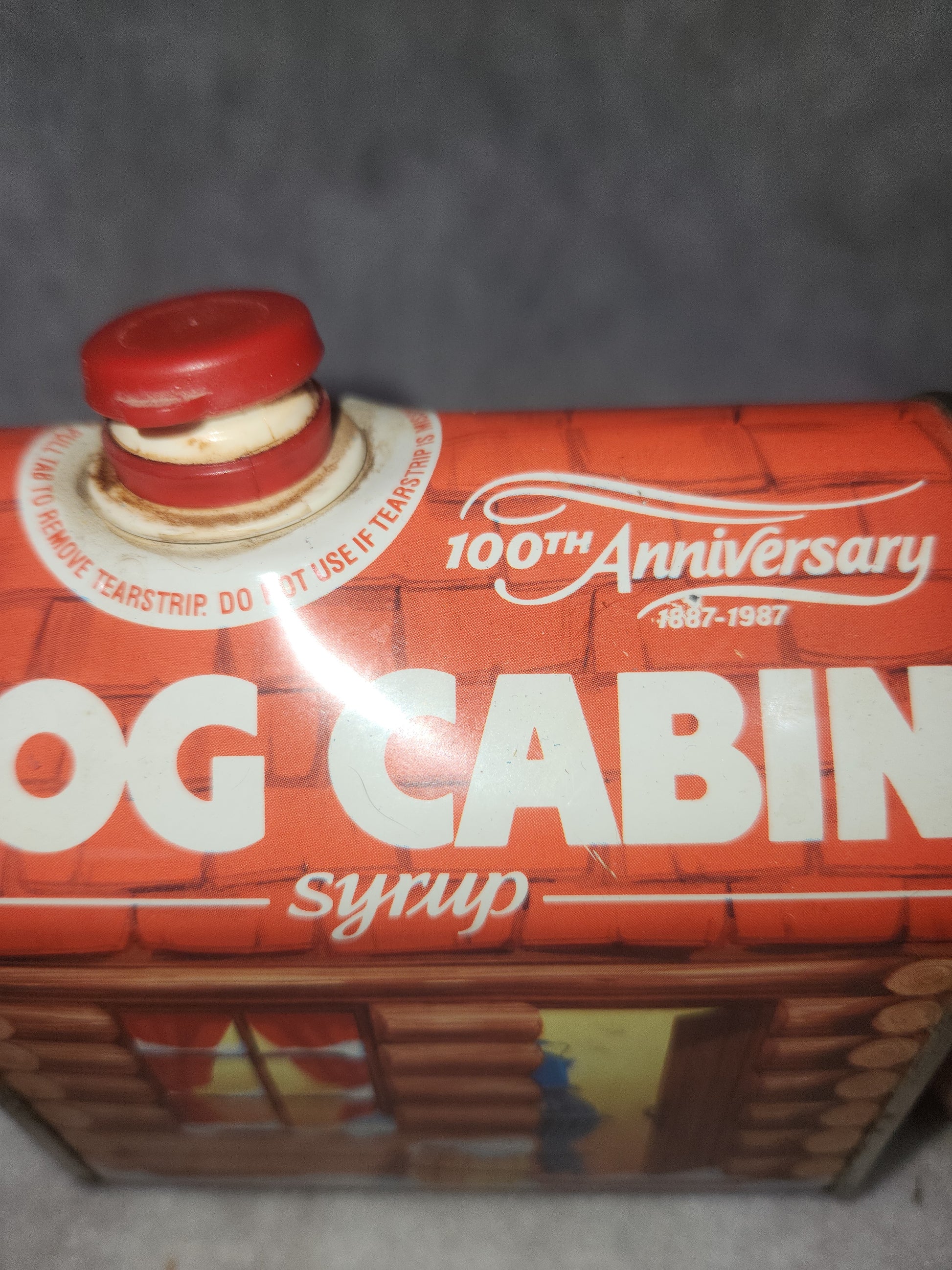 This Log Cabin syrup tin says "100th Anniversary 1887-1987" It has its top. The tin has some areas of rest and wear along the sides.There are dirty spots on it that need to be cleaned.But i'm afraid of cleaning it and wiping off the color period there are a few scratches on the tin but overall for its age it's in good condition. Please see the photos as they are part of the description
