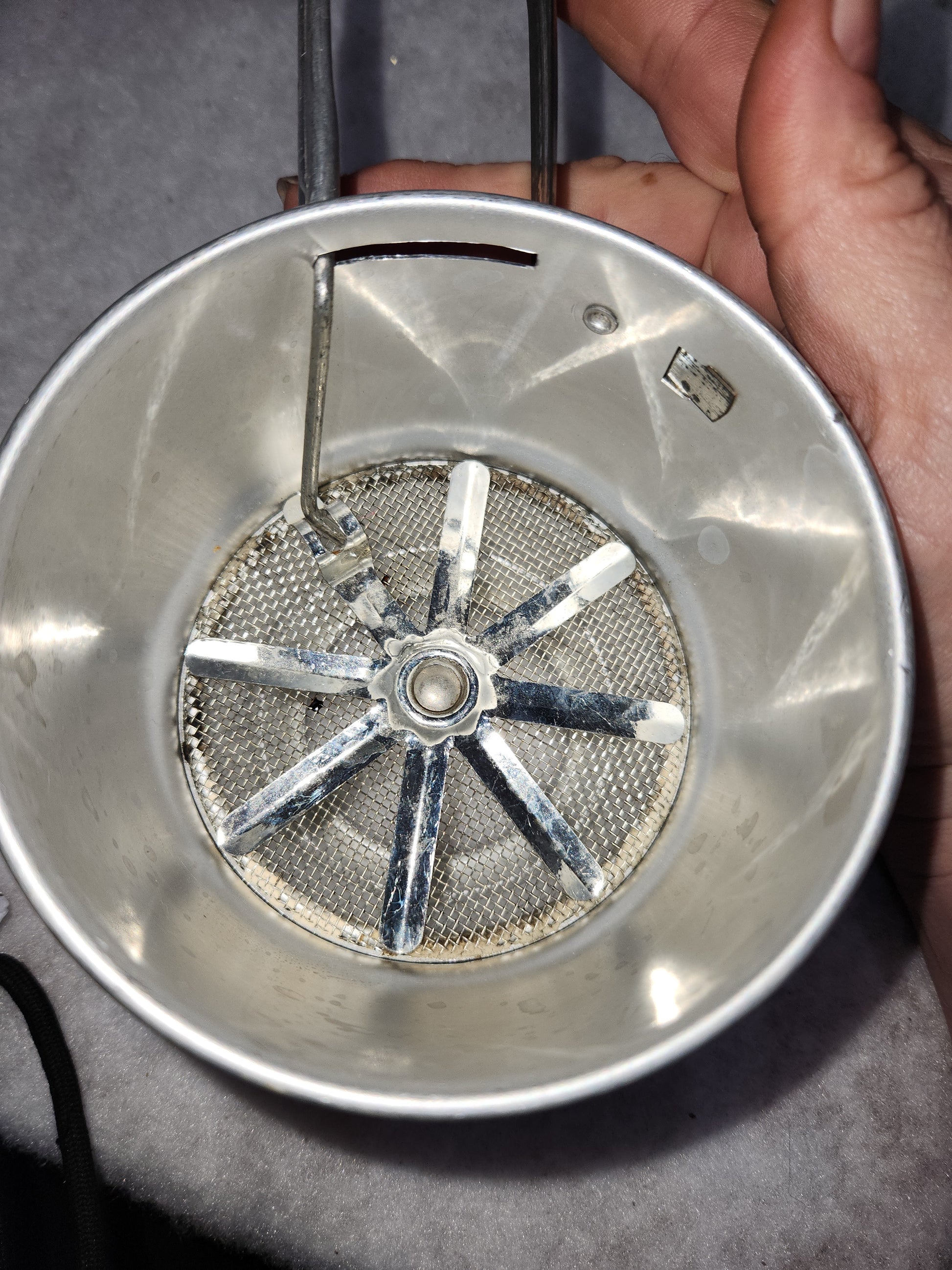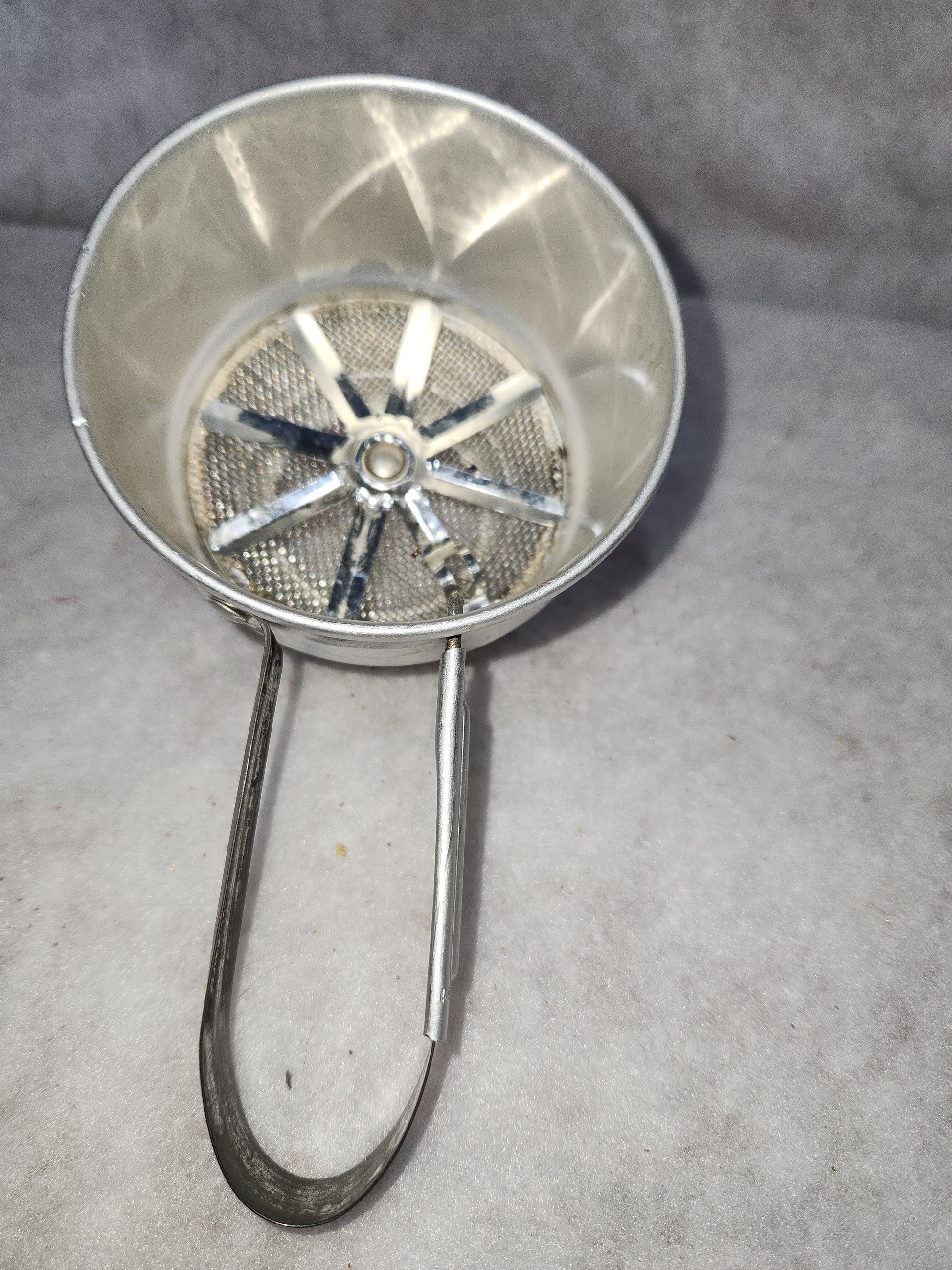 Vintage Foley Small Aluminum Flour Sifter squeeze handle 1 to 2 cup Pat. NO 2322676 fs7