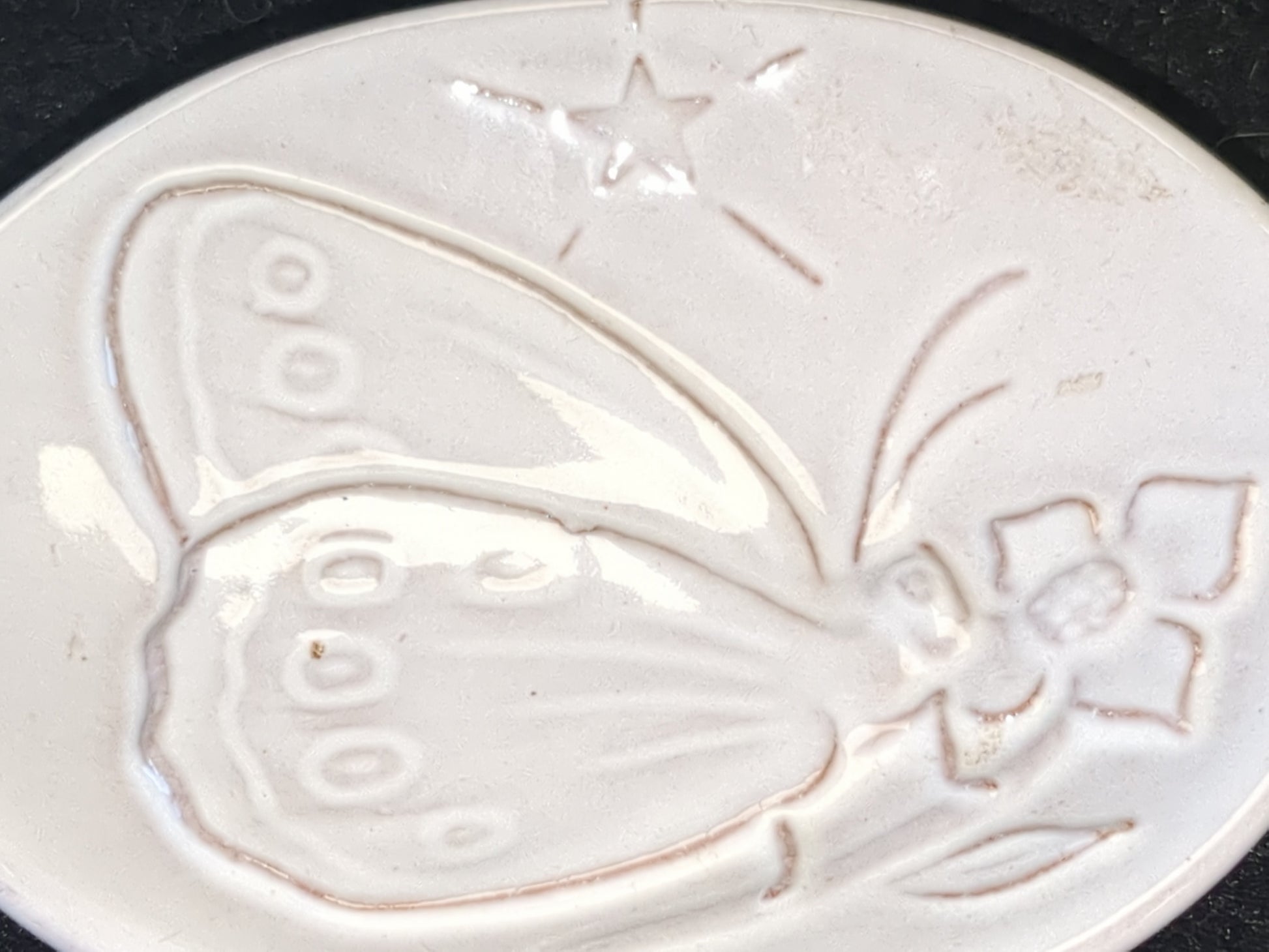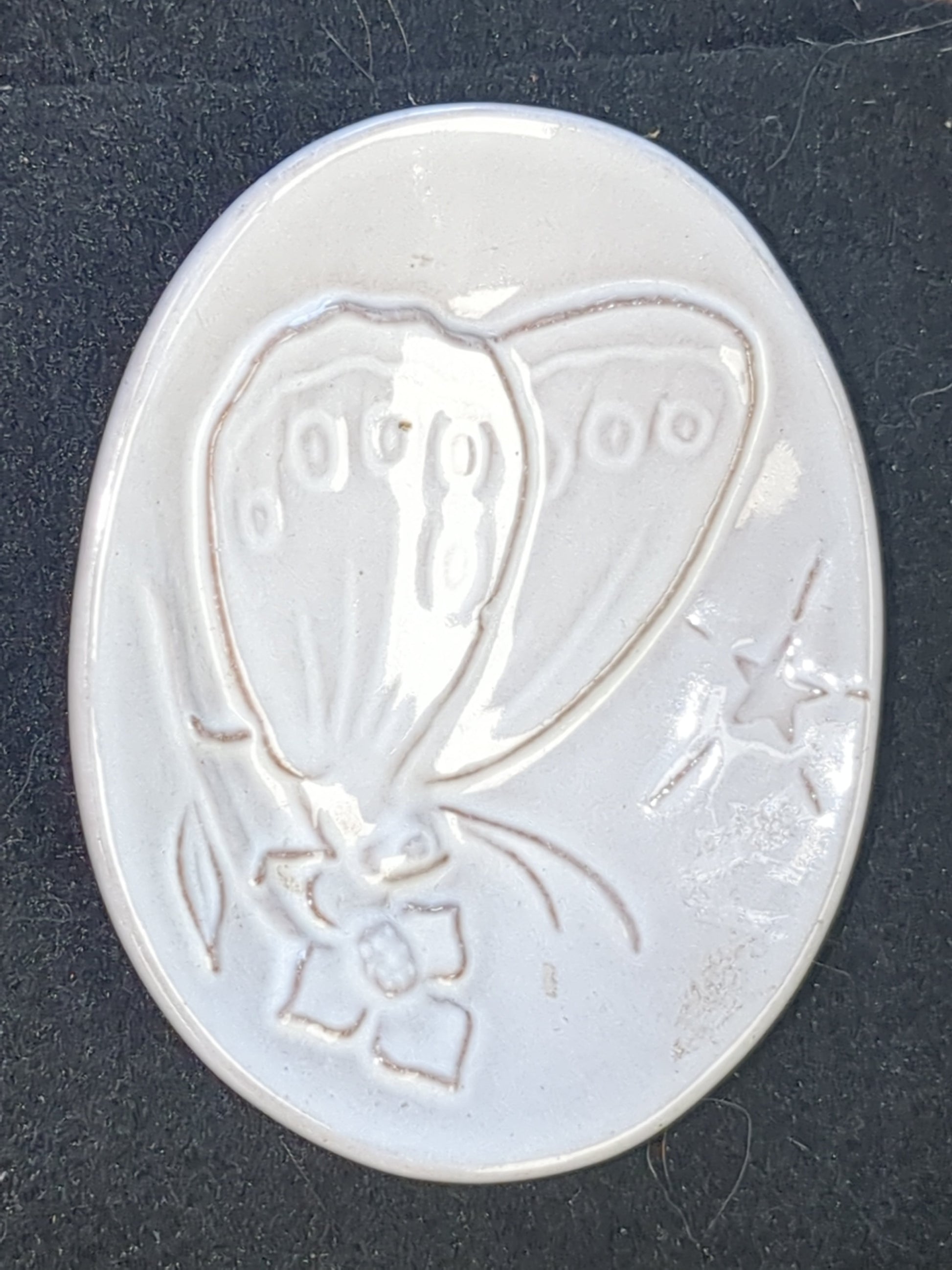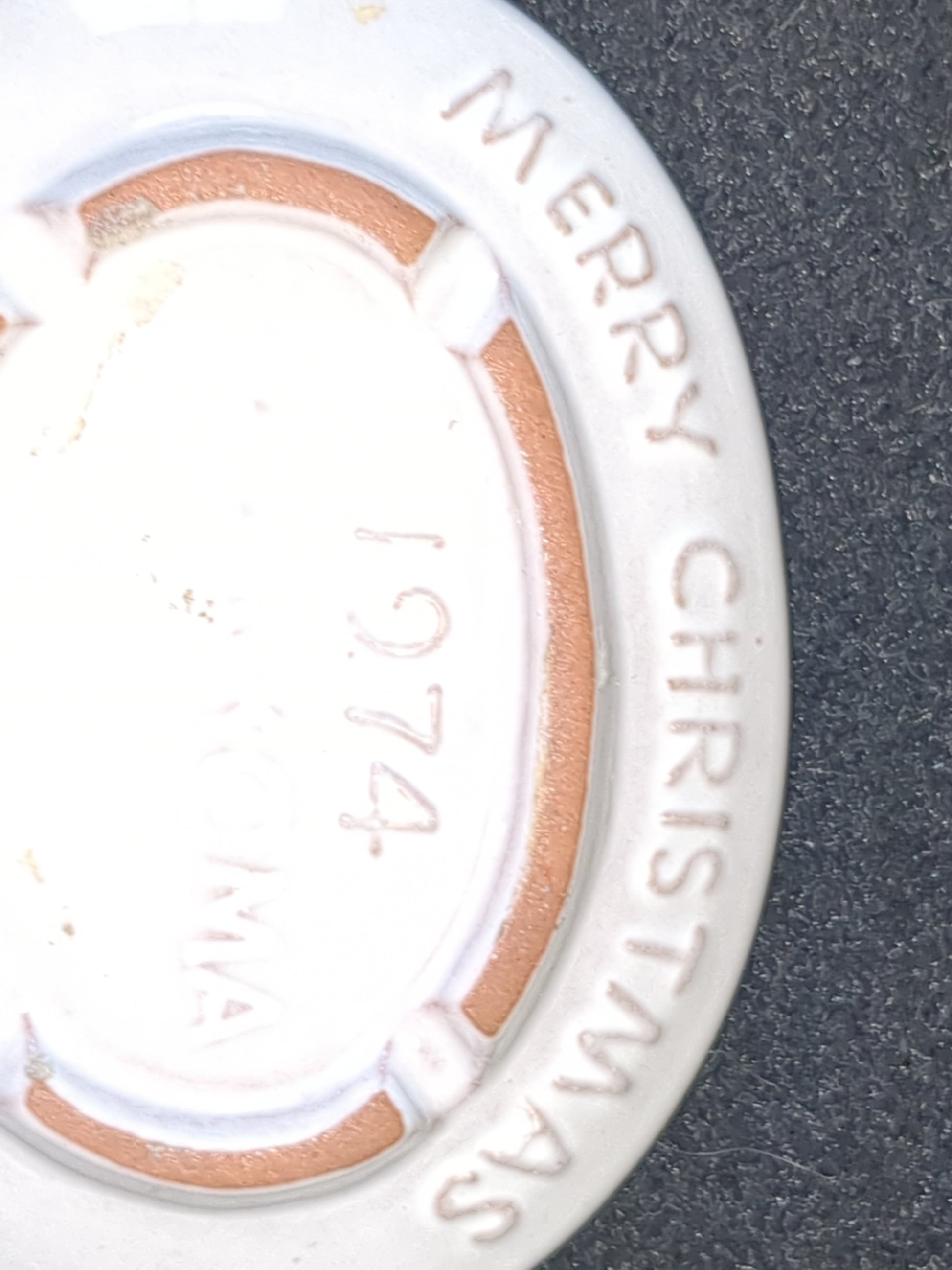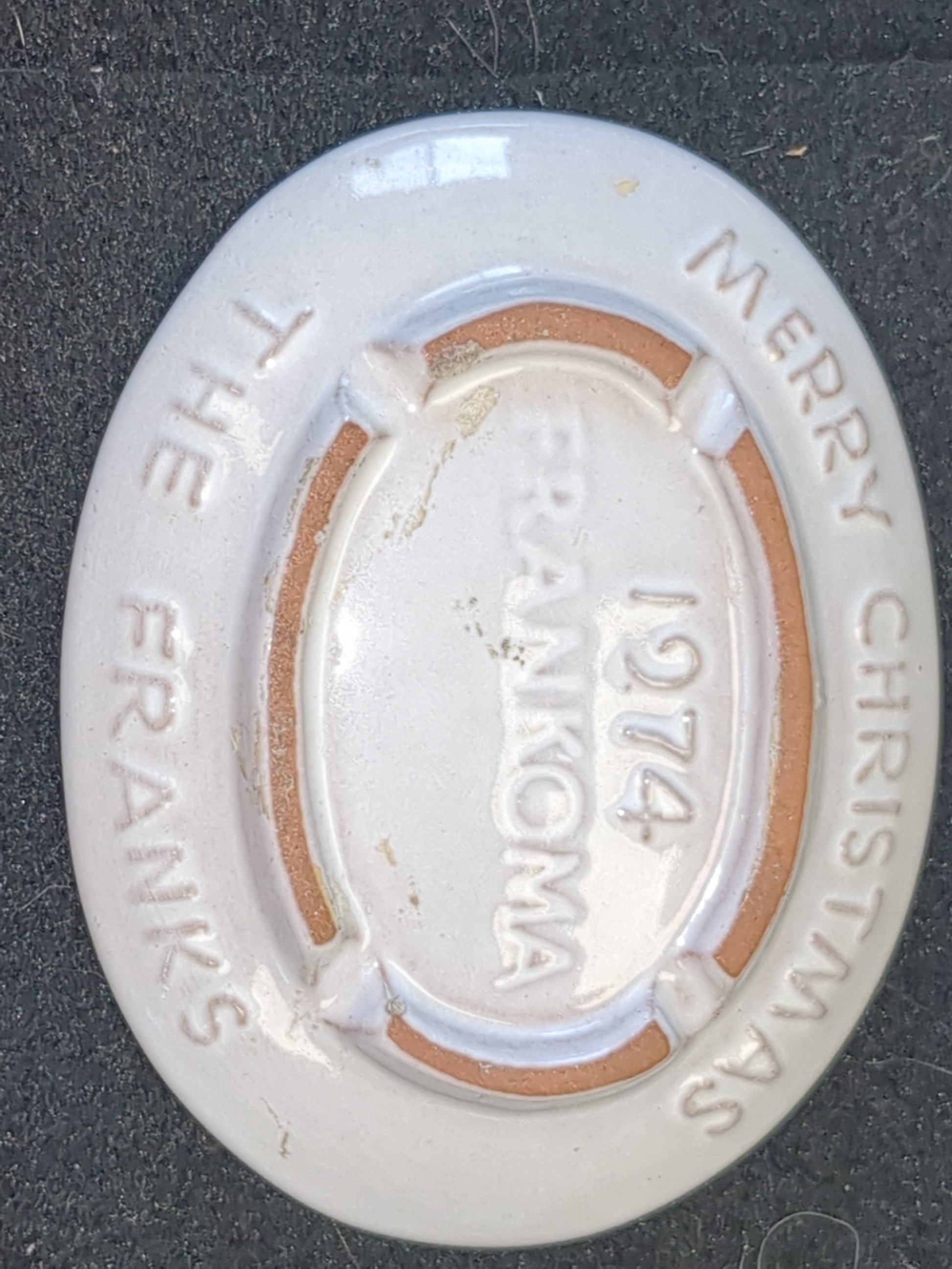 This listing is for a Frankoma pottery Christmas card miniature. This holiday greeting series began production in 1959. The oval pottery greeting cards measure 3"in height and 2.75” in length and is glazed.