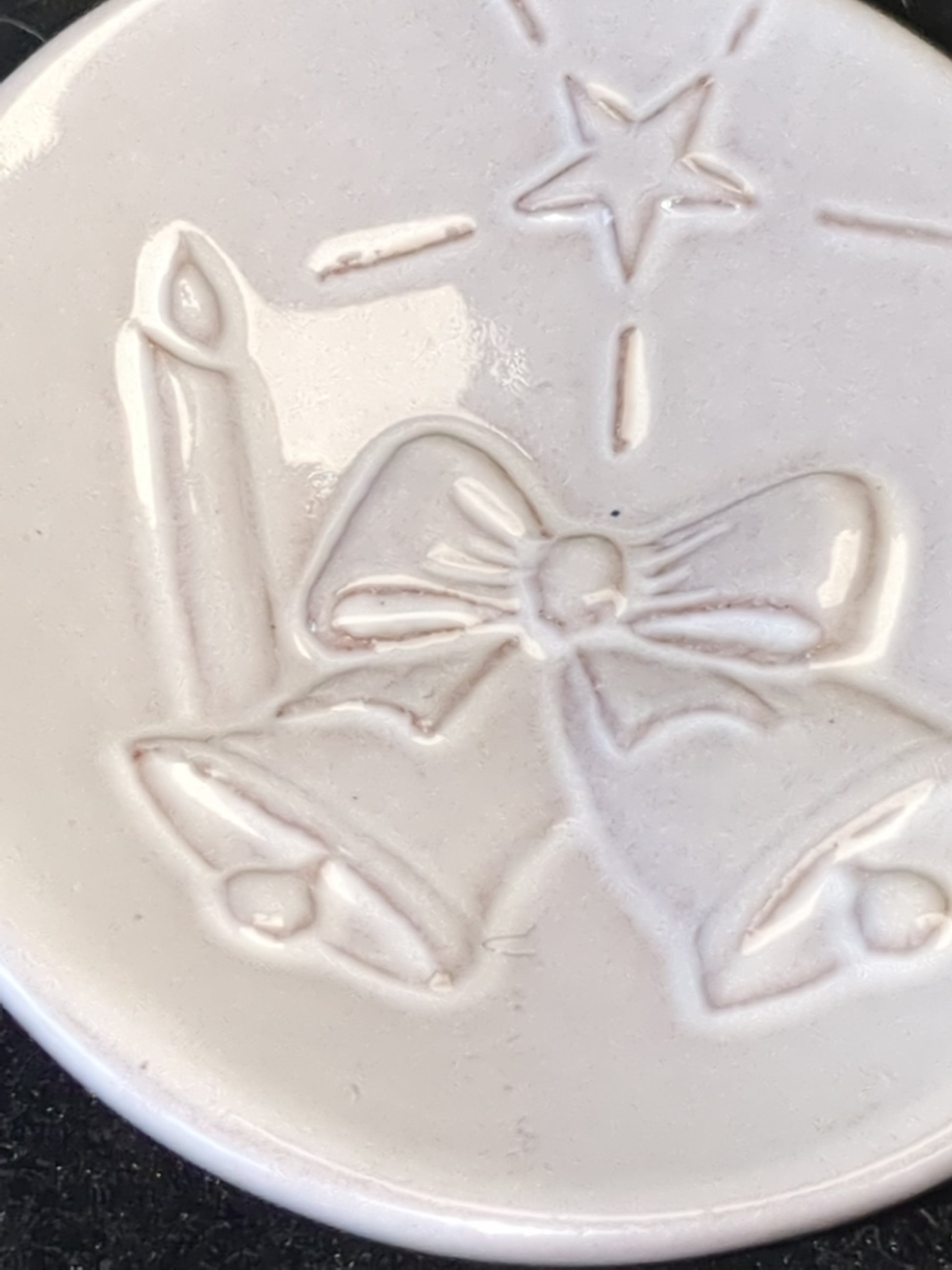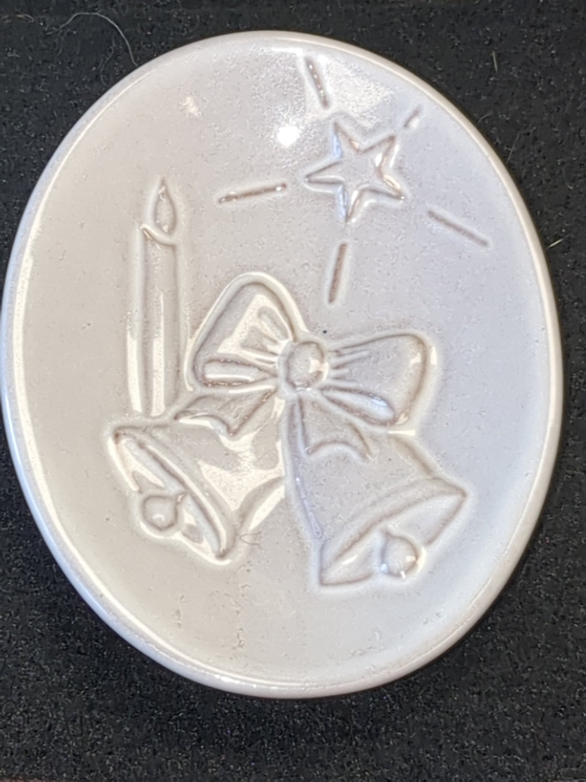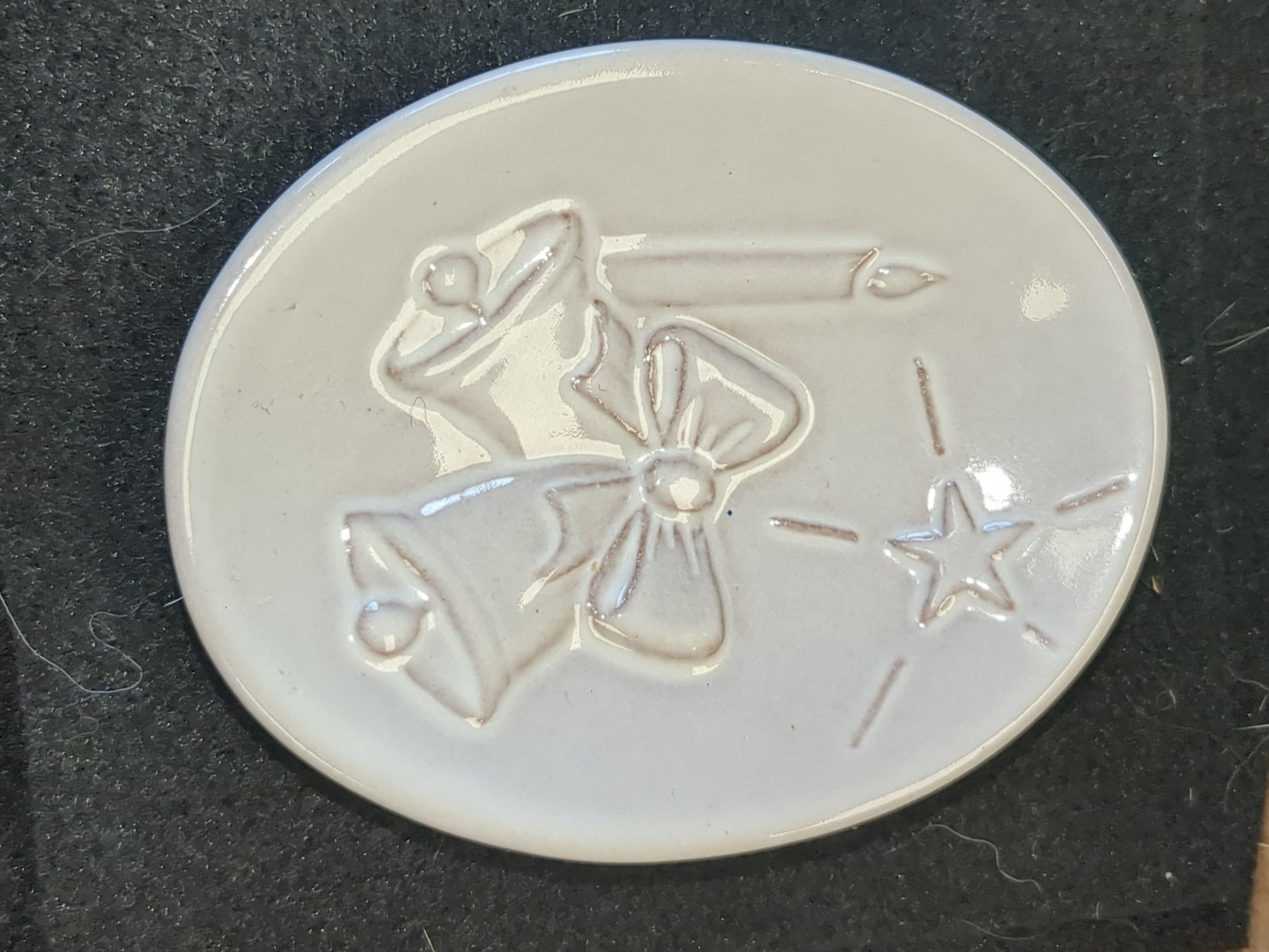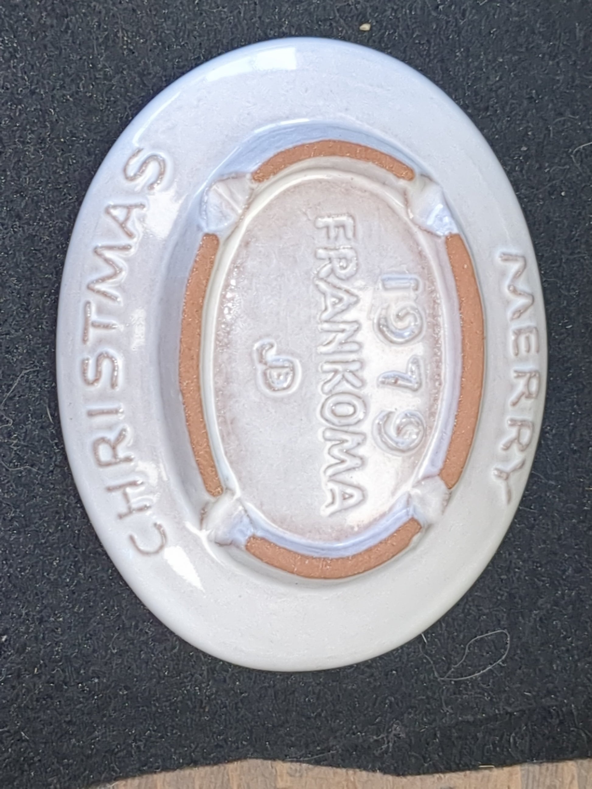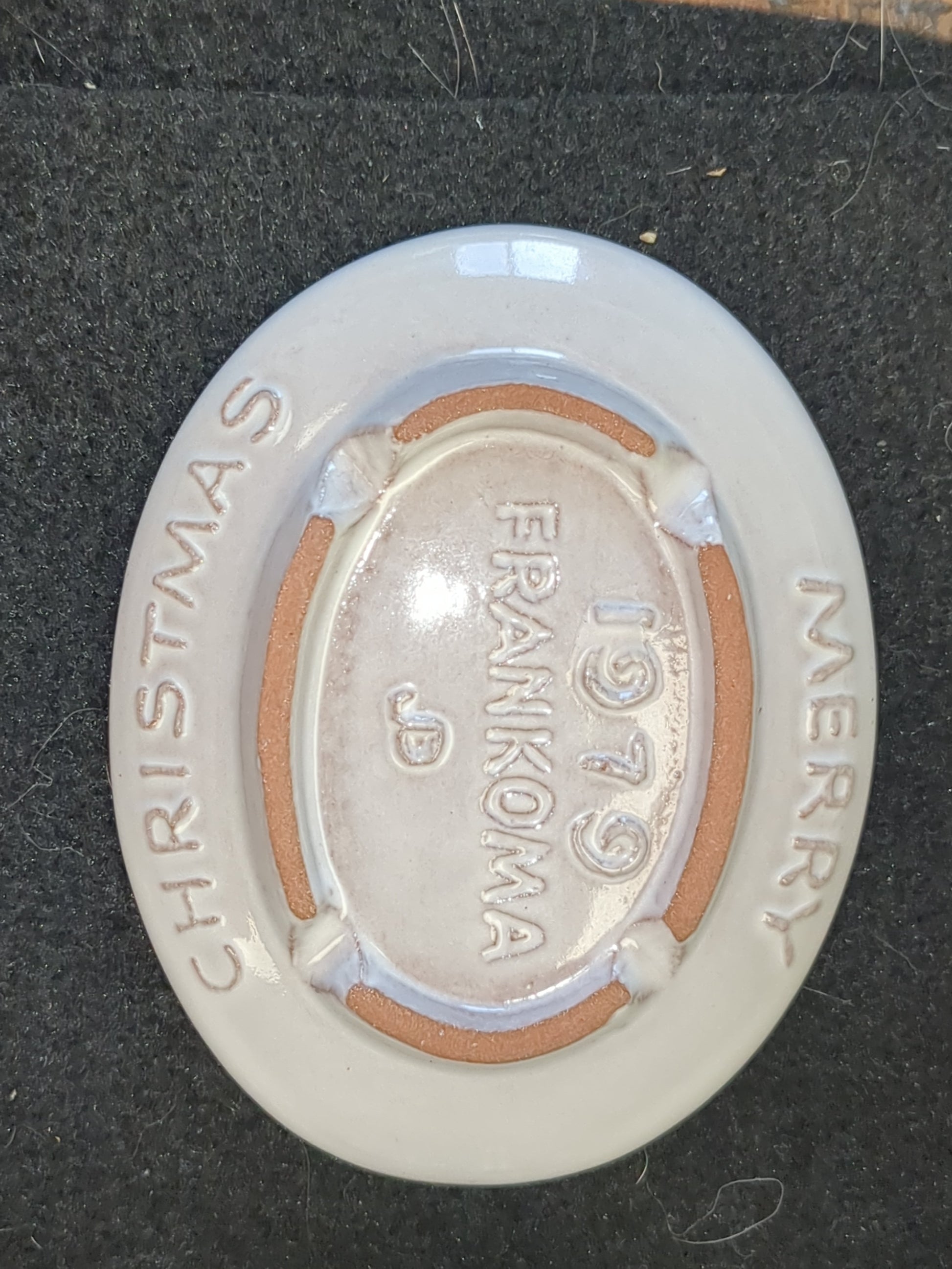 This listing is for a Frankoma pottery Christmas card miniature. This holiday greeting series began production in 1959. The oval pottery greeting cards measure 3"in height and 2.75” in length and is glazed.