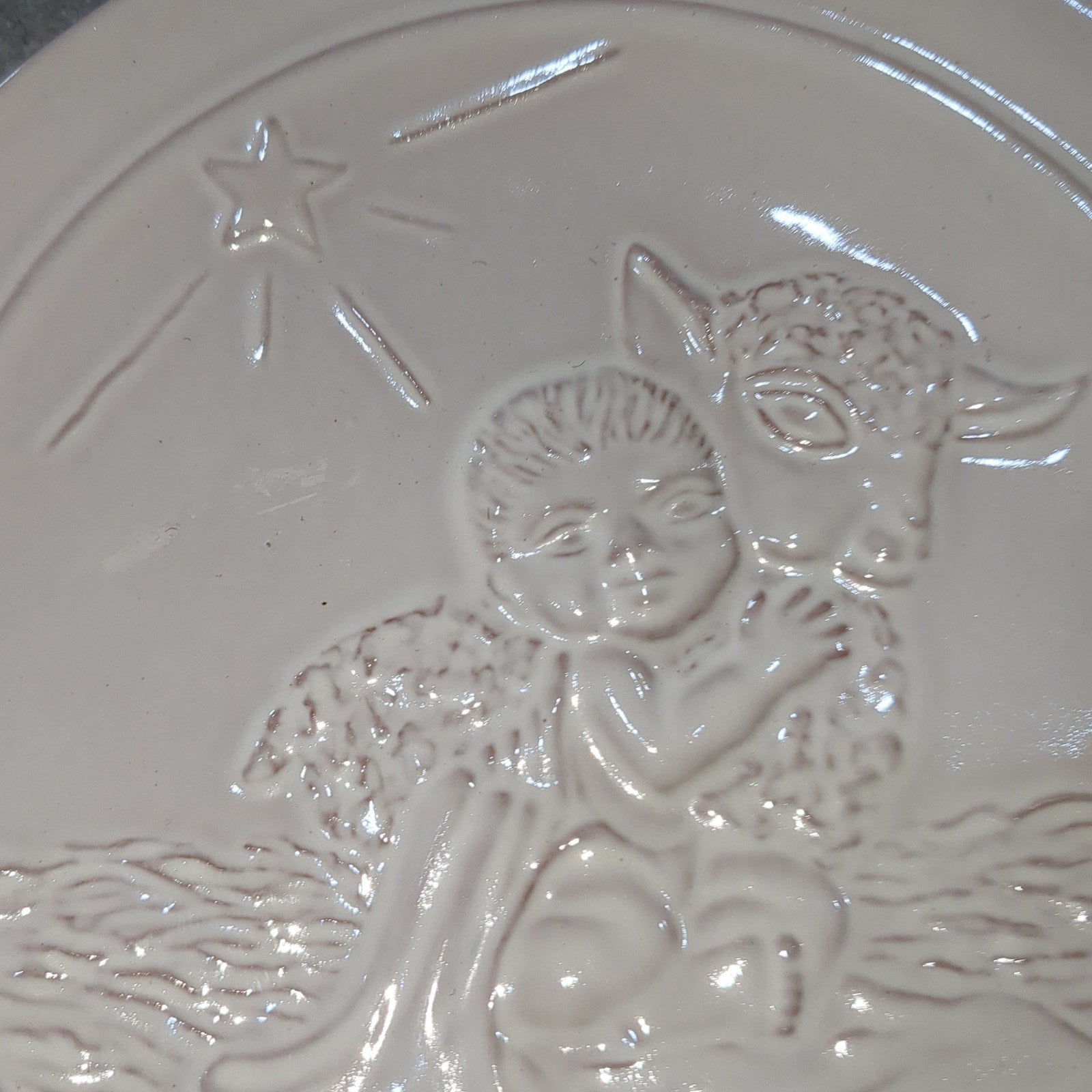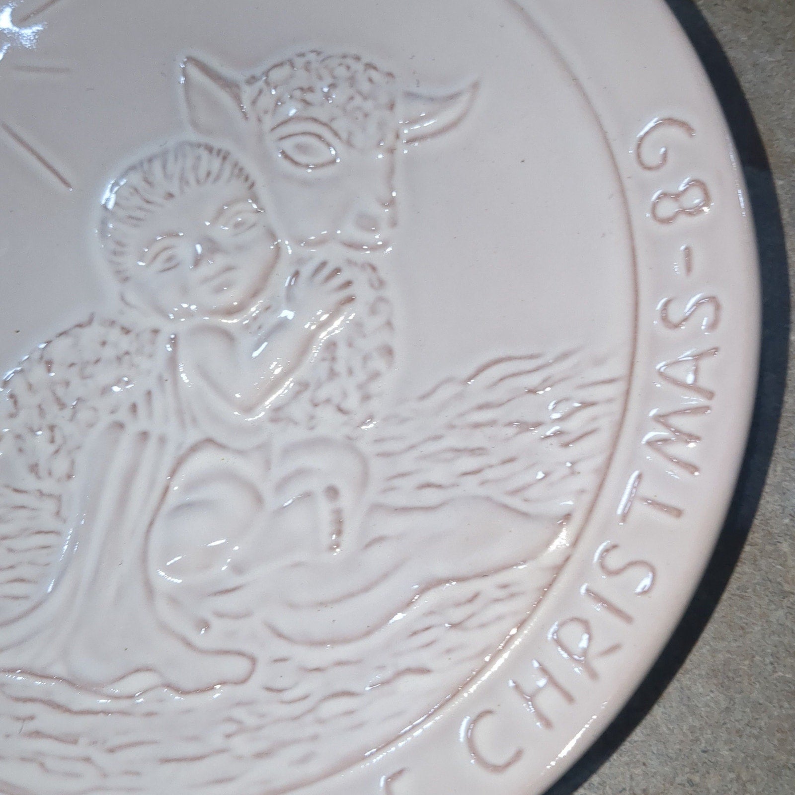 Frankoma Christmas Plate from 1989. Crafted from white glazed pottery, this collector plate features a beautiful round shape with a diameter of 8.25 inches. This plate is produced using the pottery technique and is a great representation of American culture. it is in great condition no chips no cracks and has holes ready to hang on your wall