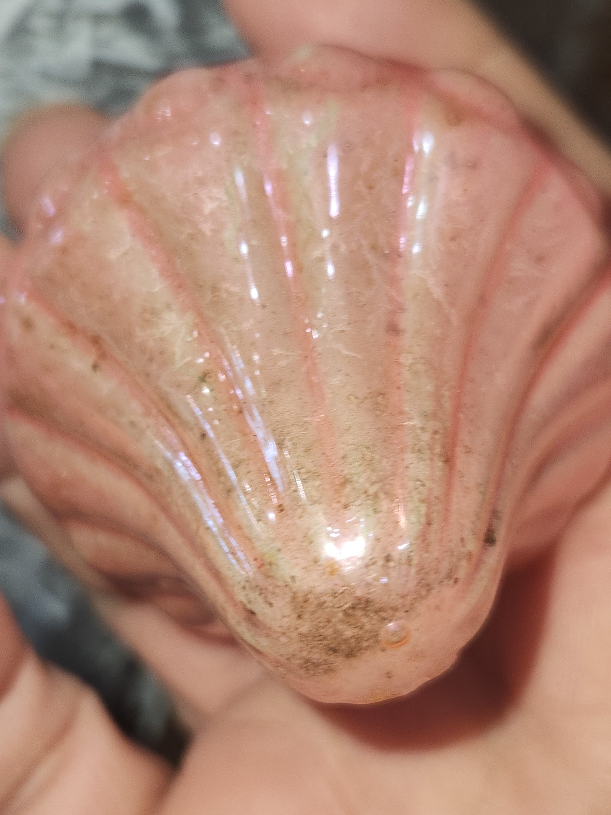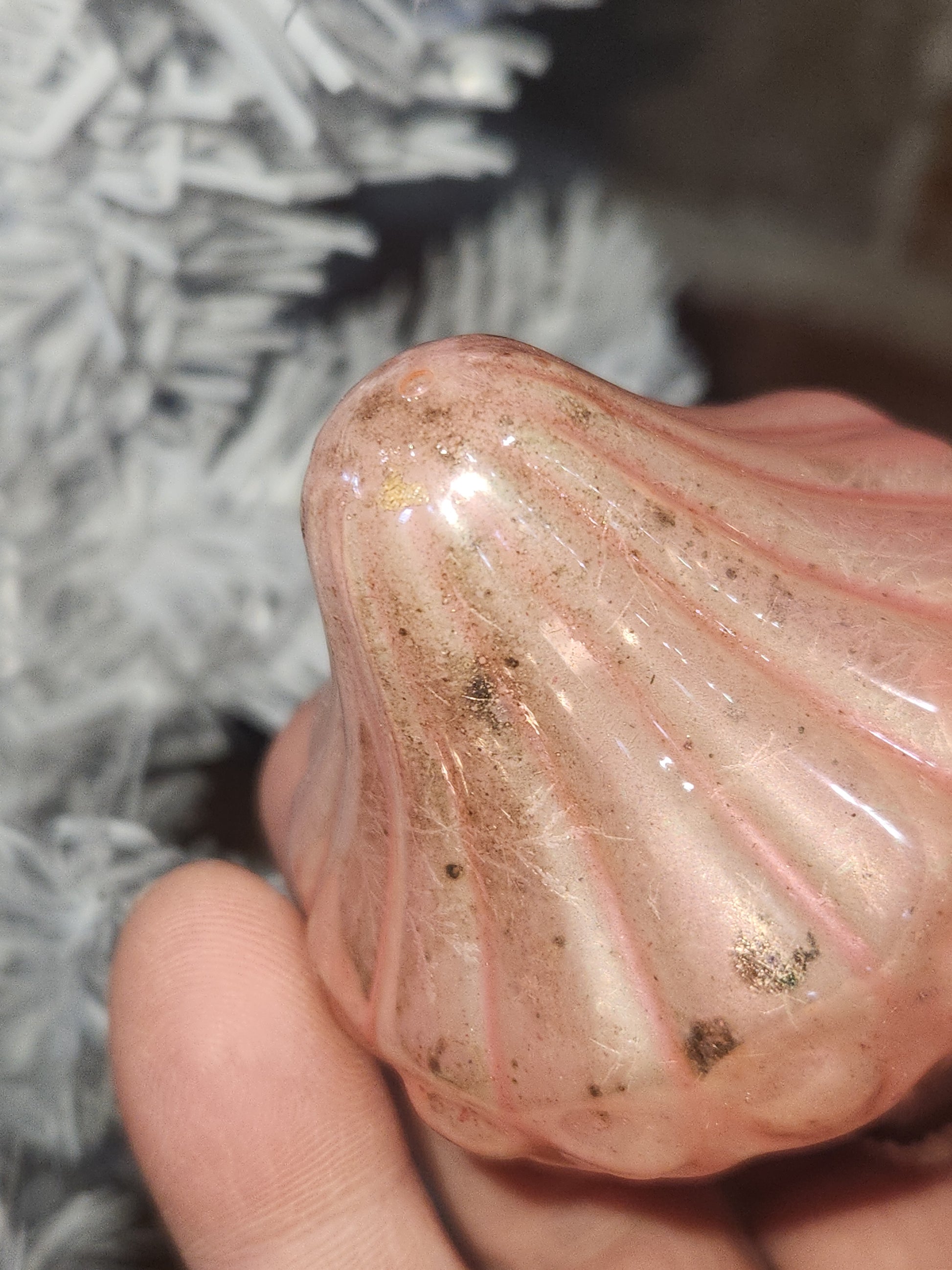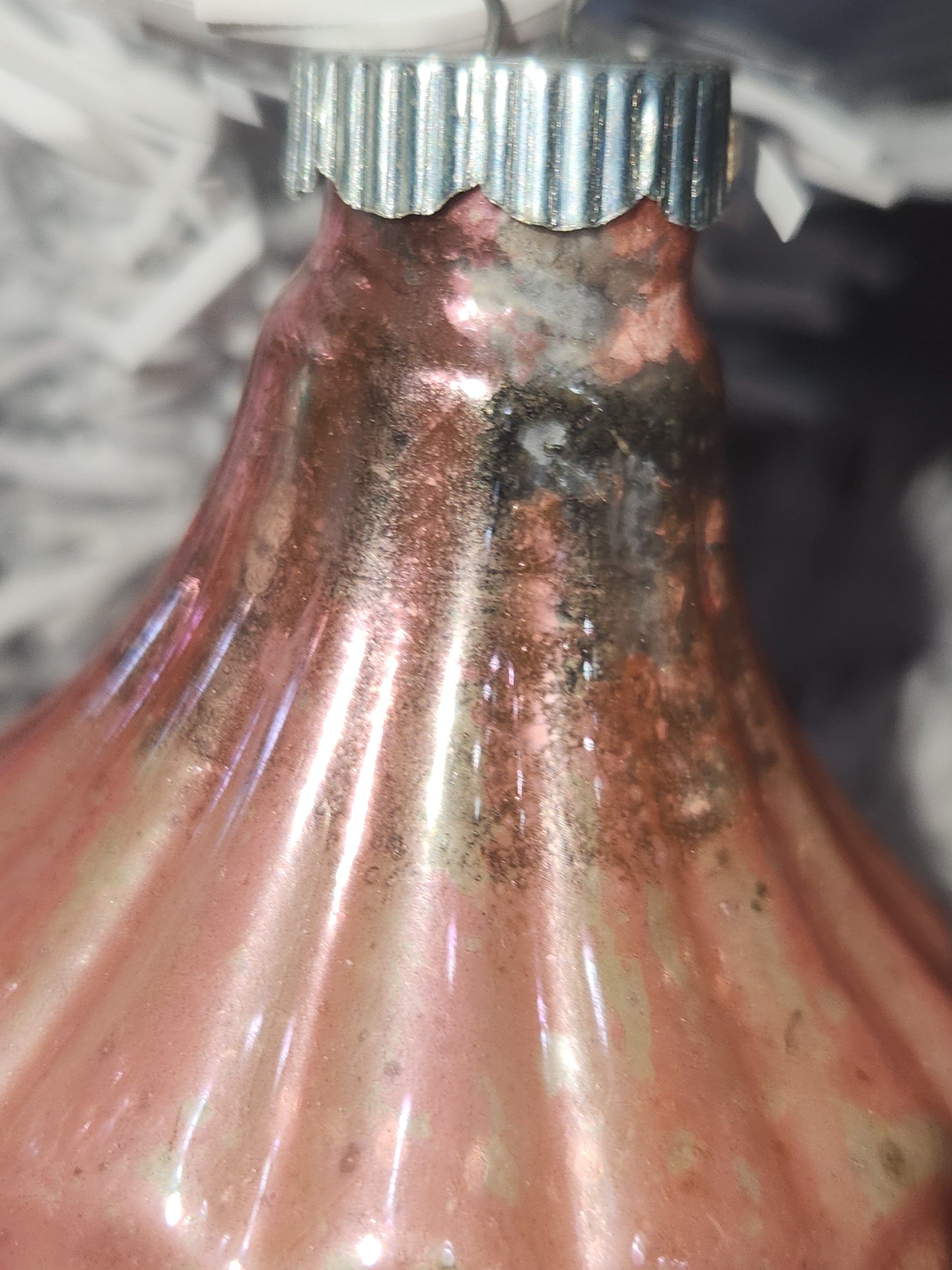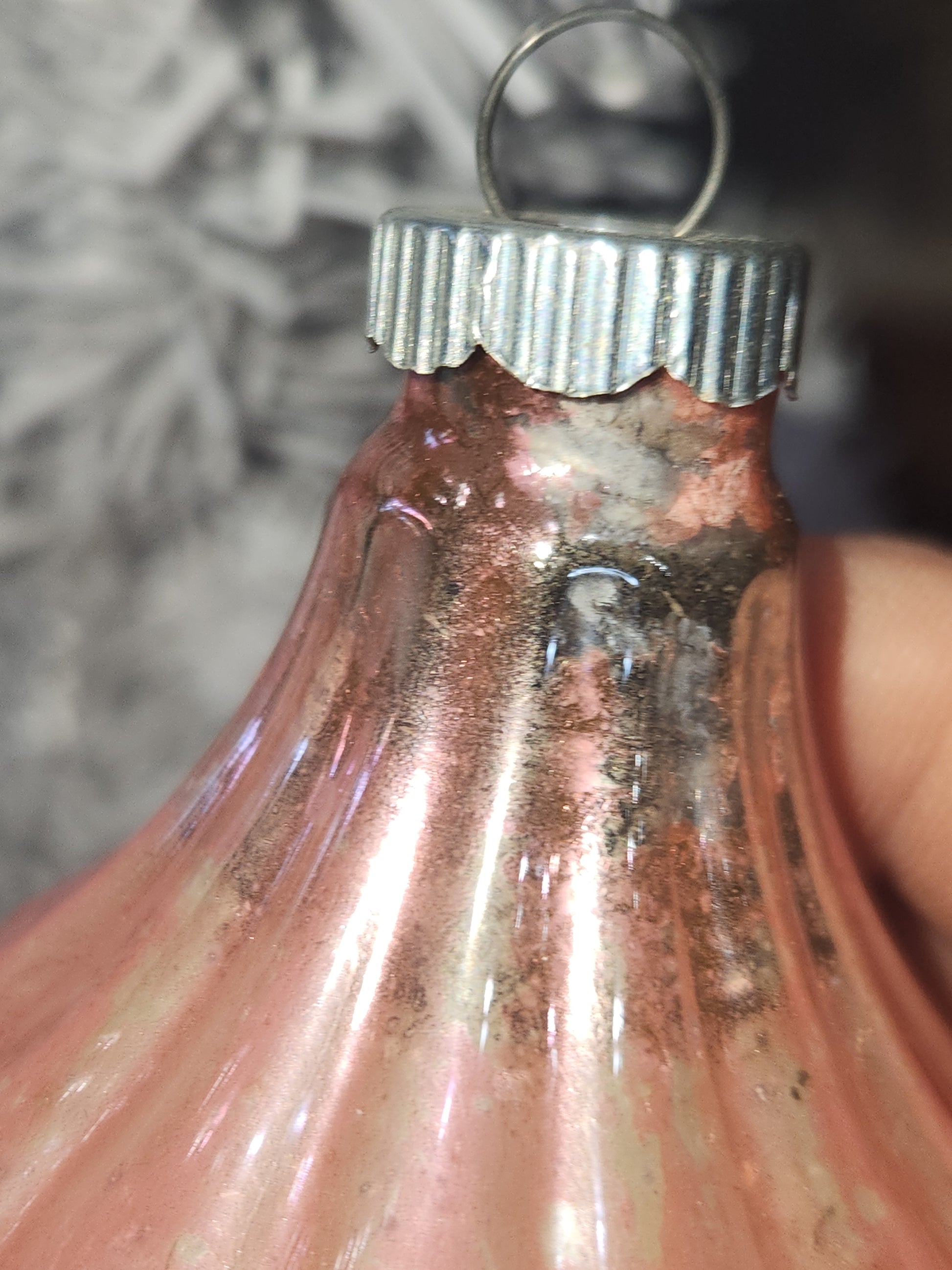 This ornament is in fair condition with no cracks or chips, it does have areas of discoloration, or possibly a bad paint job. It is also possible it has lost its silver coating inside. It us a pretty shade of pink. It is 3 3/4" to top of hanging loop. It glows under my UV light. When buying vintage ornaments please understand they can have crackling, crazing, discoloration and paintloss. Please be aware of that before ordering. Please see photos as they are part of the description