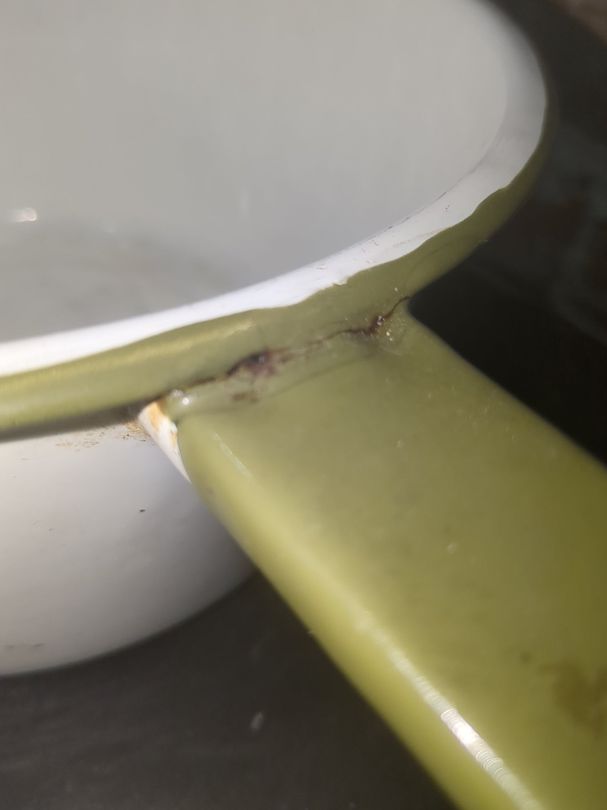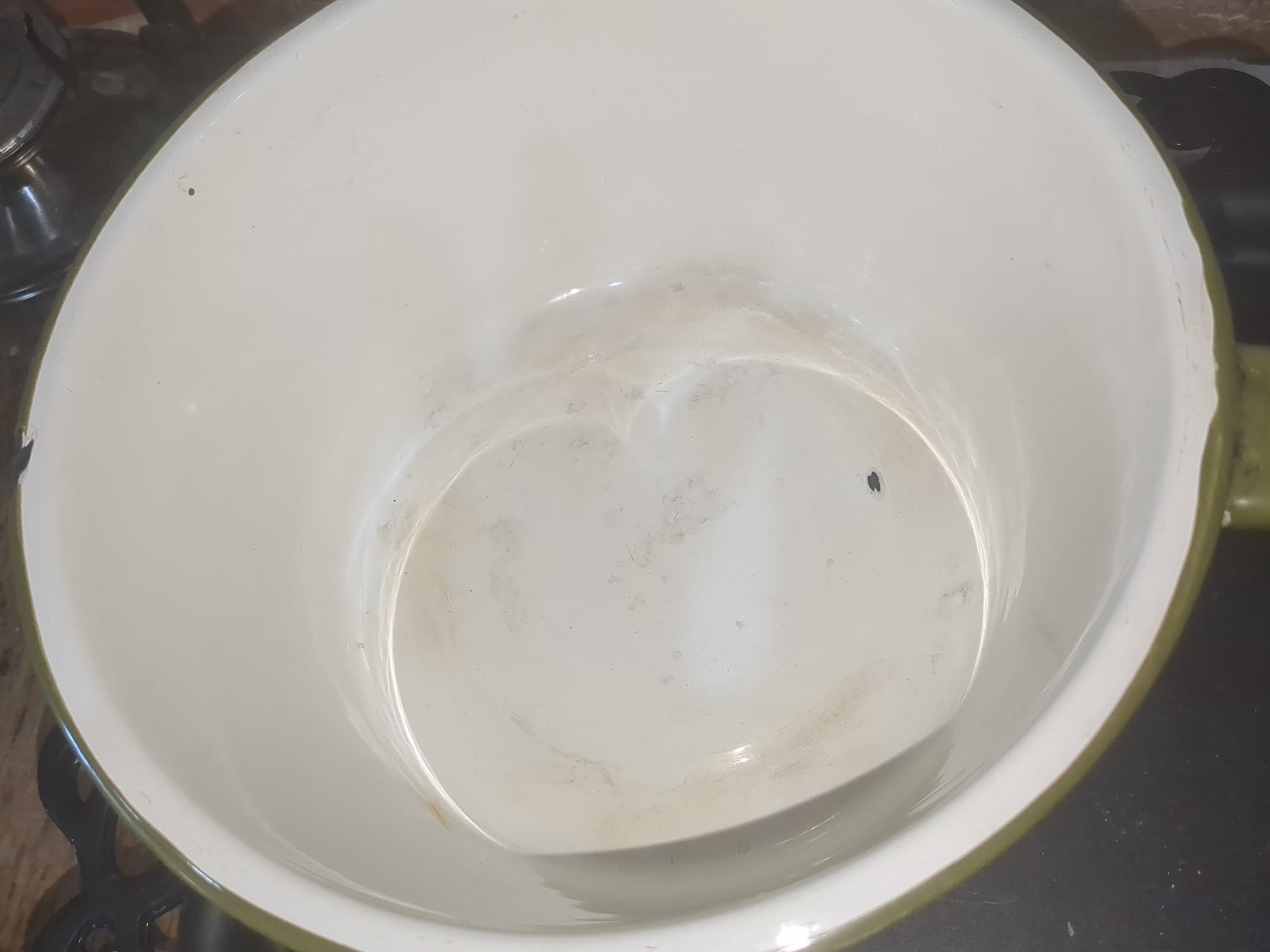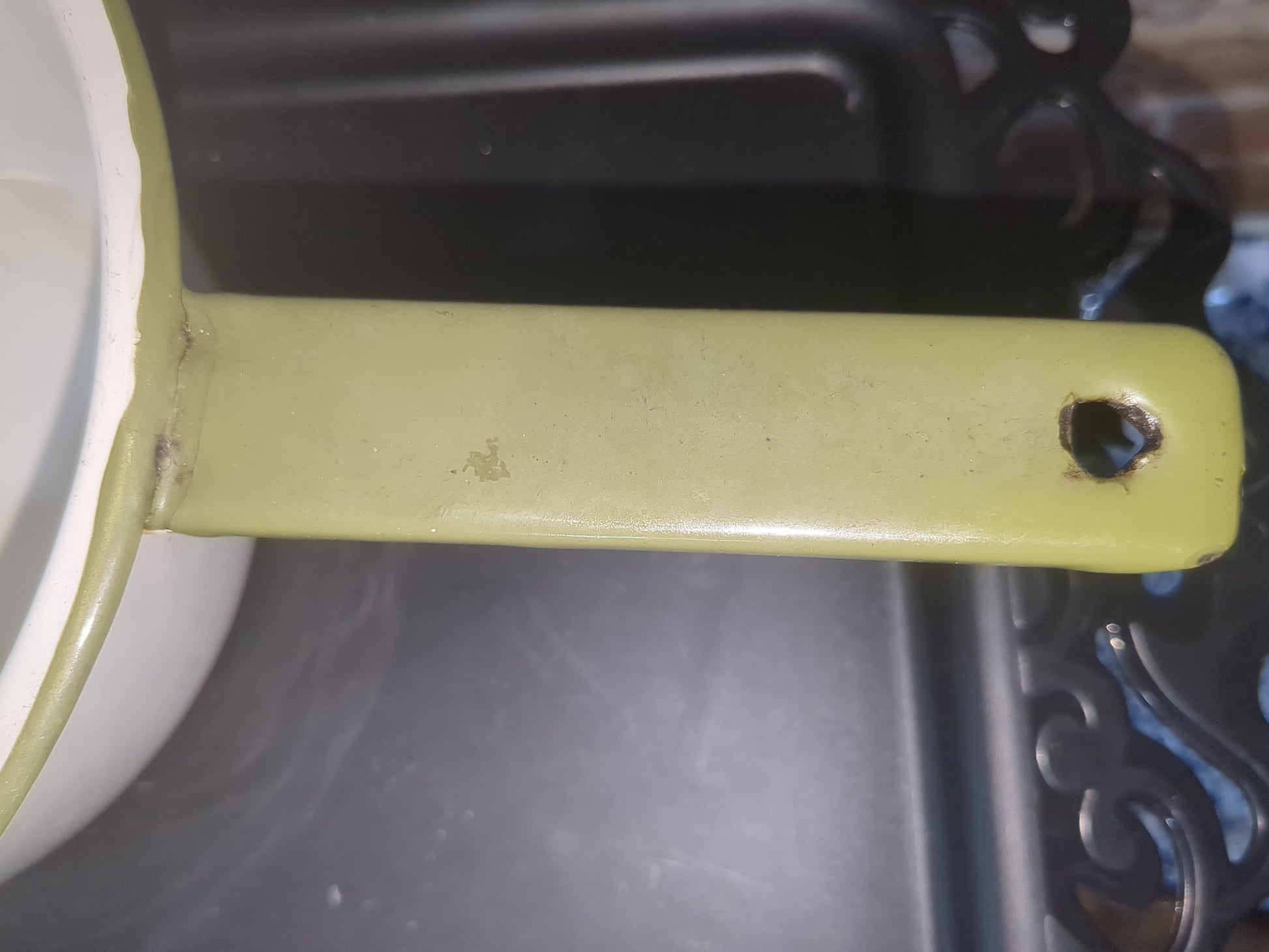 This is a unique colored enamel pot it's white with almost a military green color. it has some patina. it has some areas that have lost its enamel around the rim inside and on the bottom of the handle. It has some rust. Please see photos since these are part of the description.
