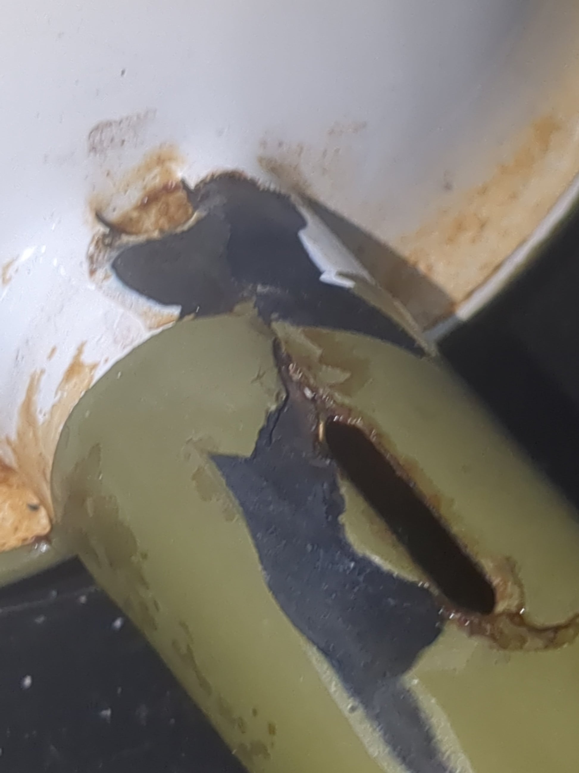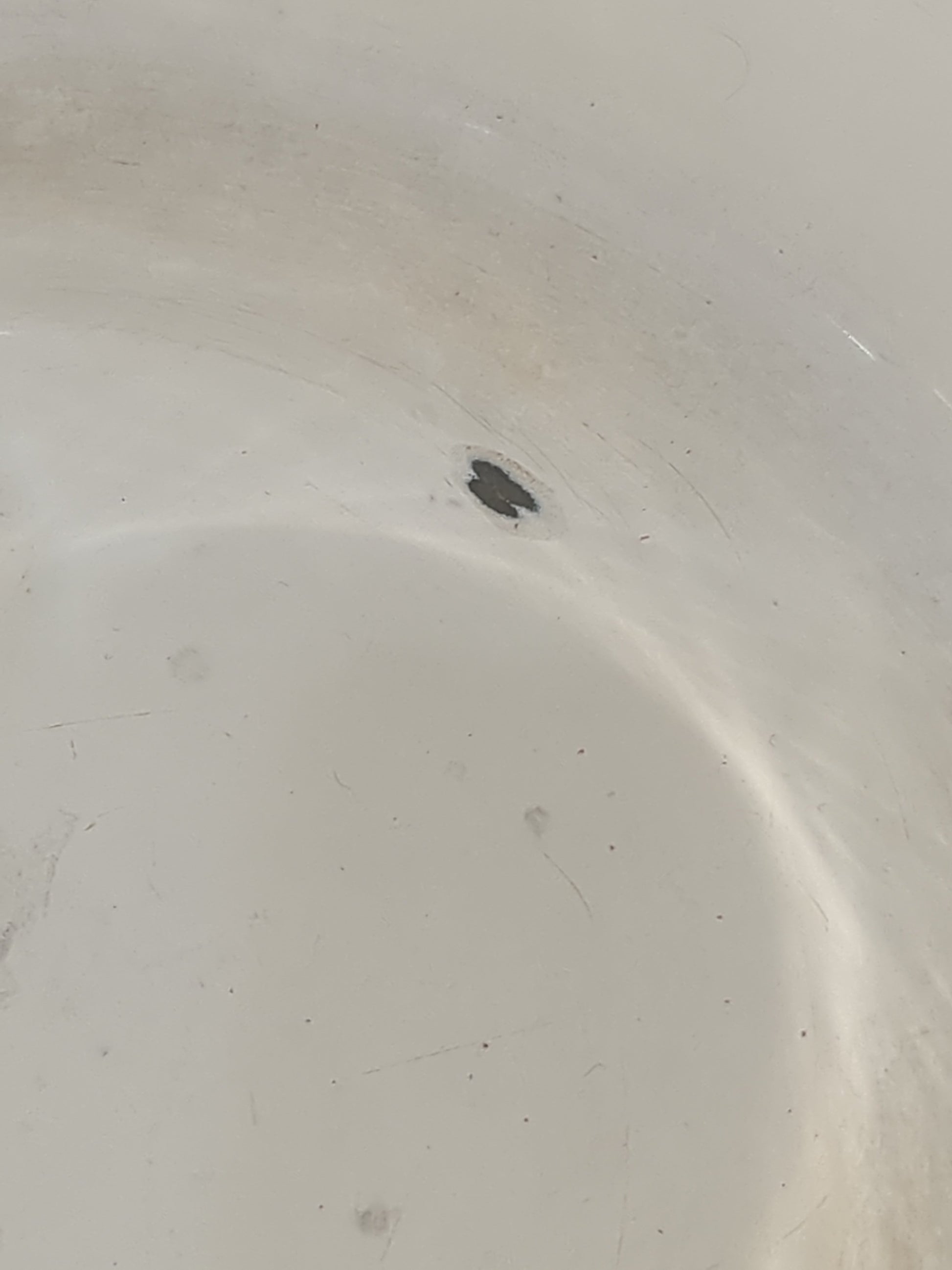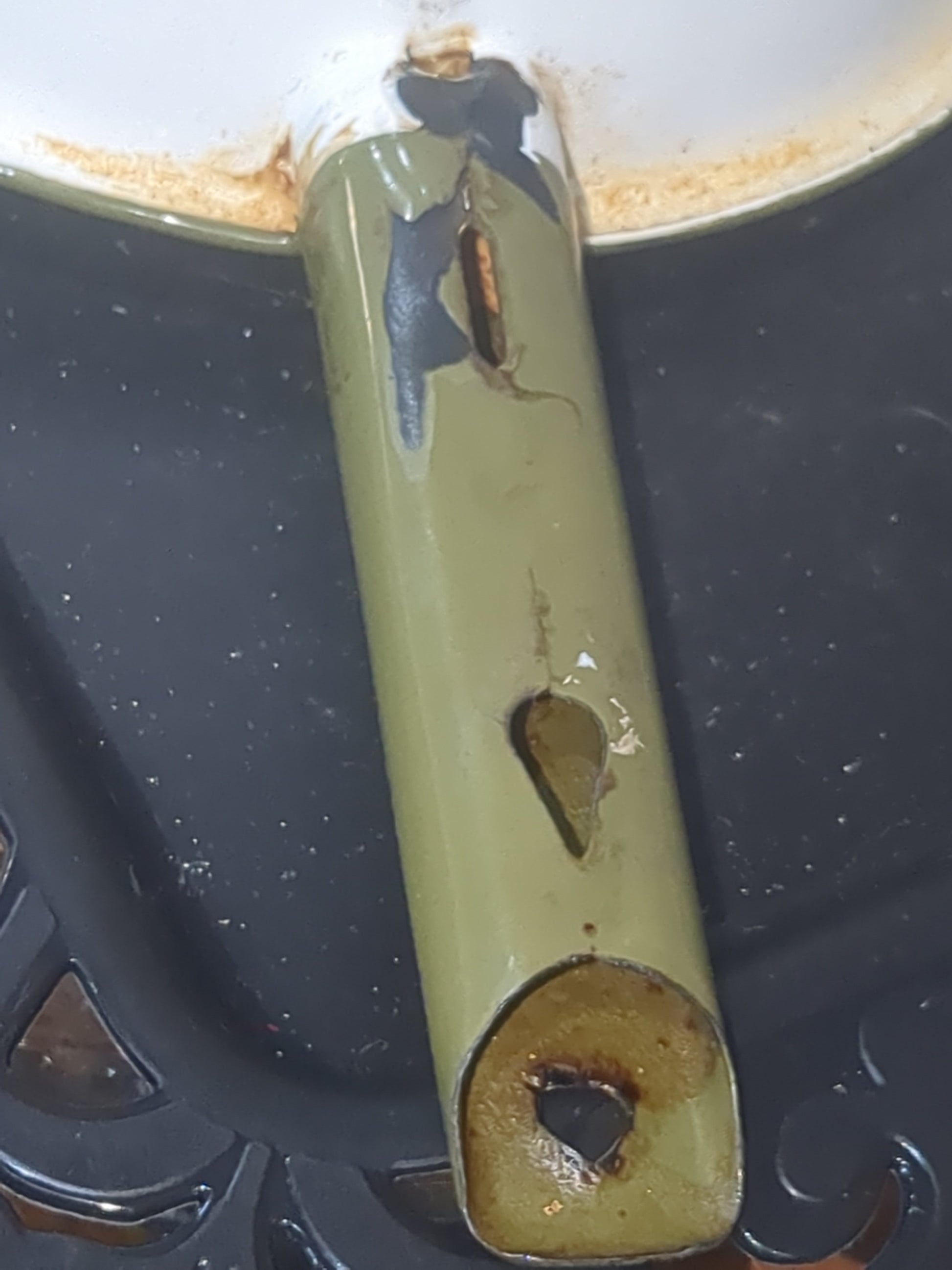 This is a unique colored enamel pot it's white with almost a military green color. it has some patina. it has some areas that have lost its enamel around the rim inside and on the bottom of the handle. It has some rust. Please see photos since these are part of the description.