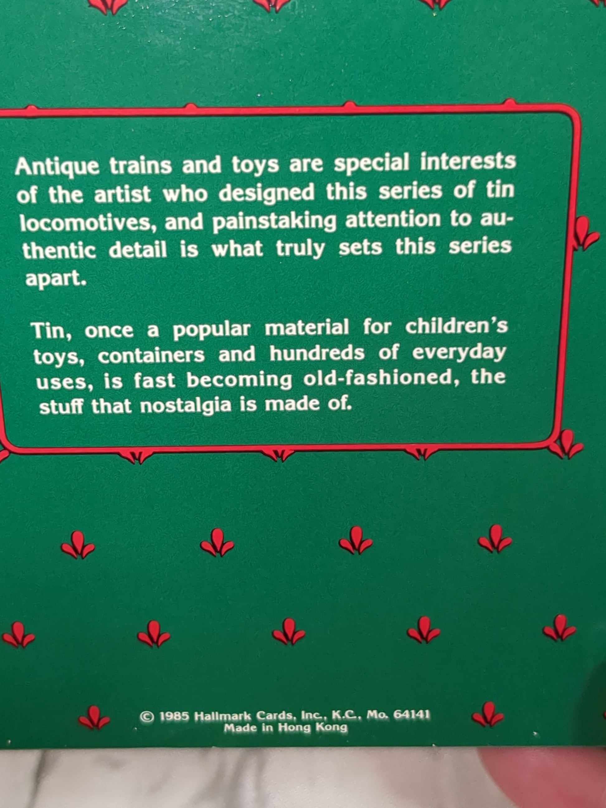 Vintage Hallmark 1985 Tin Locomotive Train Series #4 Christmas Ornament. in very good condition the box has a little shelf wear but good condition. Please see photos as they are part of the description.