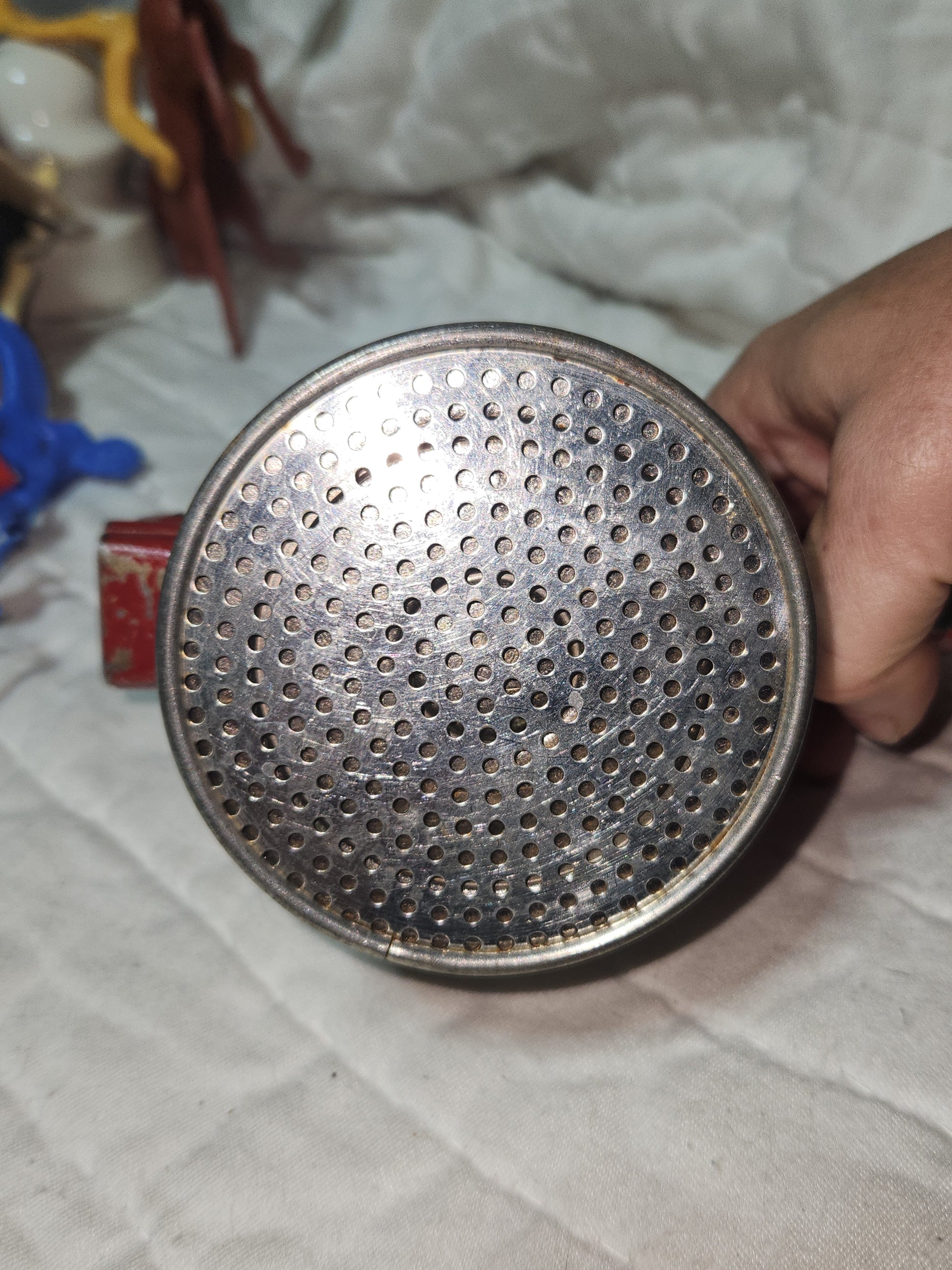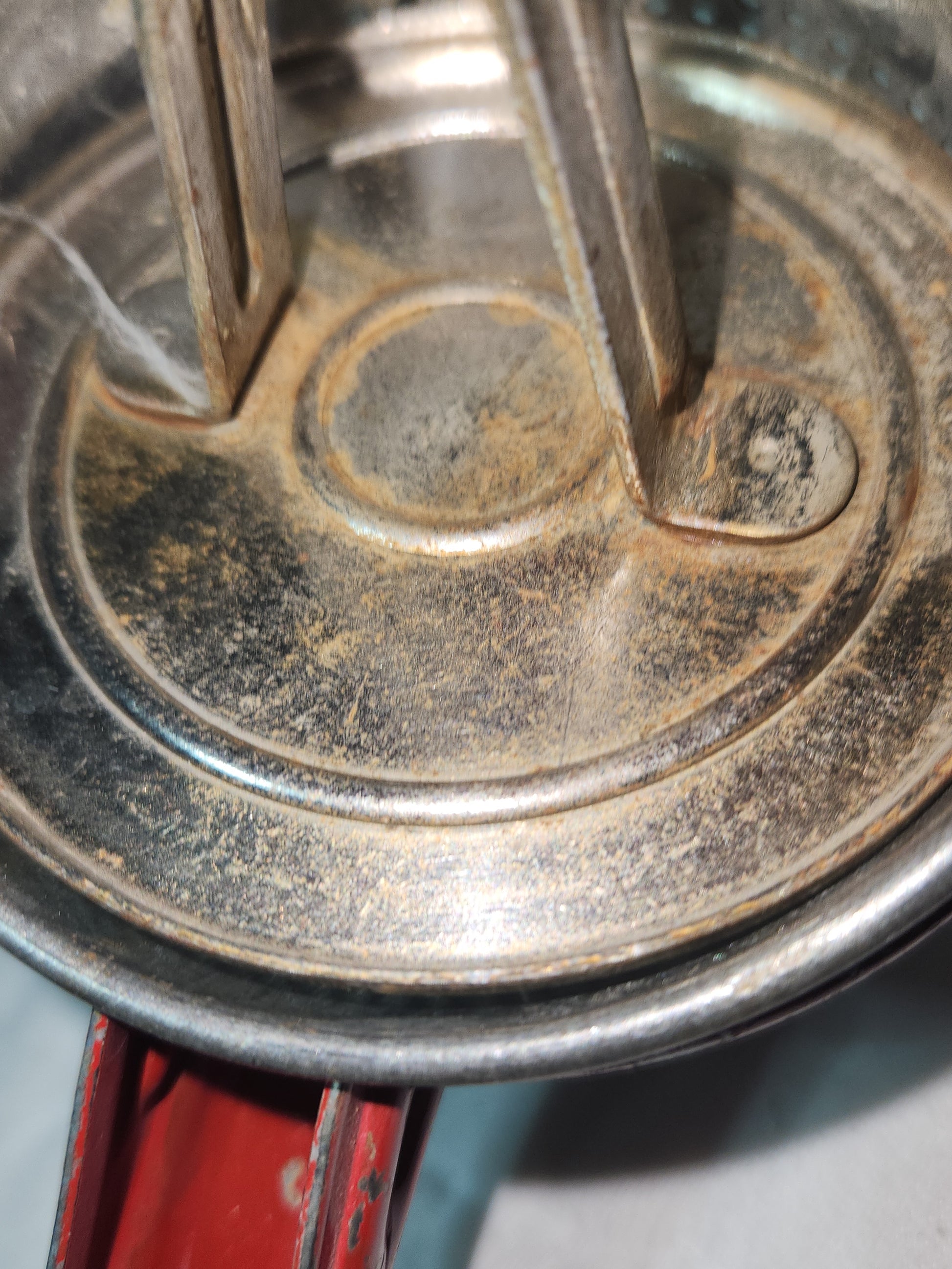 This vintage red handle potato ricer has Handy Things on top on a diamond Lundington Michigan below and made in USA below that. it has some paint loss but I feel that just adds to the character. It is 11" long 3 1/2" diameters. It's really cool piece, great for adding to your vintage kitchen or holiday decorating. Please see photos as they are part of the description
