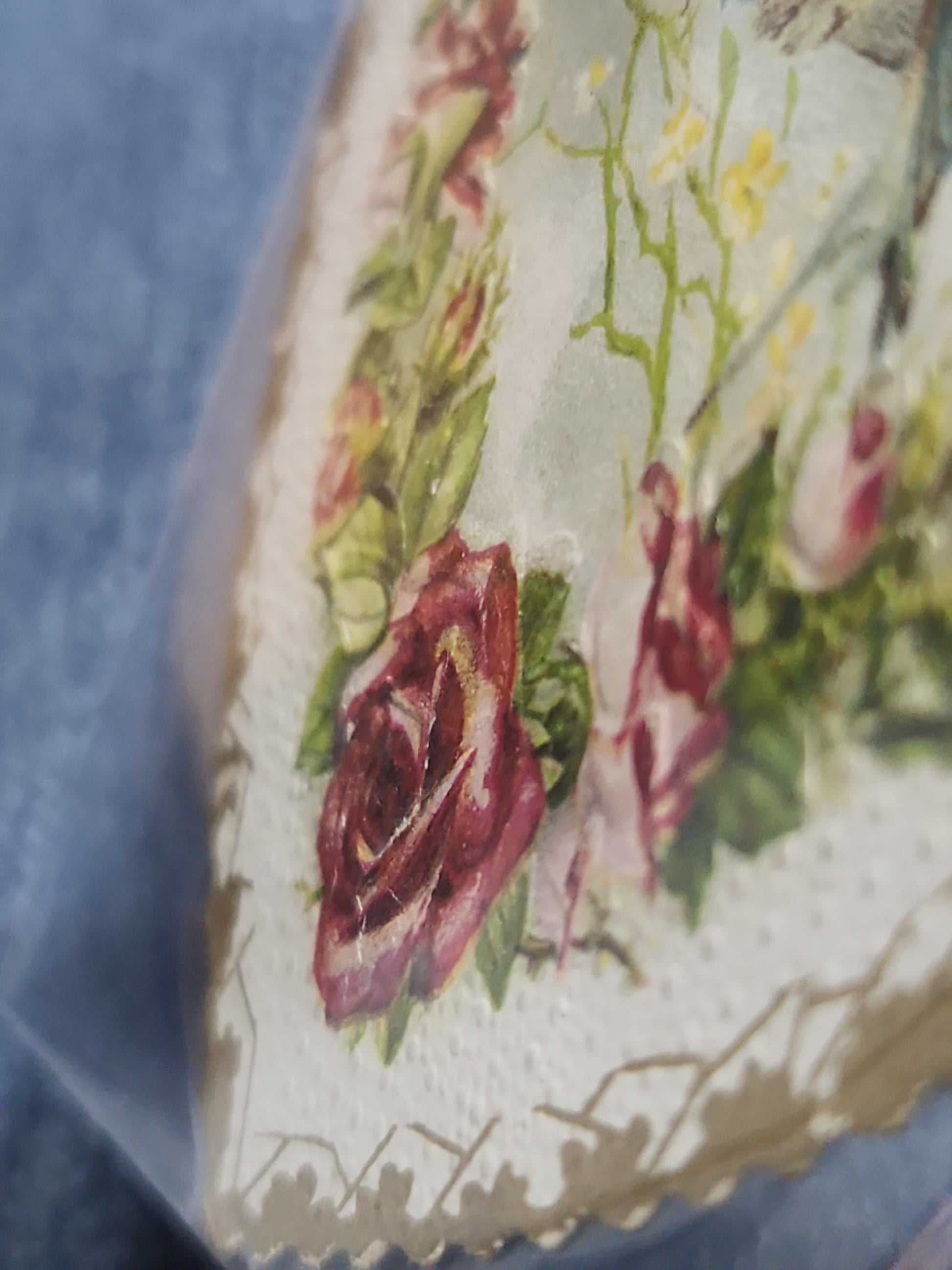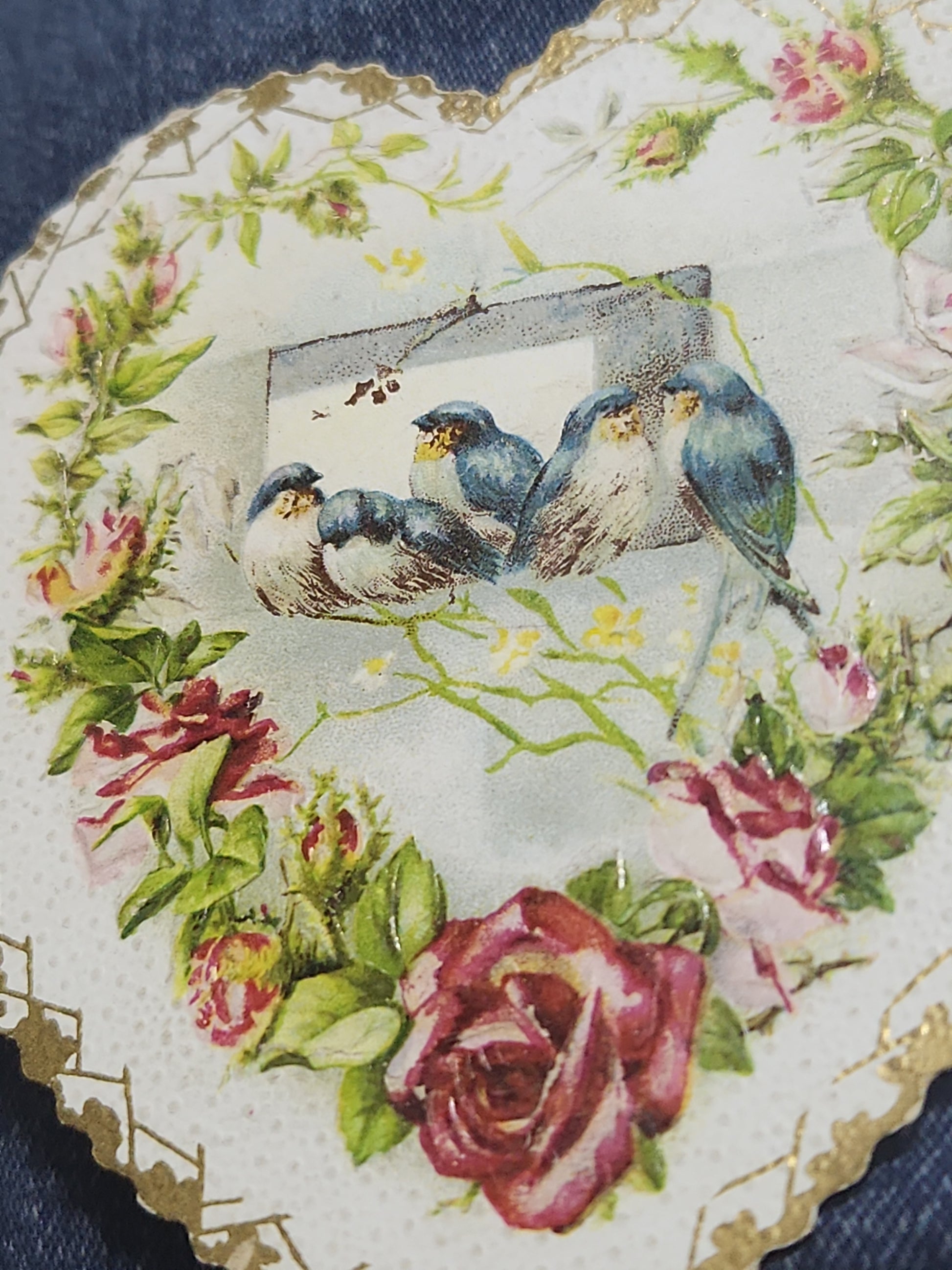Antique Valentine Card Die-Cut Embossed Heart with Birds and Roses