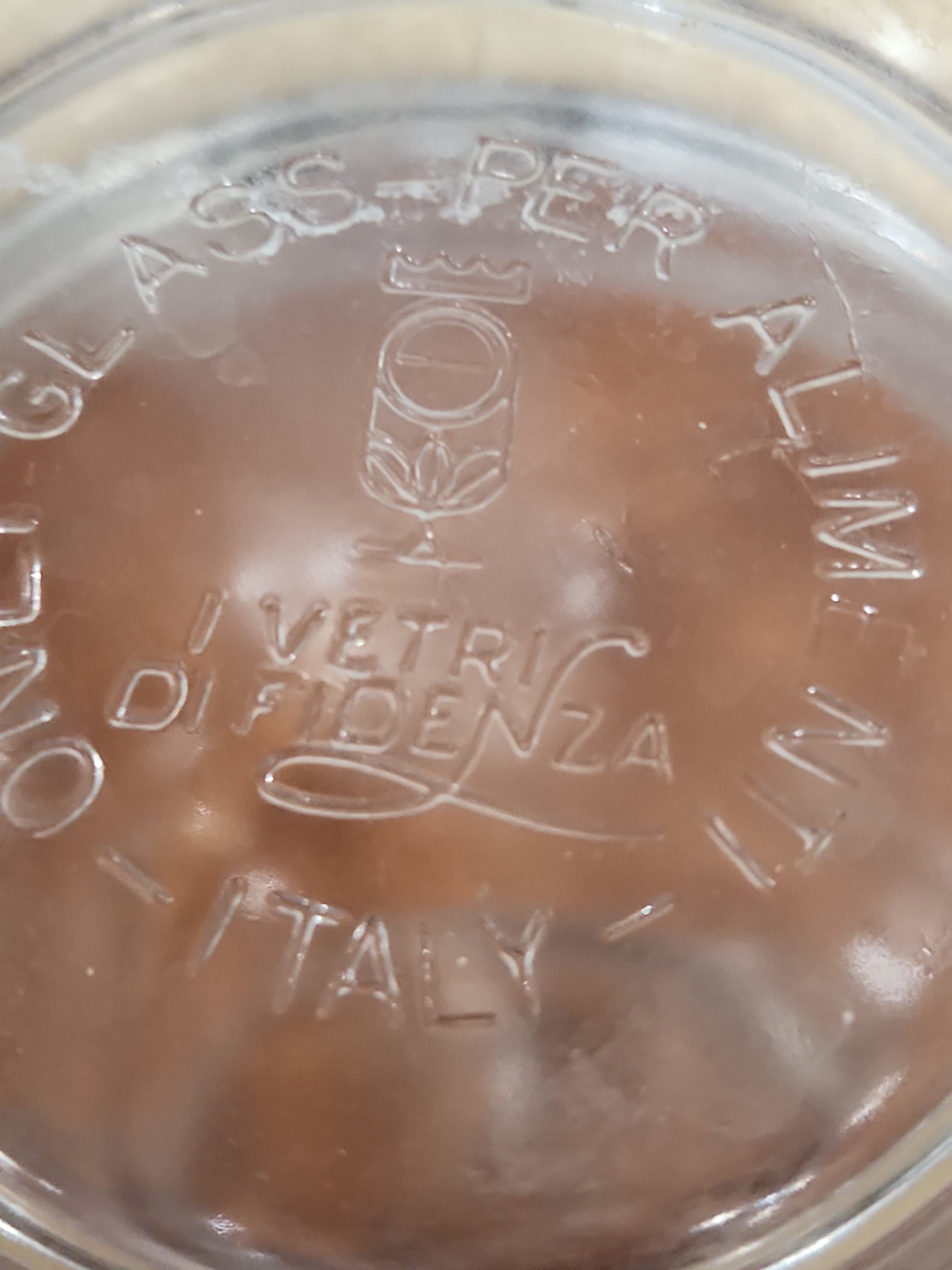 This is a vintage jar with wire bale closing. The bottom has an Embossed 2. The lid says Only Glass - per - Alimenti - Italy. It is in good condition with no chips, cracks or major scratches. It does need a better cleaning than I gave it. The seal is brittle and has one area broken. Please see the photos as they are part of the description.