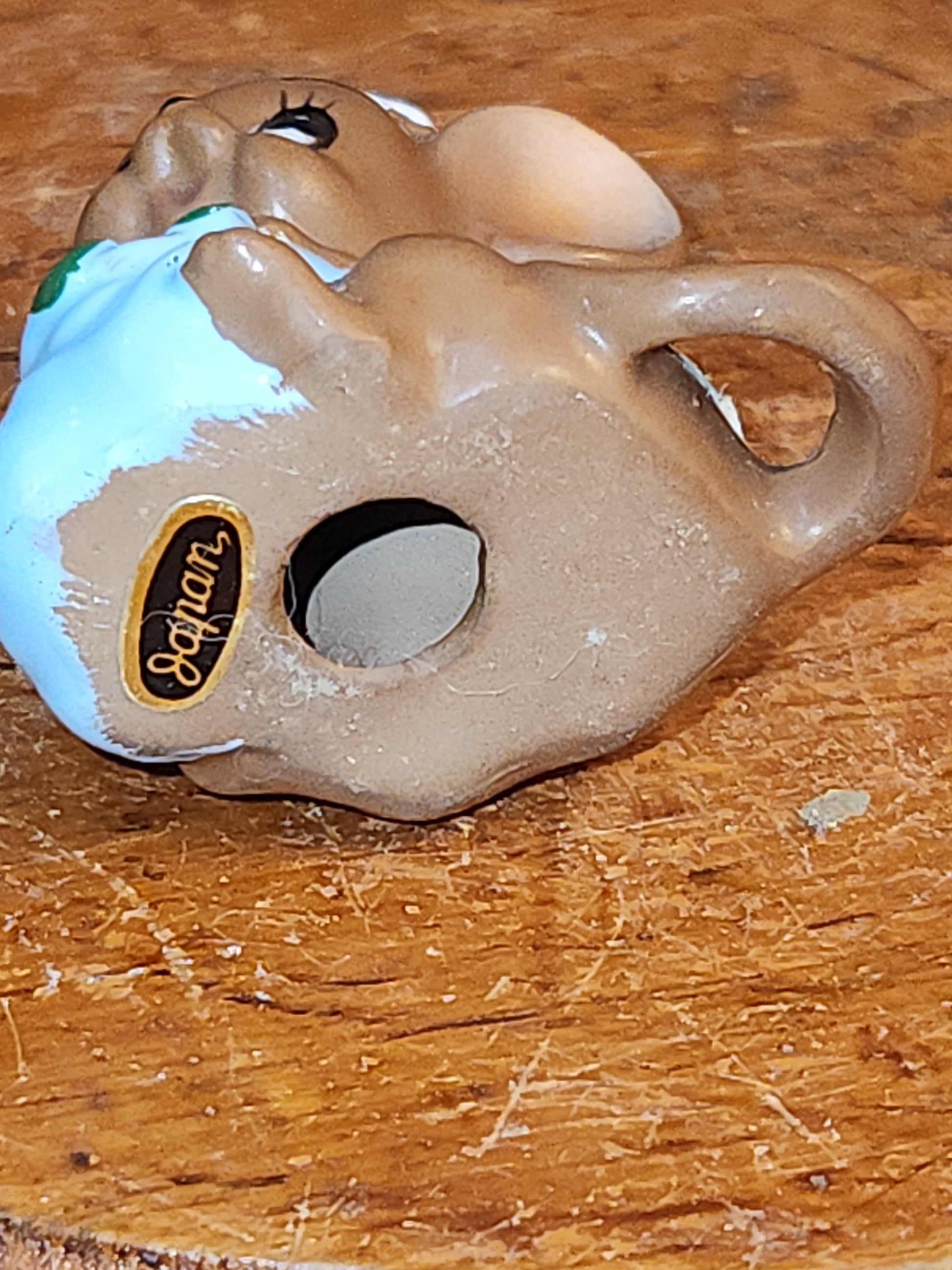 This Mouse is in good condition. I see nothing missing, no cracks, no chips. There is a tiny spot of paint loss on the white in his hat m, and his blue bag and a scratch on his back, all very minor. He has a Japan sticker as well as maker sticker. Please see photos as they are part of the description