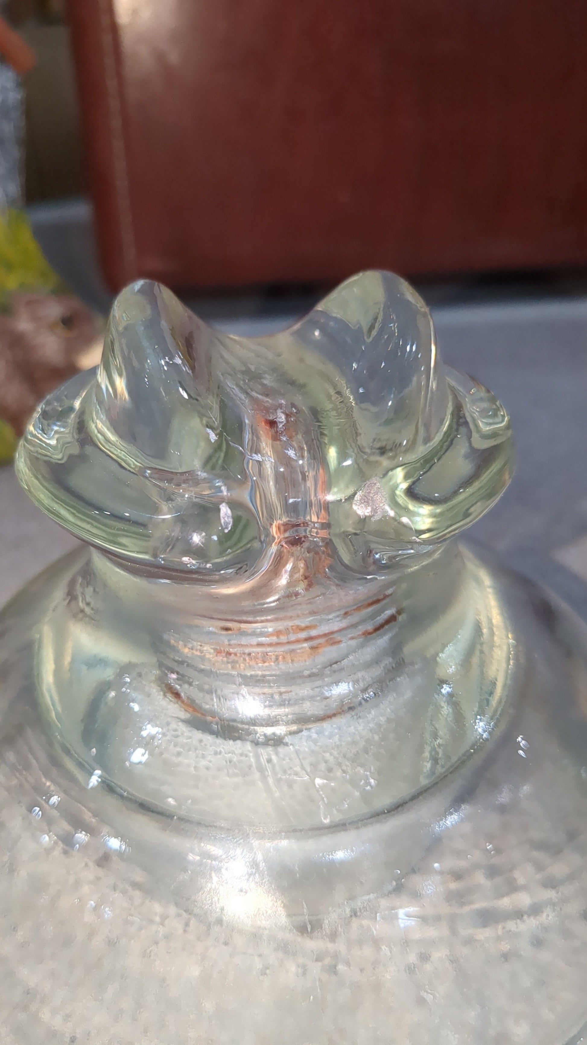 Vintage Kimble 830 clear tempered glass insulator 10-56 Made in USA. In good condition, but needs cleaned. I do not see or feel any major chips or cracks, there in one flea bite at the bottom outside rim. Please see photos as they are part of the description.