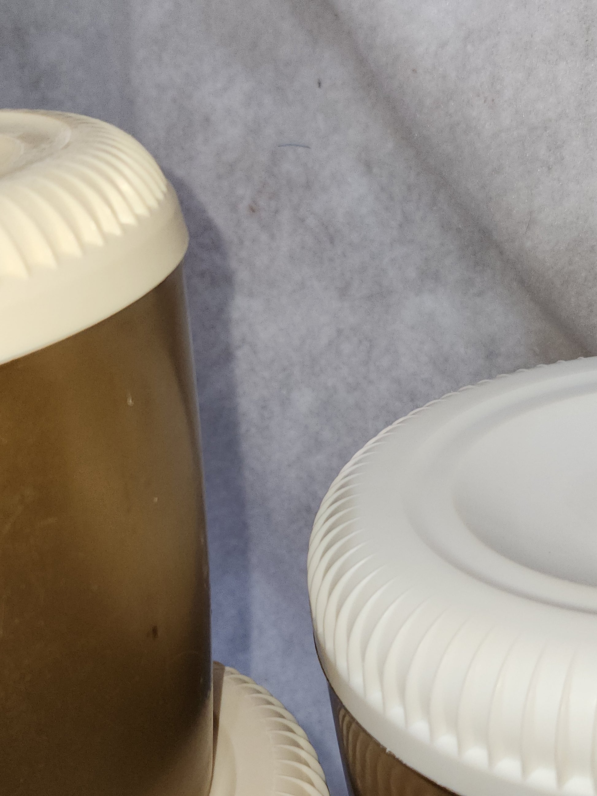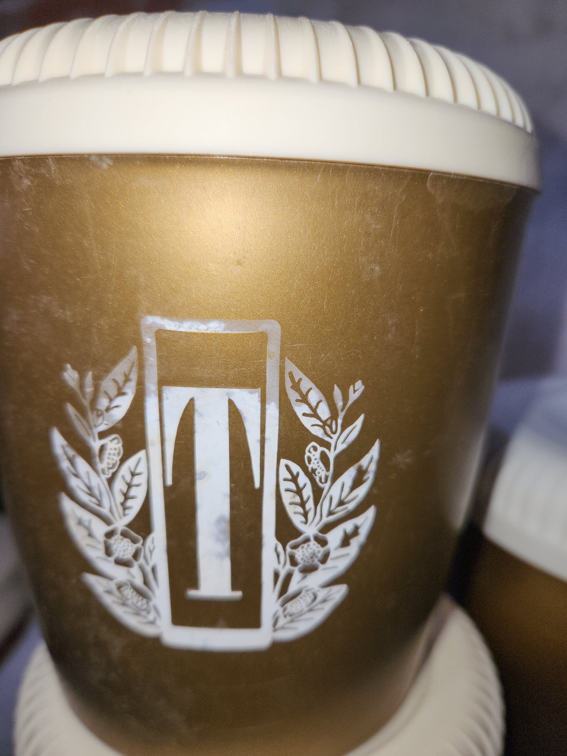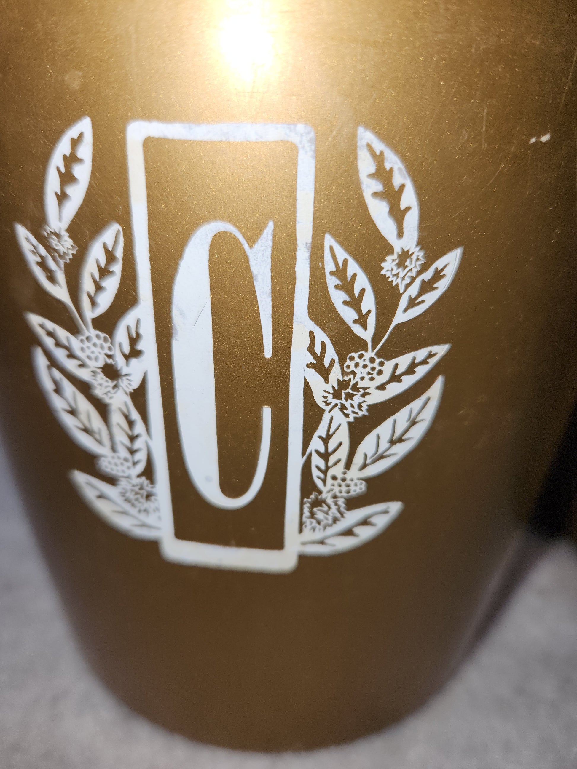 This set condenses down to fit into largest canister. A light bit of fading of the font on front. The two smaller lids area but more yellowed than the biggest one. Please see all photos as they are part of the description.