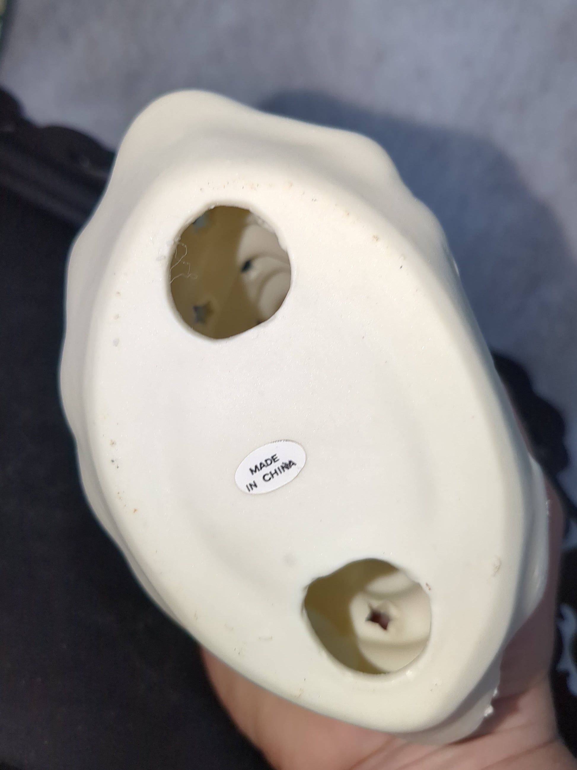 This white Christmas tree is in it's original box from World bizarre Incorporated. it is in very good condition I don't see any chips cracks or paint loss. Put a tea light candle on the inside for beautiful glow through the cutout Stars. The box has shelf wear and has writing on the front. Please see the photos as they are part of the description