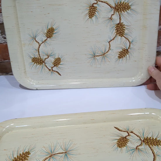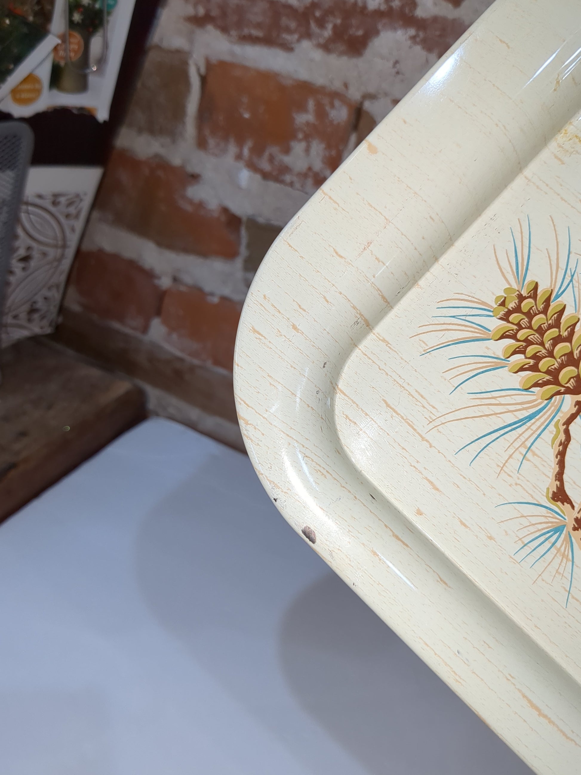 Vintage MCM Turquoise, brown, cream, buttery yellow Pine Cone Metal Serving Tray