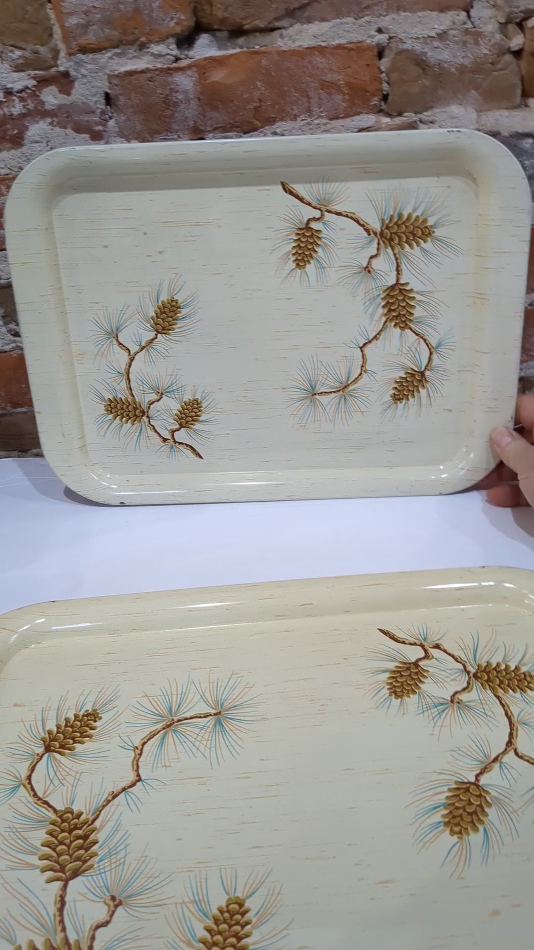 Vintage MCM Turquoise Pine Cone Metal Serving Tray. It is almost 15 in long and almost 11 in high. This is for one tray we will pick at random for you, you may not get the one pictured, but it will be good quality without any major issues all of them have a little paint loss on the edges please see the video and please see the pictures each of them has at least two spots of it we think it just adds to the character. We do have several so if you're wanting more than one add it to the cart we do a just shipping if our website does not do it for you