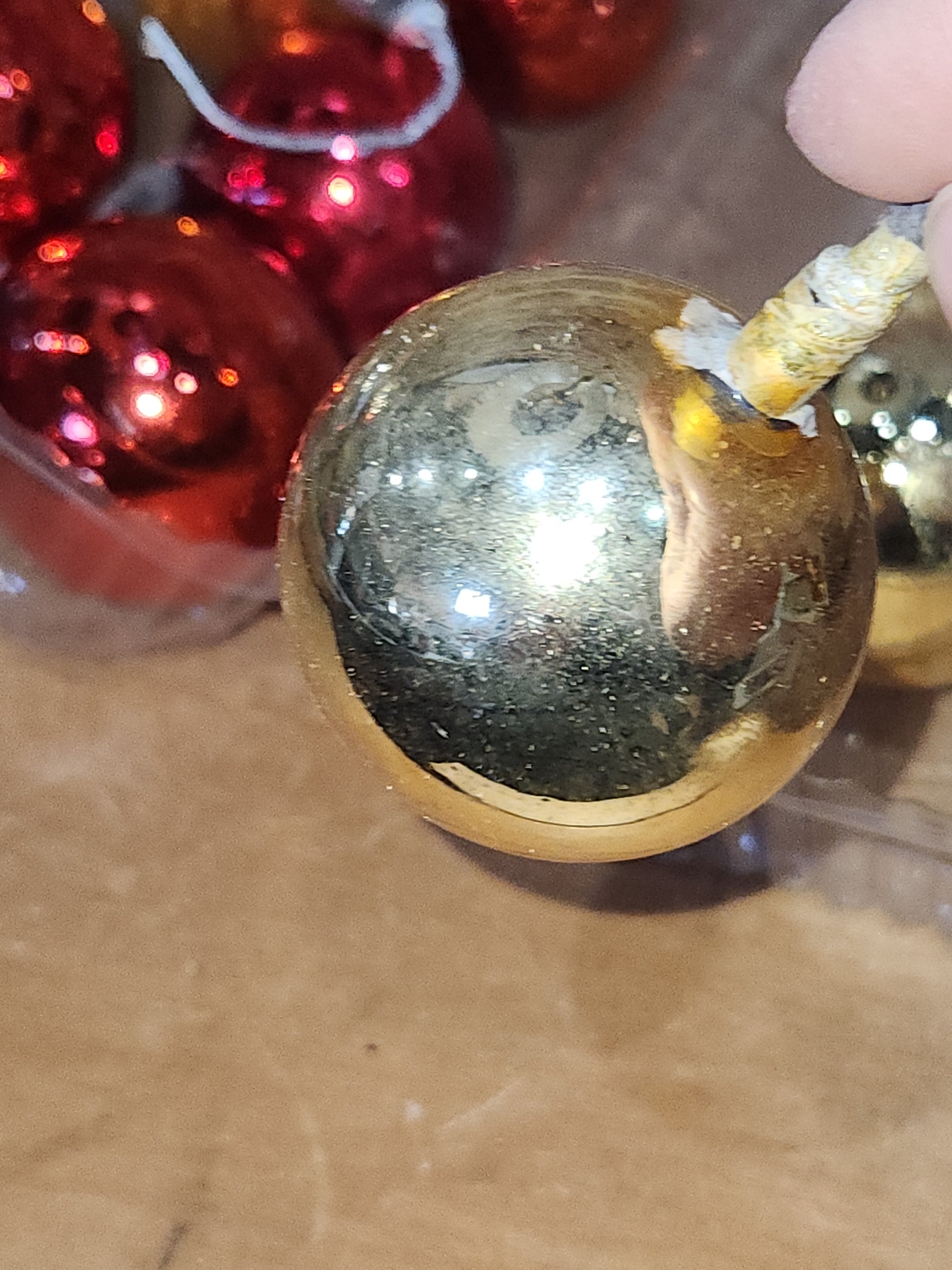 This set of 7 ornaments is in fair condition with no chips or cracks seen. The gold are a fraction bigger 1 15/16" and the red are 1 14/16th. The ornaments all have areas of paintloss and discoloration. Some of the picks have foil that is unwinding or missing. Whrn buying old ornamanets please know you will likely have ornaments with spots of paintloss and or discoloration. We do not send broken, chipped or cracked ornaments, unless it is a small but stable crack under the cap. Please see photos as they are part of the description