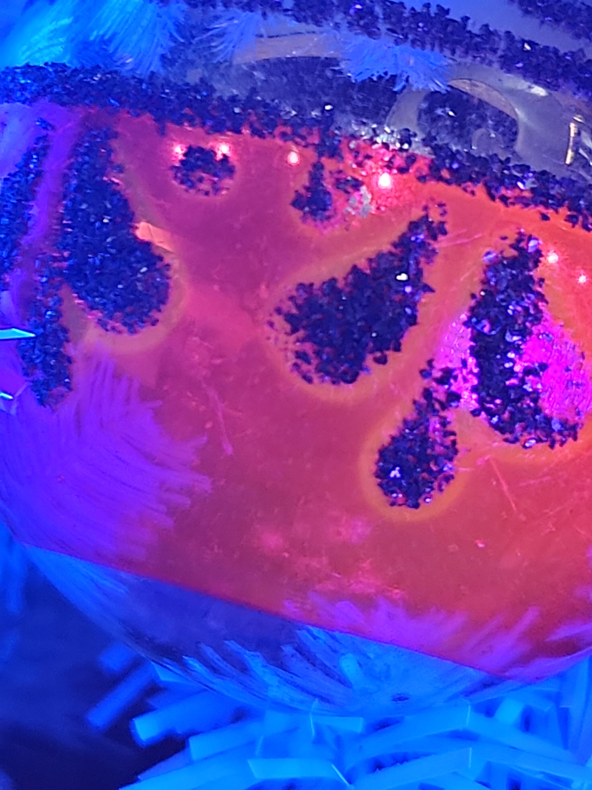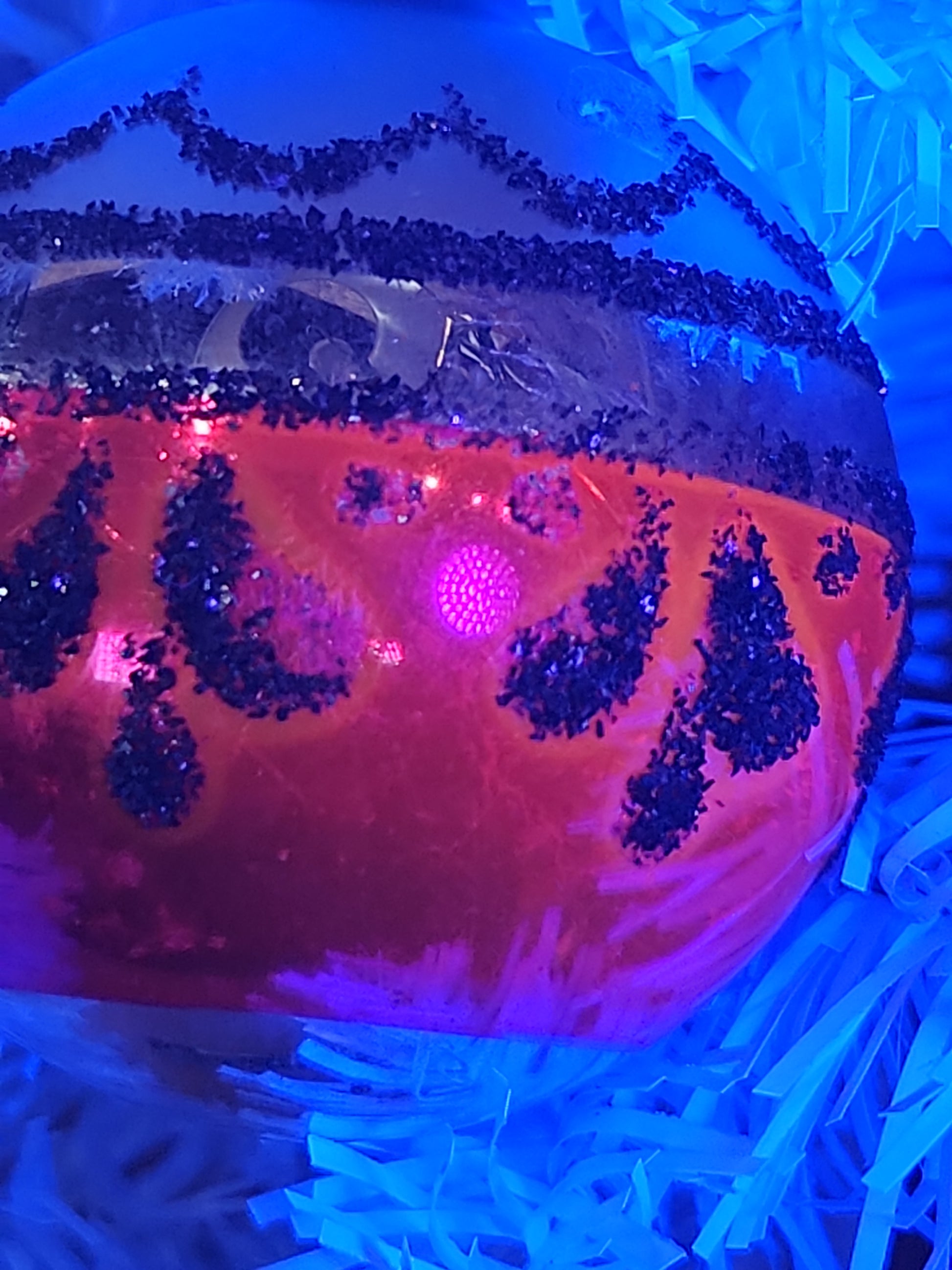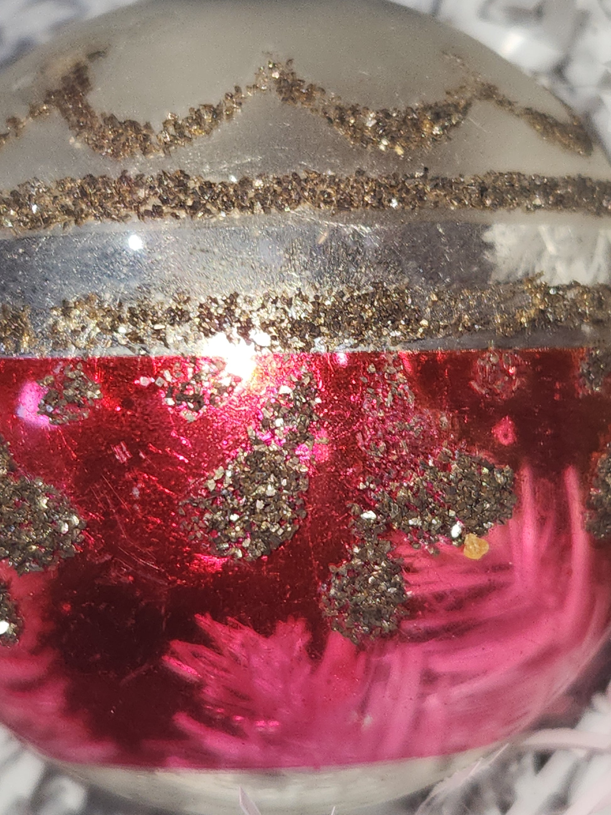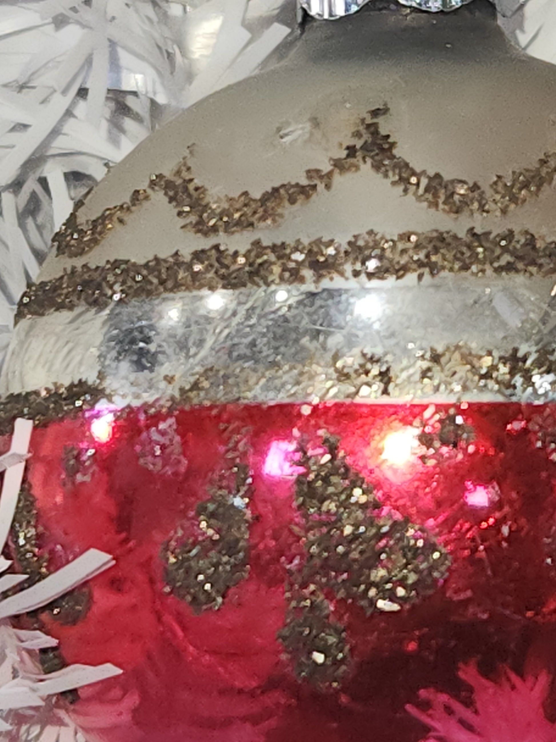 The ornamanet is in just fair condition. The colors have faded a bit. There are areas of discoloration i took photos of. Many areas of mica have worn off. It has a cap that says Shiny Brite Made in U.S.A, but i cannot gurantee it is shiny brite. It is 2" in diameter. The pink glows a vibrant pink orange under UV light When buying vintage ornaments, you may be getting discoloration, paint loss, crazing, please be aware of this before ordering. Please see photos as they part of the description.