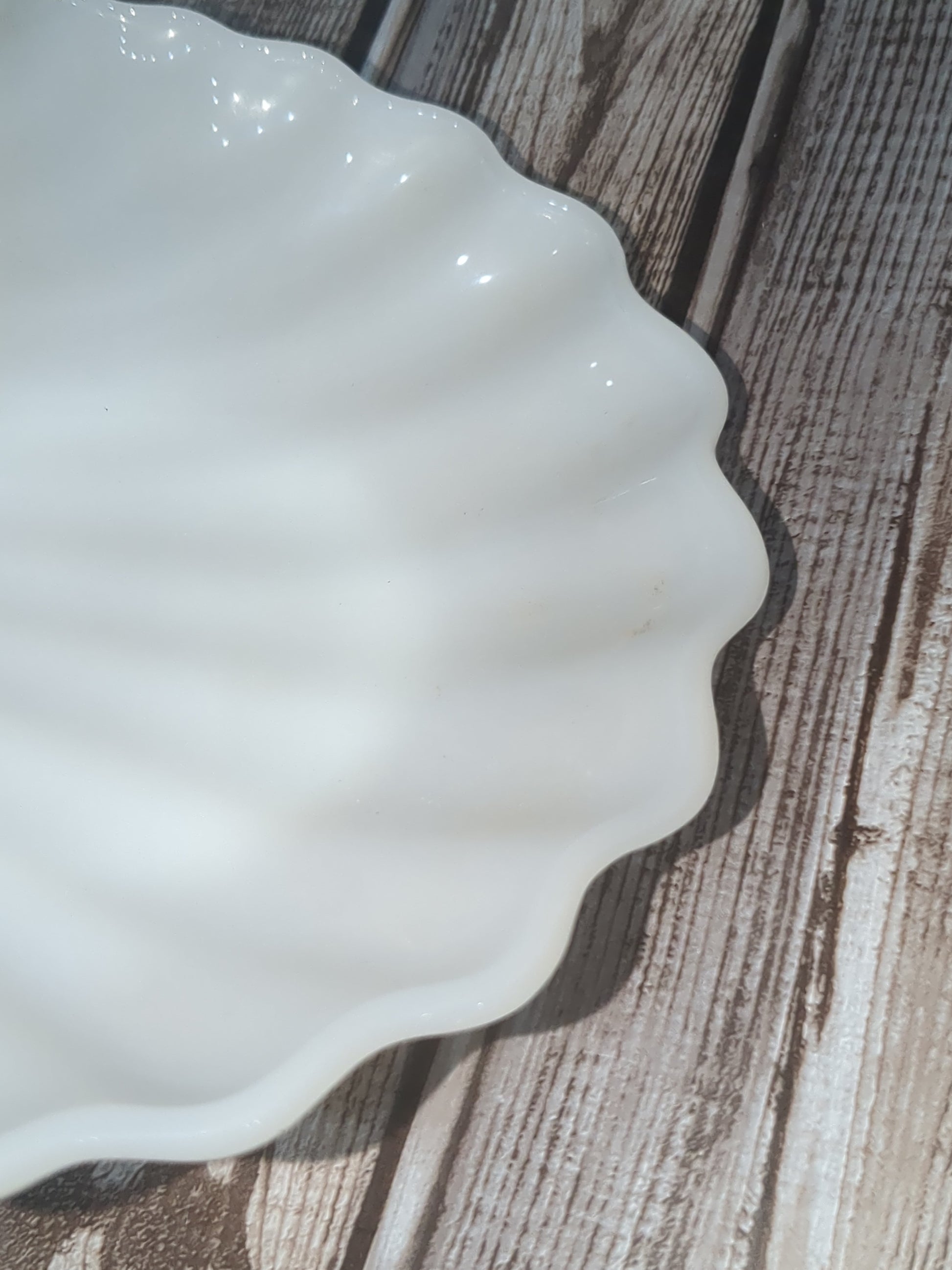White milk glass shell trinket dish or soap dish or catch all dish has a little lip to hold it is in very good condition no chips no cracks no discoloration.