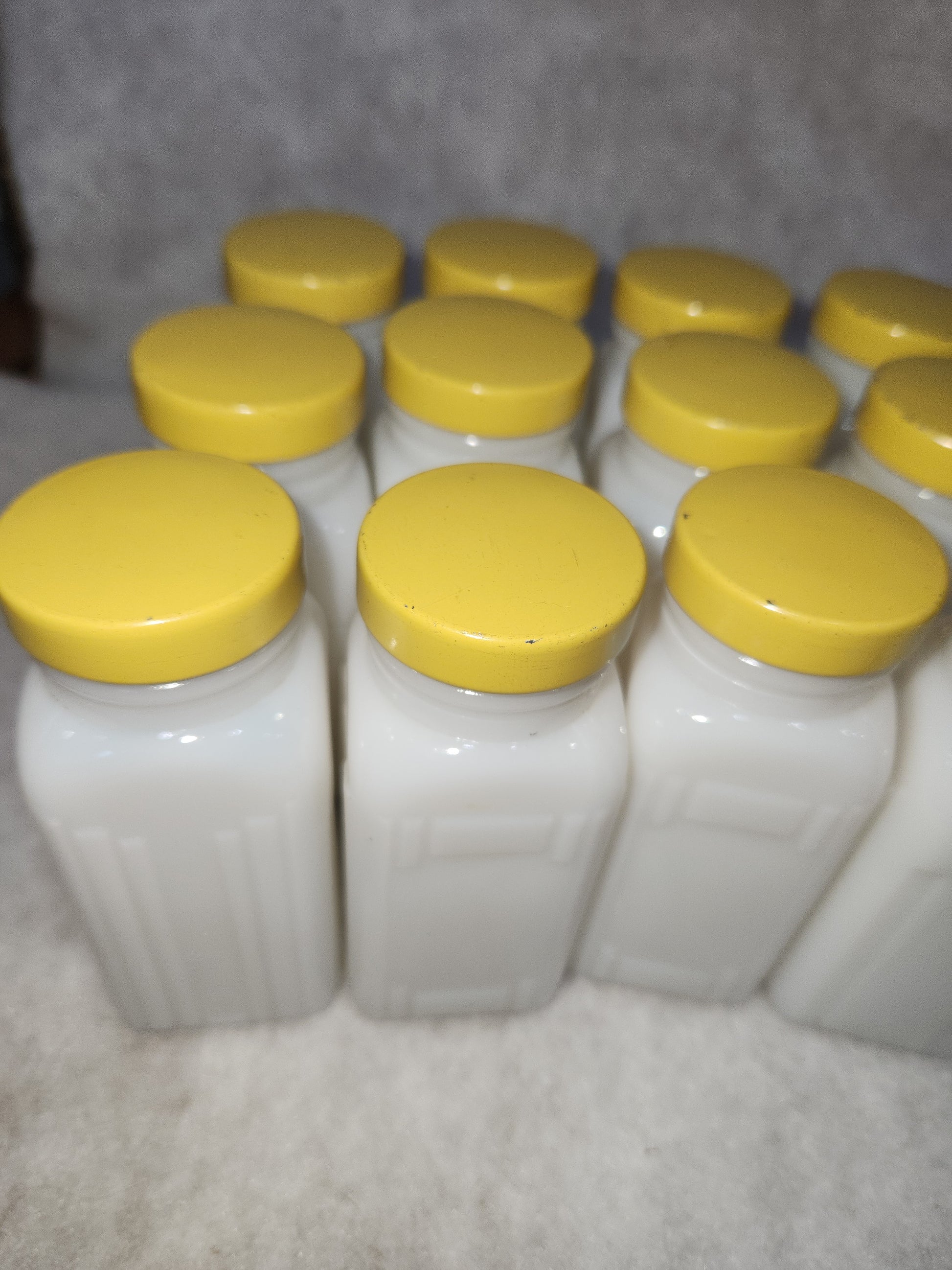 Vintage Milk Glass Spice jars Set Of 12 yellow lids mg78