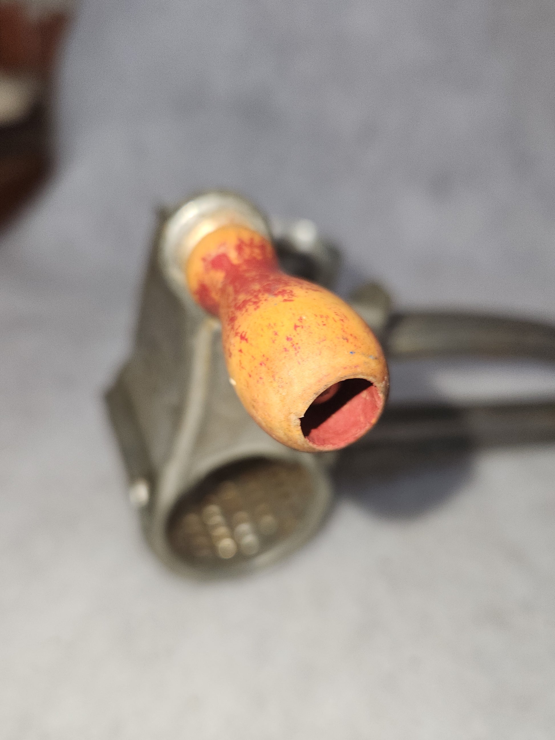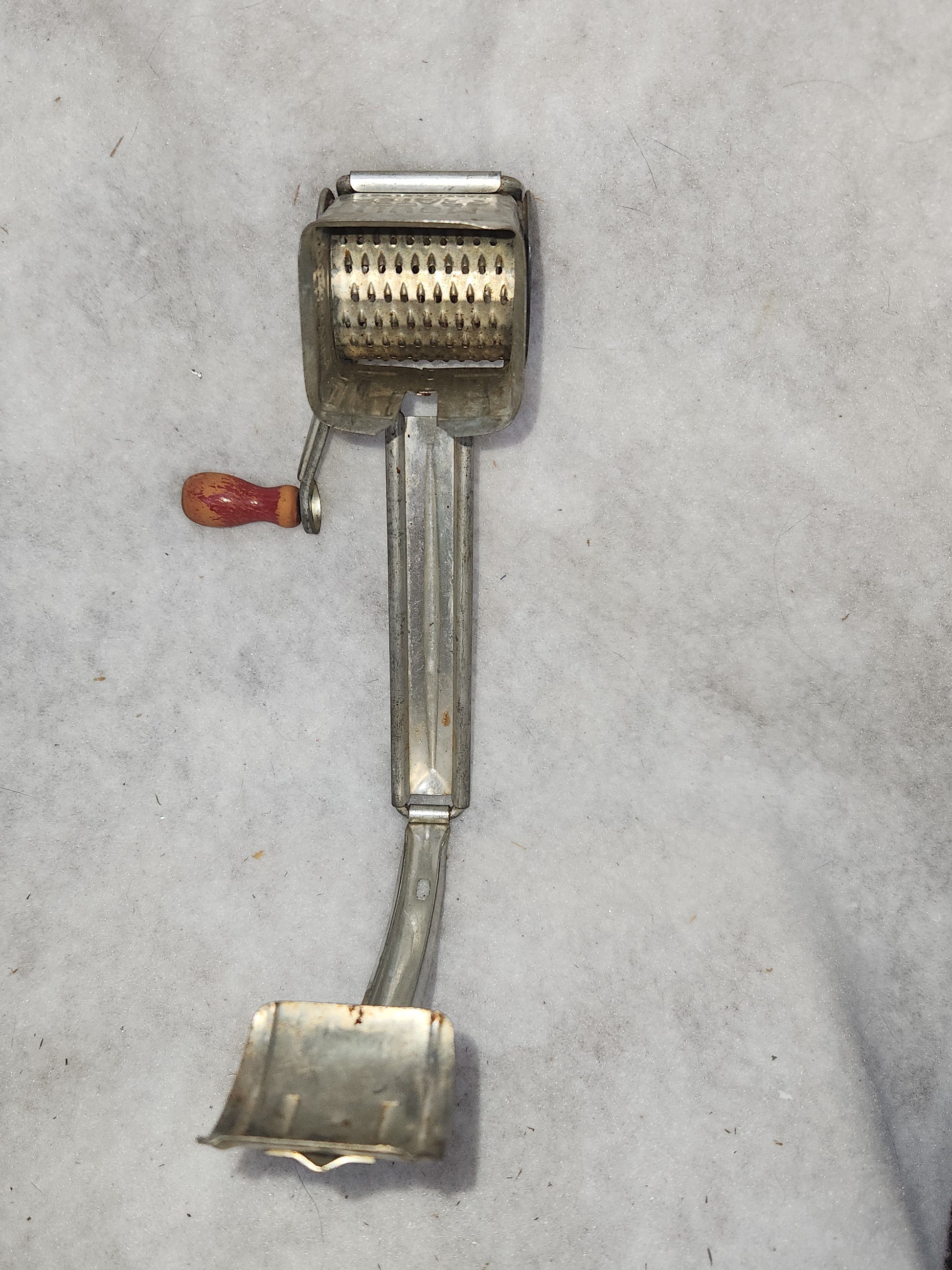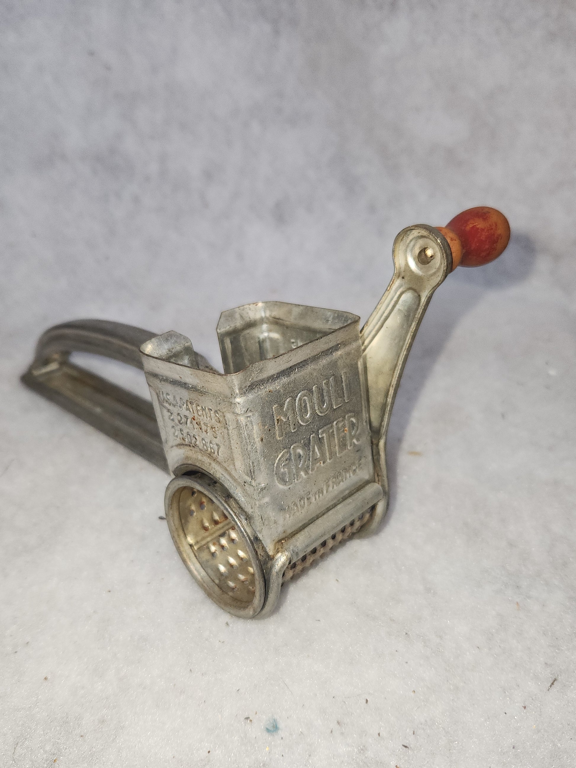 This grater is a great piece for vintage kitchen decor. It says made in France on the front. It does turn. It has patina and just a touch of rust. The barrel can come out so you can witch the handle to use right handed or left handed. The knob has a bit of red left, mkst is faded. Please see photos as they are part of the description..