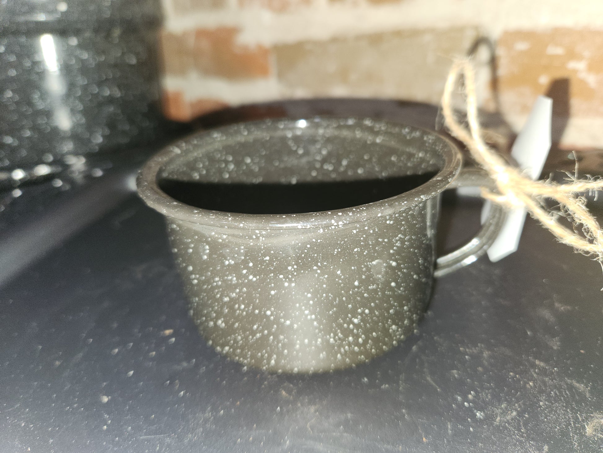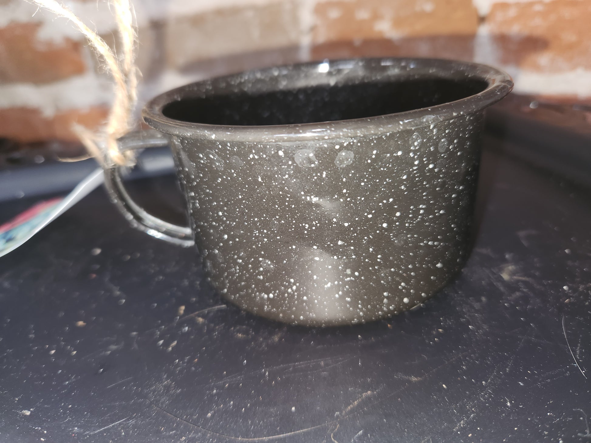 Vintage or vintage looking Black Enameled Cup with White speckles enm3