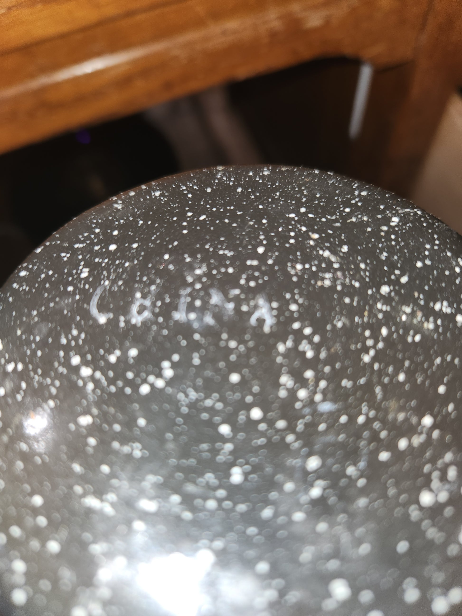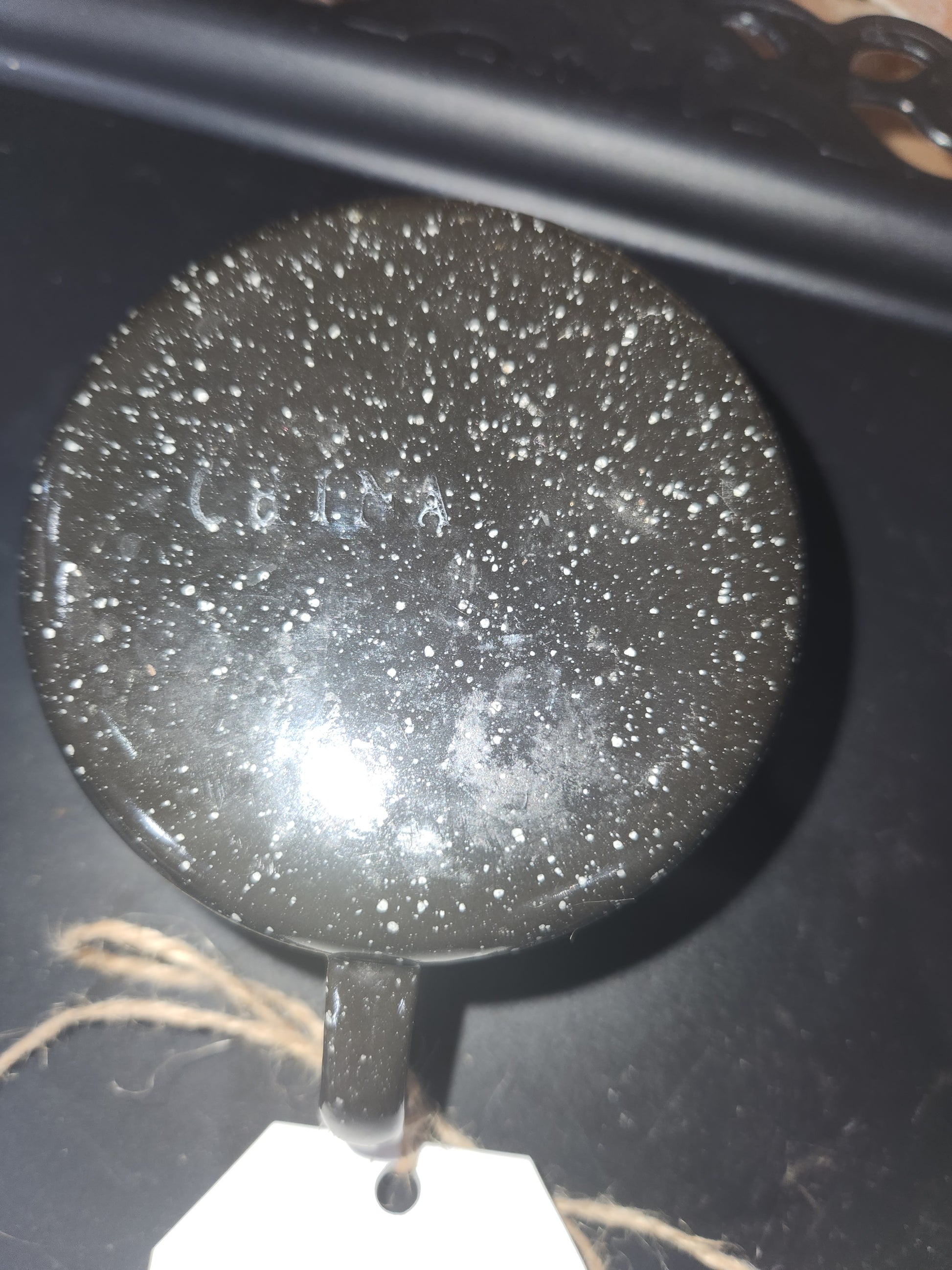 This is a vintage black enamel cup with white speckles. It is 4 inches in diameter from outside rim to rim. It is 2 1/4" deep. It has the word China stamped in the bottom. It does not have any enamel removed that I can see and is in pretty good condition.