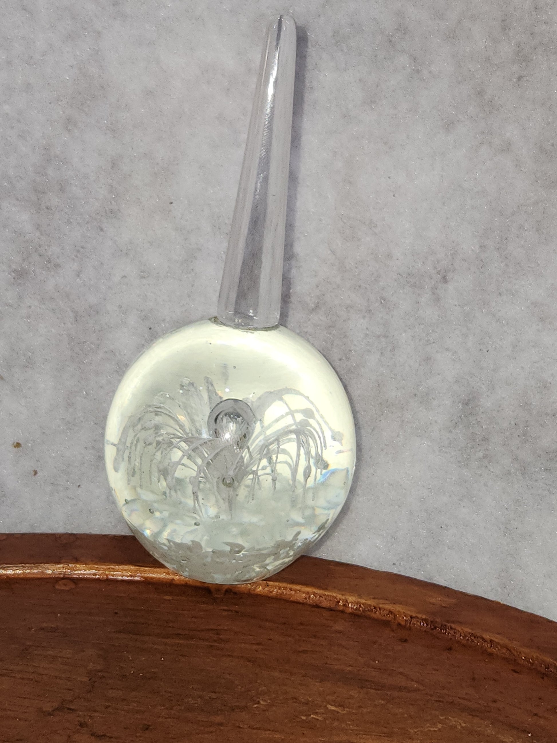 This glass paperweight has a stem on top for rings. It is good condition with no chips, cracks or major scratches. It has 2 bubbles, in the photos i use a pen to point to the bubble as you can see from the side, it is not showing as a chip in the glass, just bubbles. It is nearly 5 inches tall. Please see photos as they are part of the description.