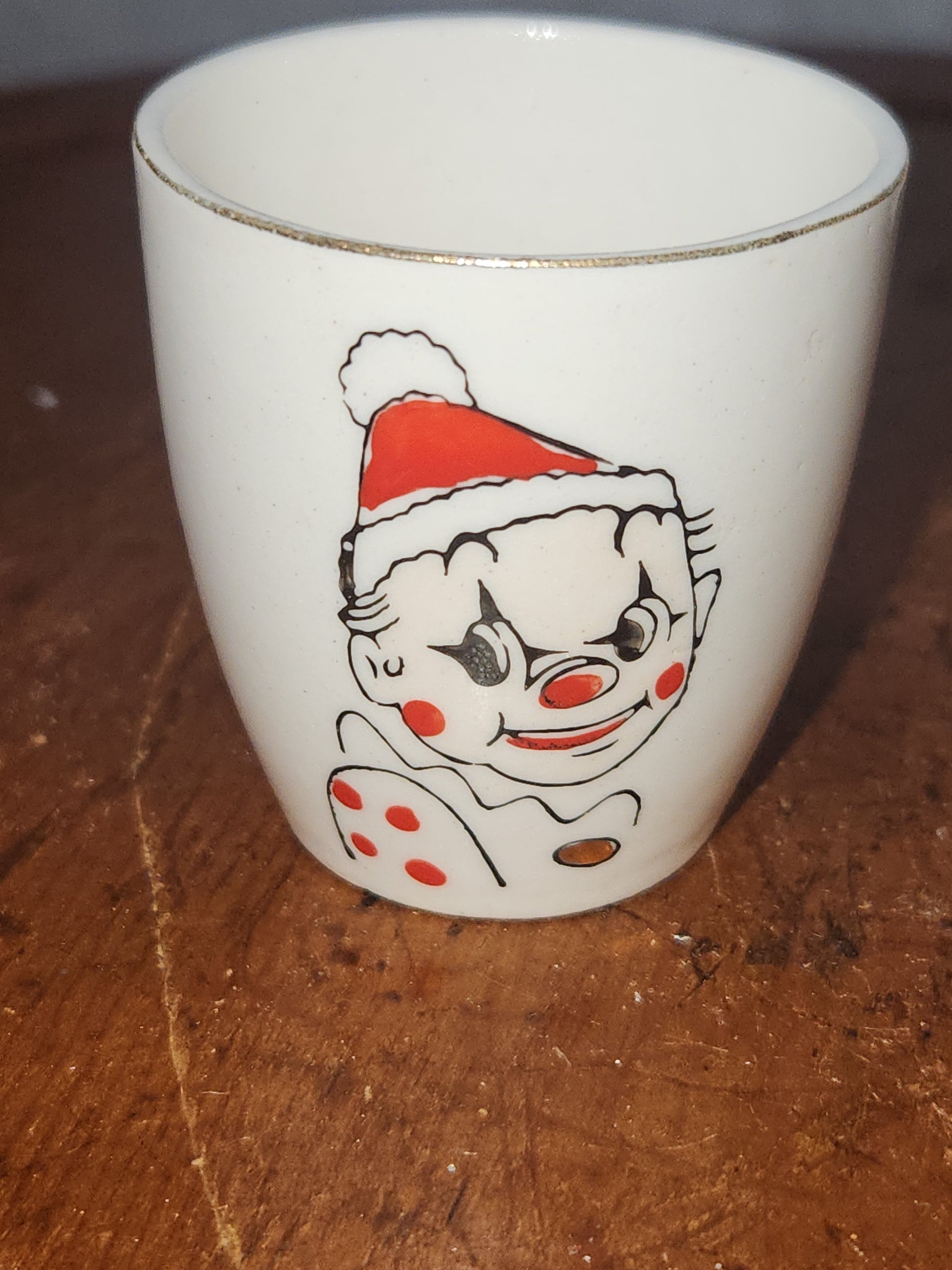 This is a set of six vintage clown shot glasses. They are 2" tall. They are in good vintage condition. They all have their Japan sticker on the bottom. There is minor paint loss on a few, the clowns are missing a little segment from their hats. No cracks no chips. Please see all photos as they are part of the description.