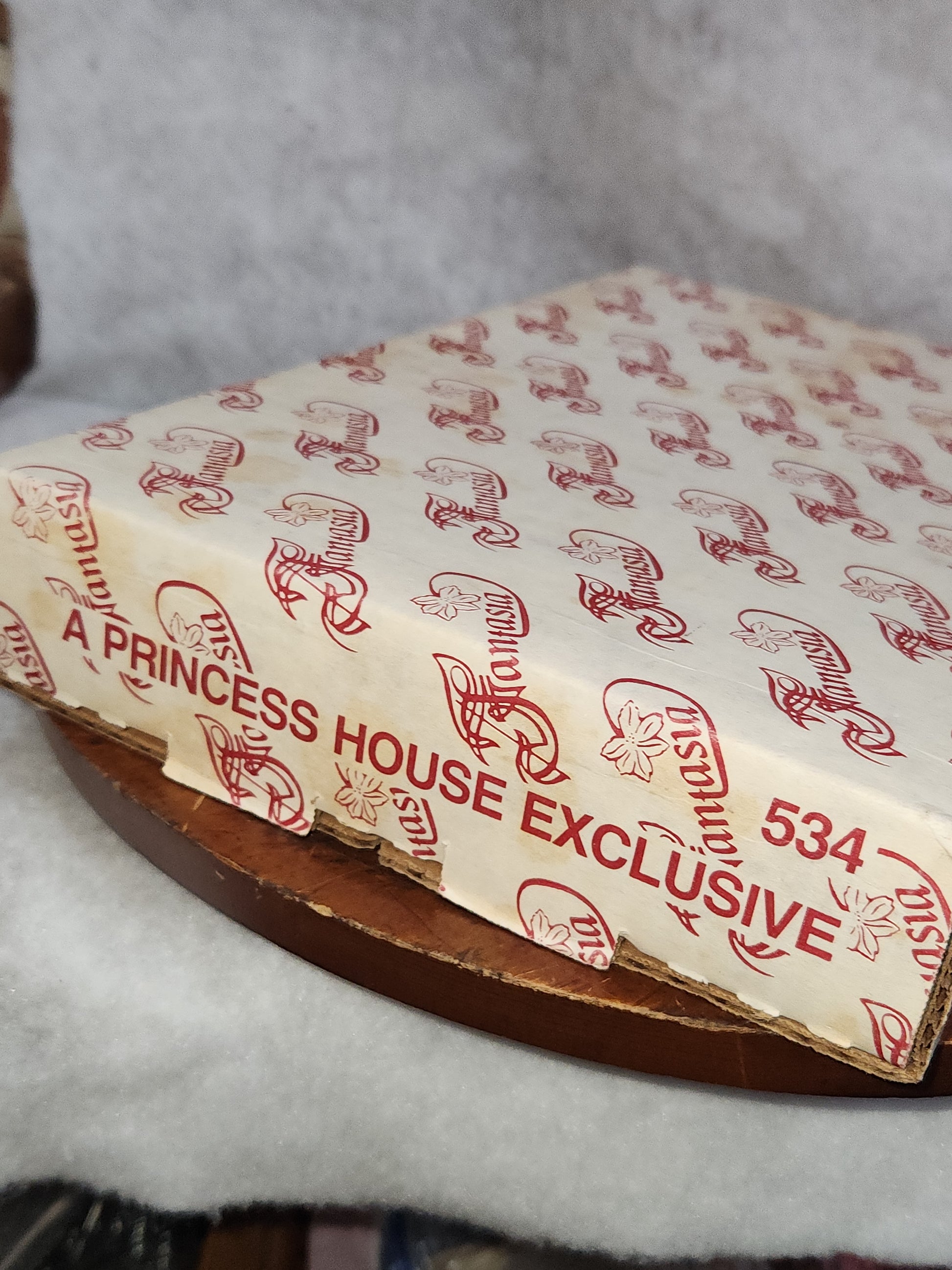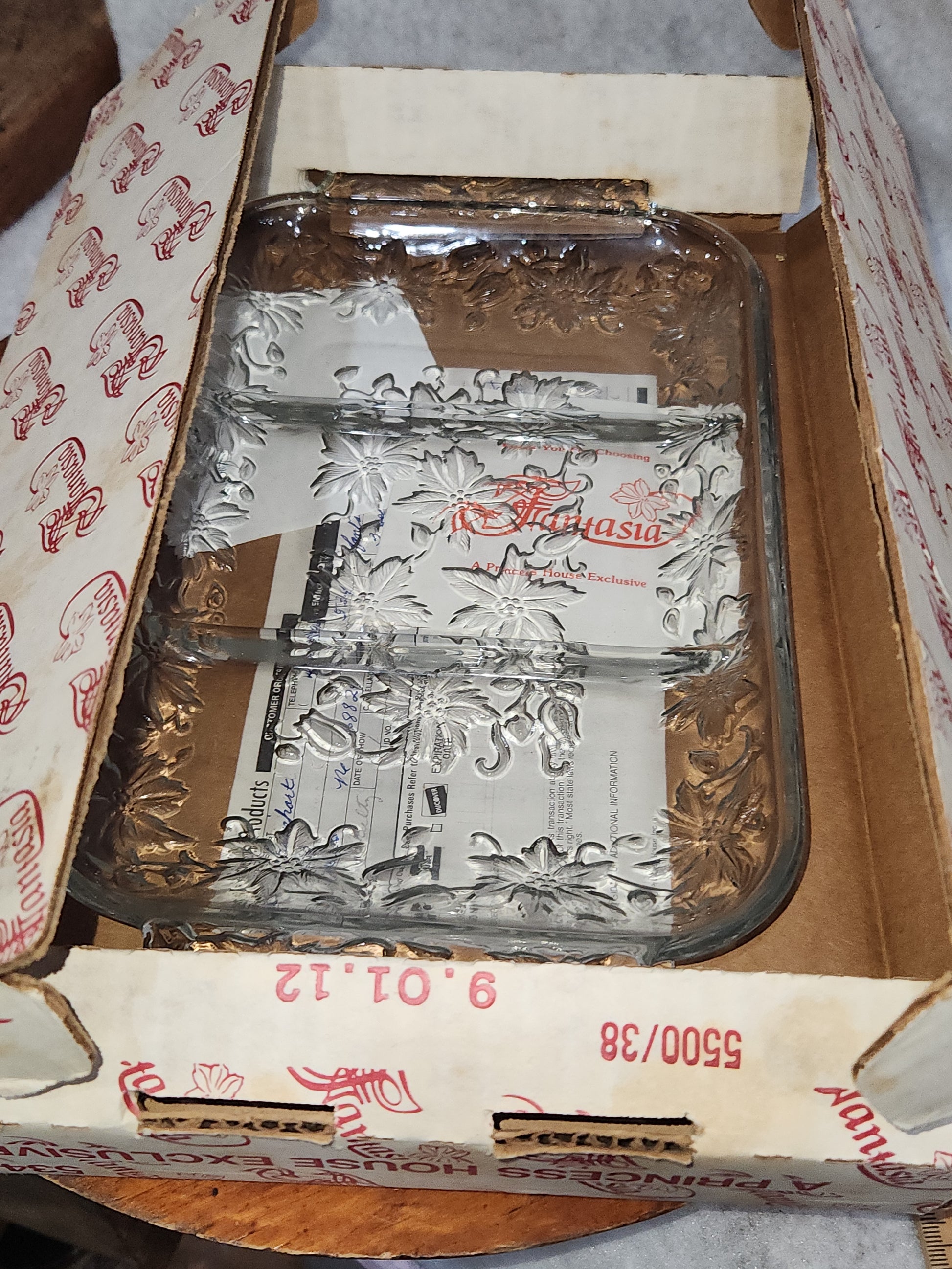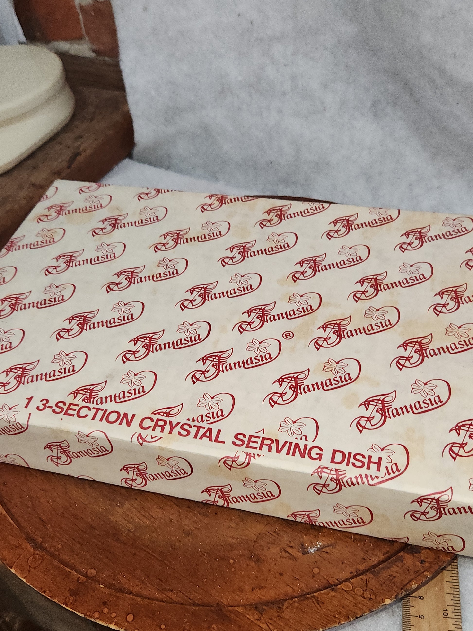 This piece is gorgeous. It is in original box with purchase receipt from Princess House Products. The box is intact with shelf wear and it seems dirty, but may be the design of the box, since it is over the entire box. I see nothing wrong with it and it may have never been used. No chips, no cracks, no scratches. It is 12 1/4" long and just over 7" long. Please see photos as they are part of the description.