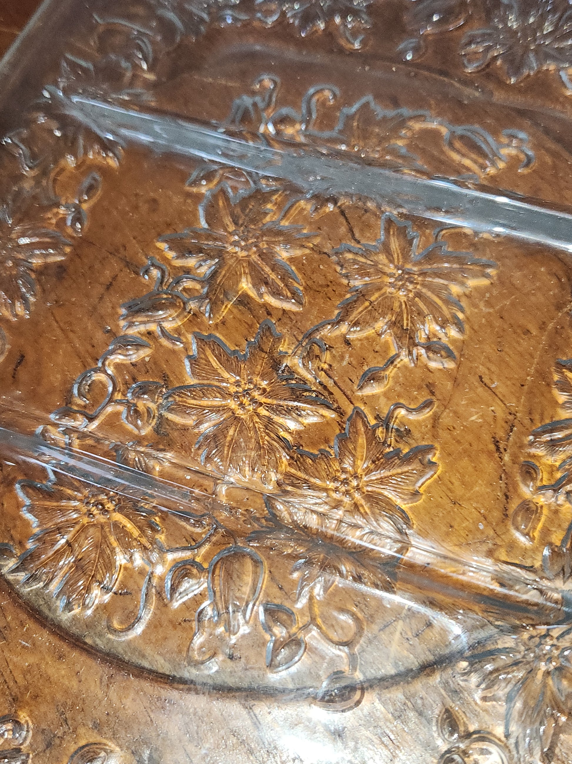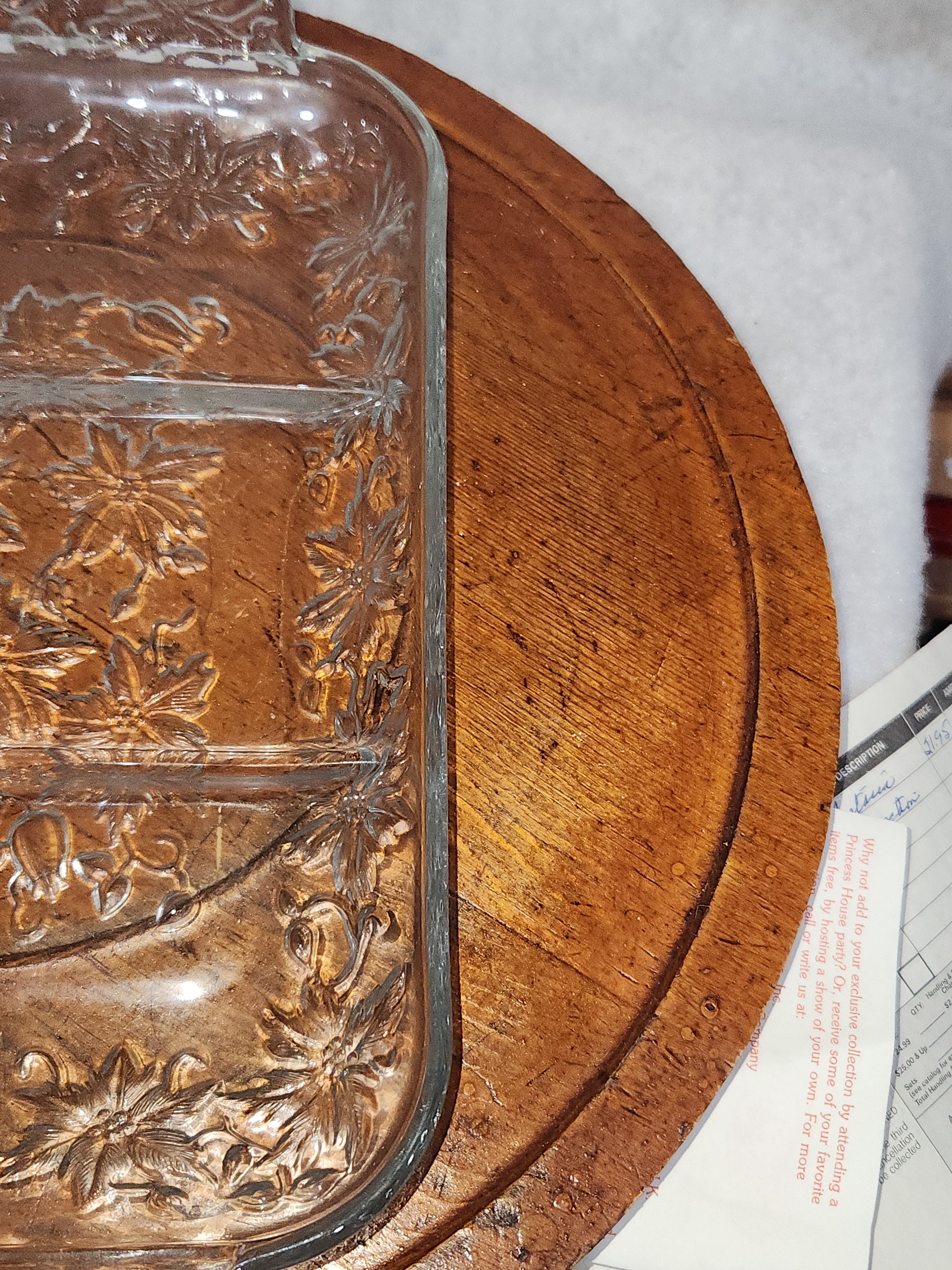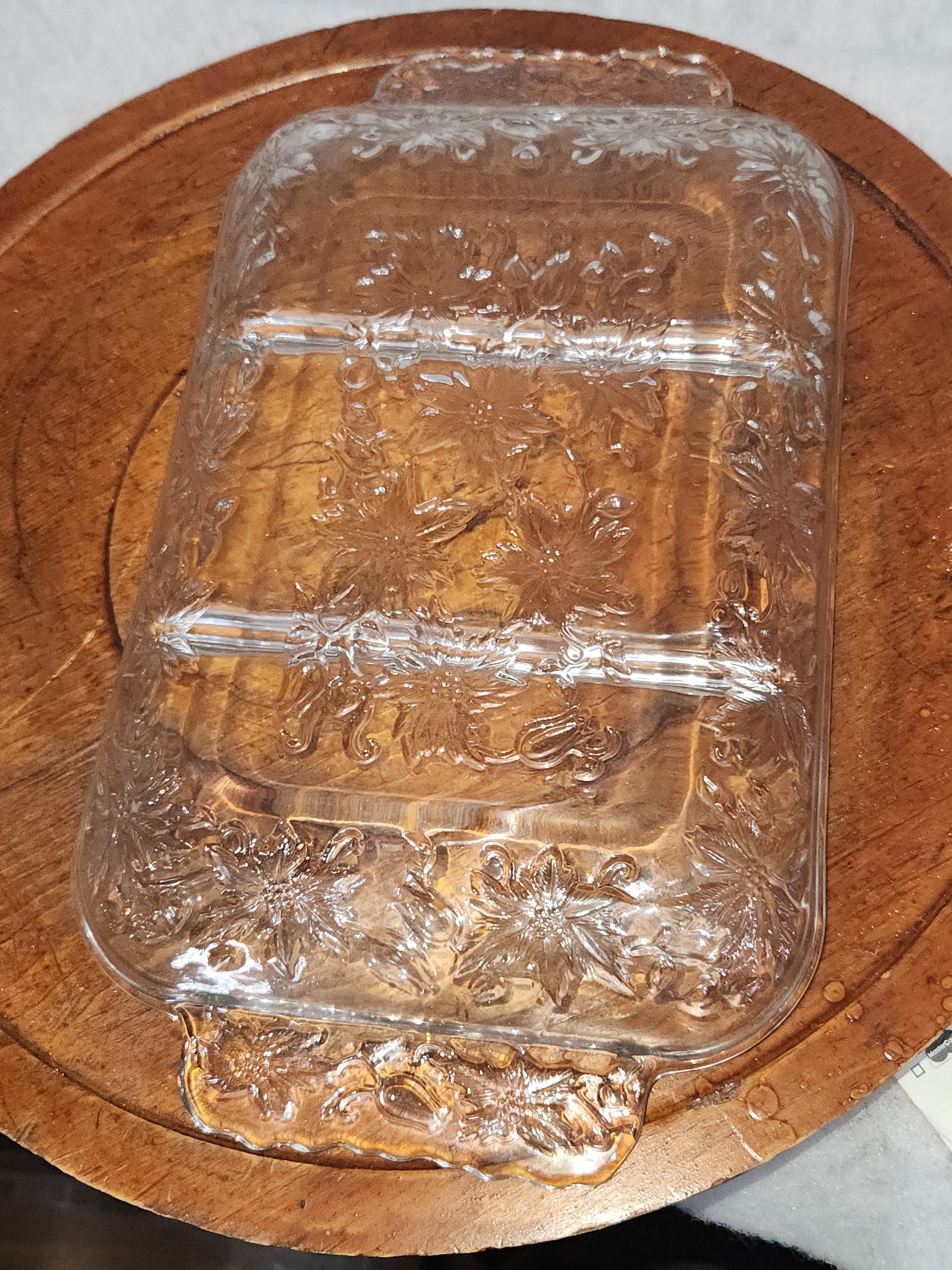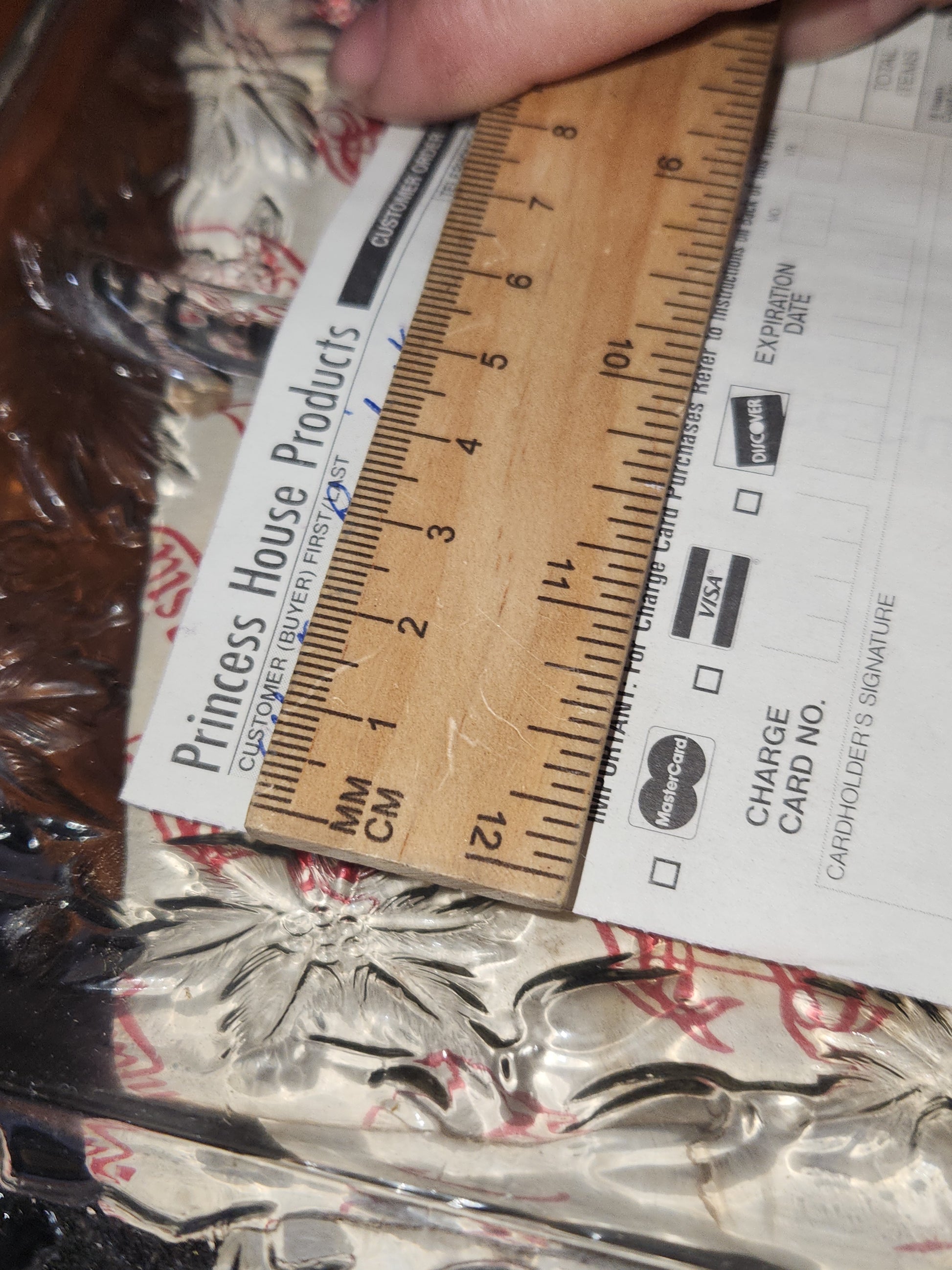 This piece is gorgeous. It is in original box with purchase receipt from Princess House Products. The box is intact with shelf wear and it seems dirty, but may be the design of the box, since it is over the entire box. I see nothing wrong with it and it may have never been used. No chips, no cracks, no scratches. It is 12 1/4" long and just over 7" long. Please see photos as they are part of the description.