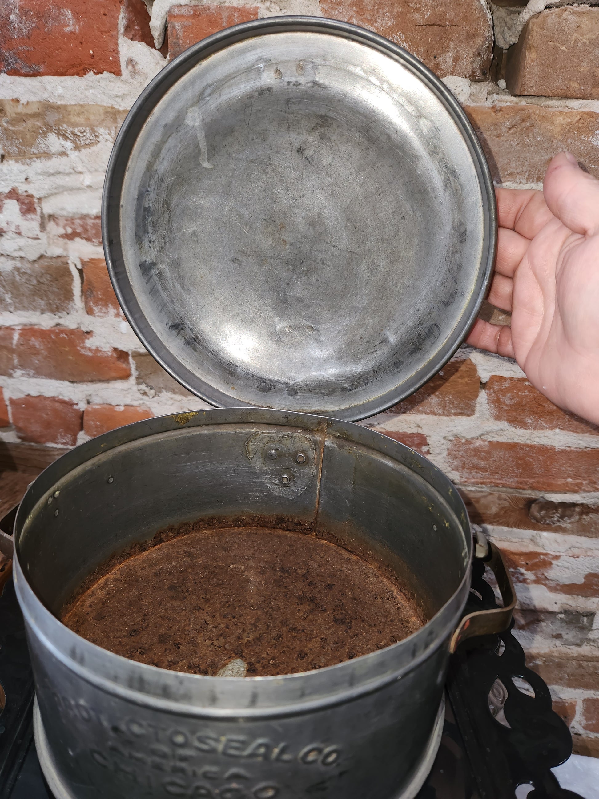 This is a very old industrial round saftey device stamped with Protectoseal co. of America Chicago. Protectoseal made containers like these starting in the 20s as a way to safely store flammable liquids, rags, etc. It has lots of patina and just a few minor dents. Please see the photos as they are part of the description. If you decorate in steampunk this is a great piece to have. A bit over 7 3/4" in Diameter at the bottom. The lid is 8 3/4" in Diameter. The container is 4" tall without the lid and 5" to top dome of lid. From bottom to top of handle is just shy of 7"