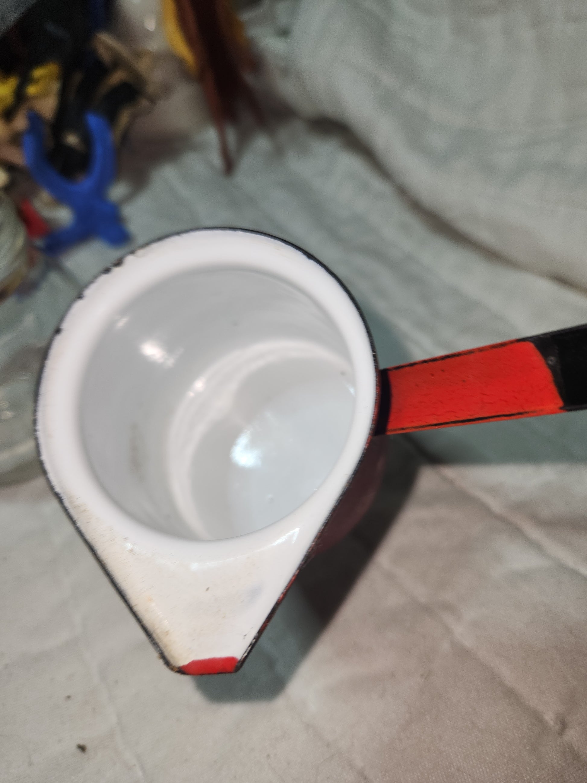 This is a vintage enamel Danish style ladle, milk warmer, butter warmer. It is marked with NT on the bottom. It is a wonderful red, black and white enamel ladle. It has chipped enamel near the top spout and a few places on the bottom. Please see photos as they are part of the description.