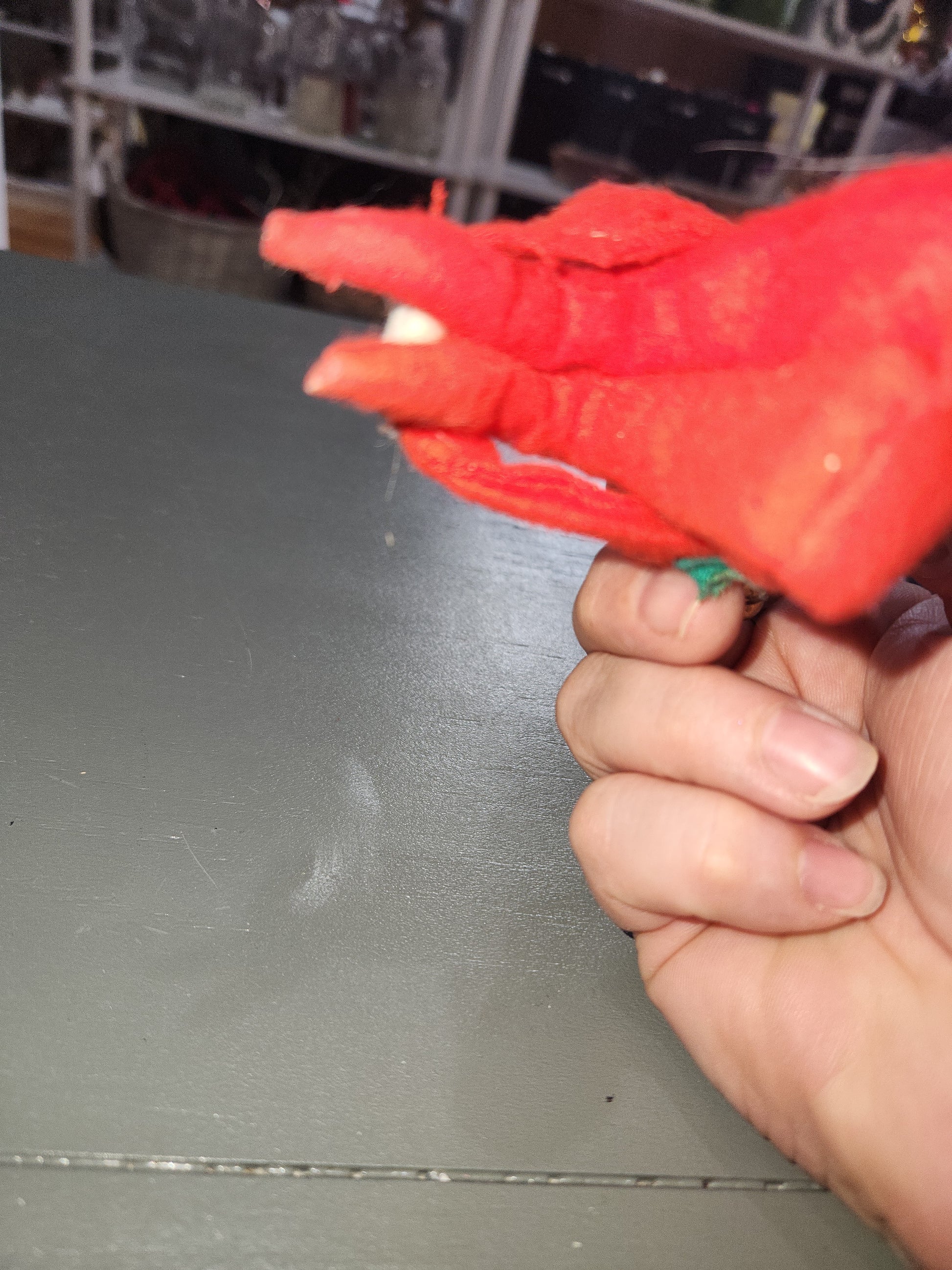 This is an older knee hugger elf or pixie. His cheeks glow under black light. He is 4" tall and 1 1/2" wide at bottom. His hat has some stains that are maybe glue residue. His white hand area also has a brown stain. There are dark stains on his feet. Please see photos as they are part of the description.
