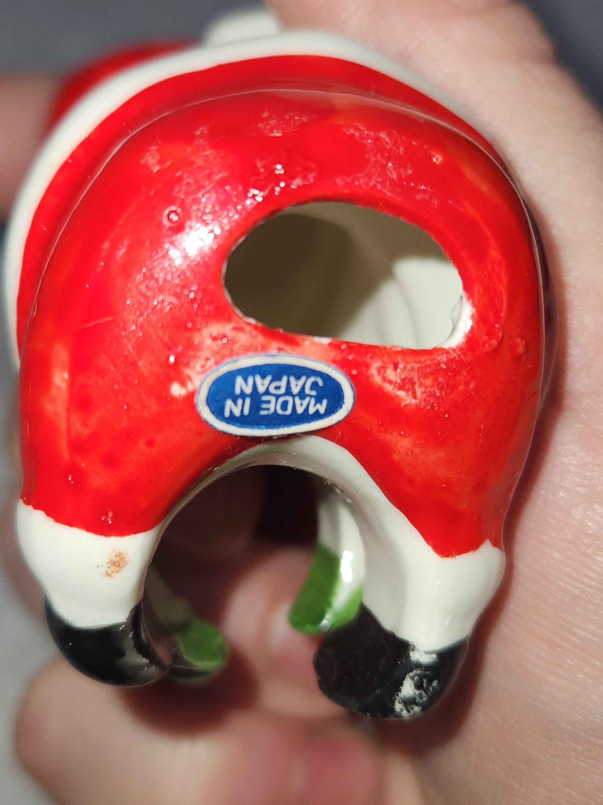 This little Japan made santa is in good condition with no chips, cracks or paintloss, with the exception of paint wear on the bottom. His colors are great! He is 3" tall. He has a made in Japan sticker. No accessories included. Please look at the photos as they are part of the description and show you exactly what you will be getting.