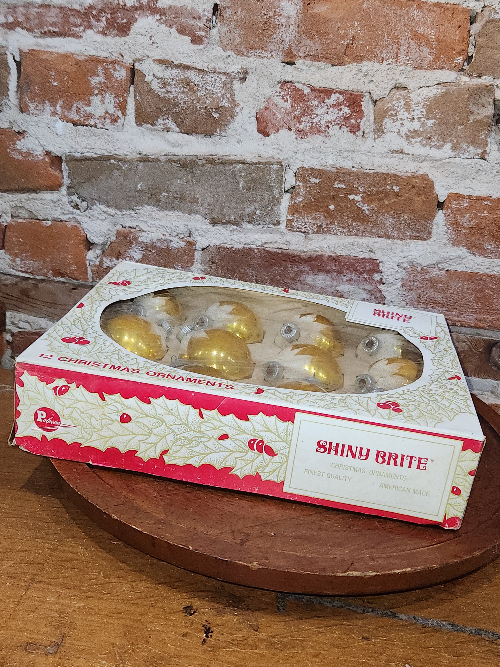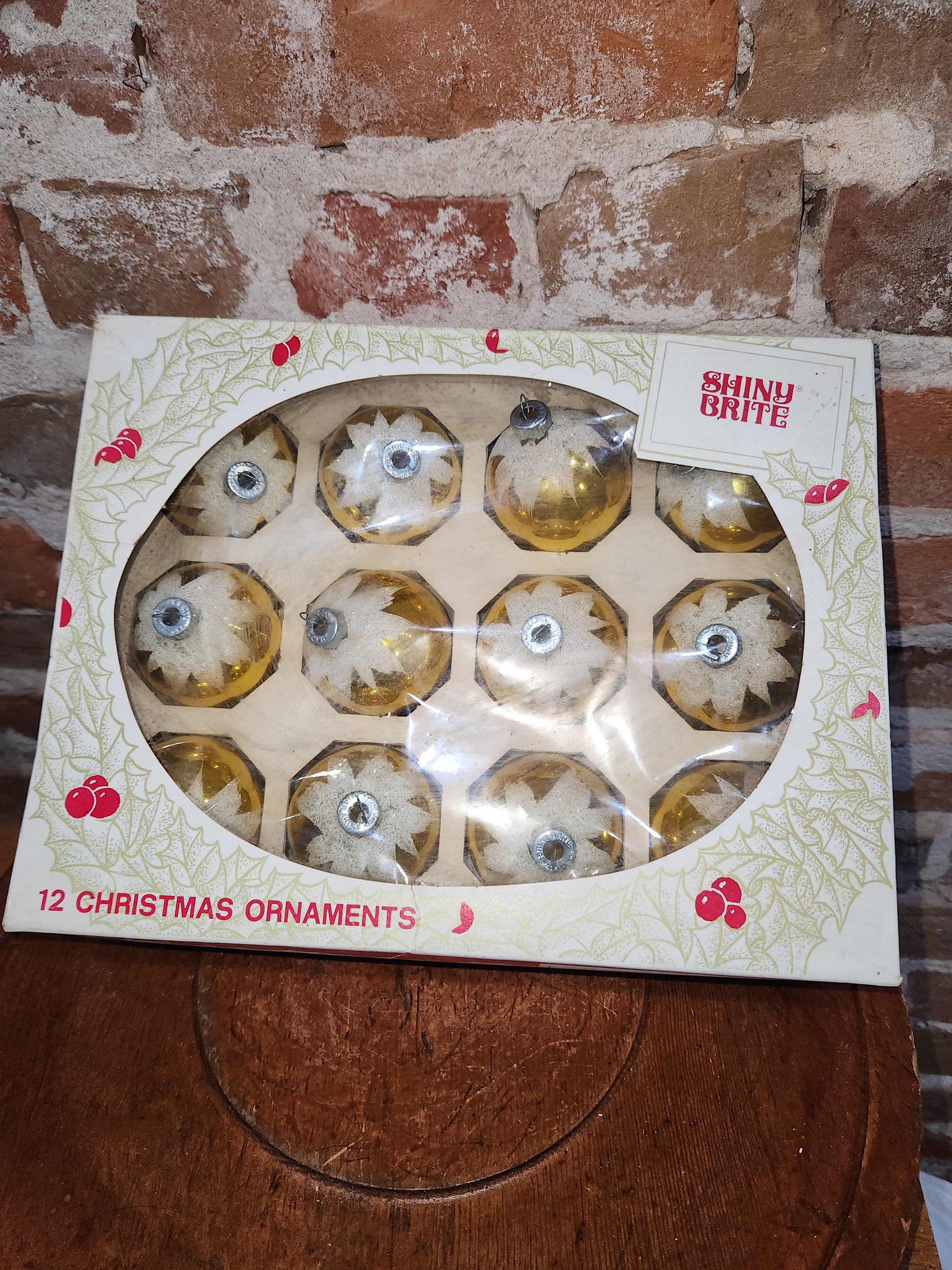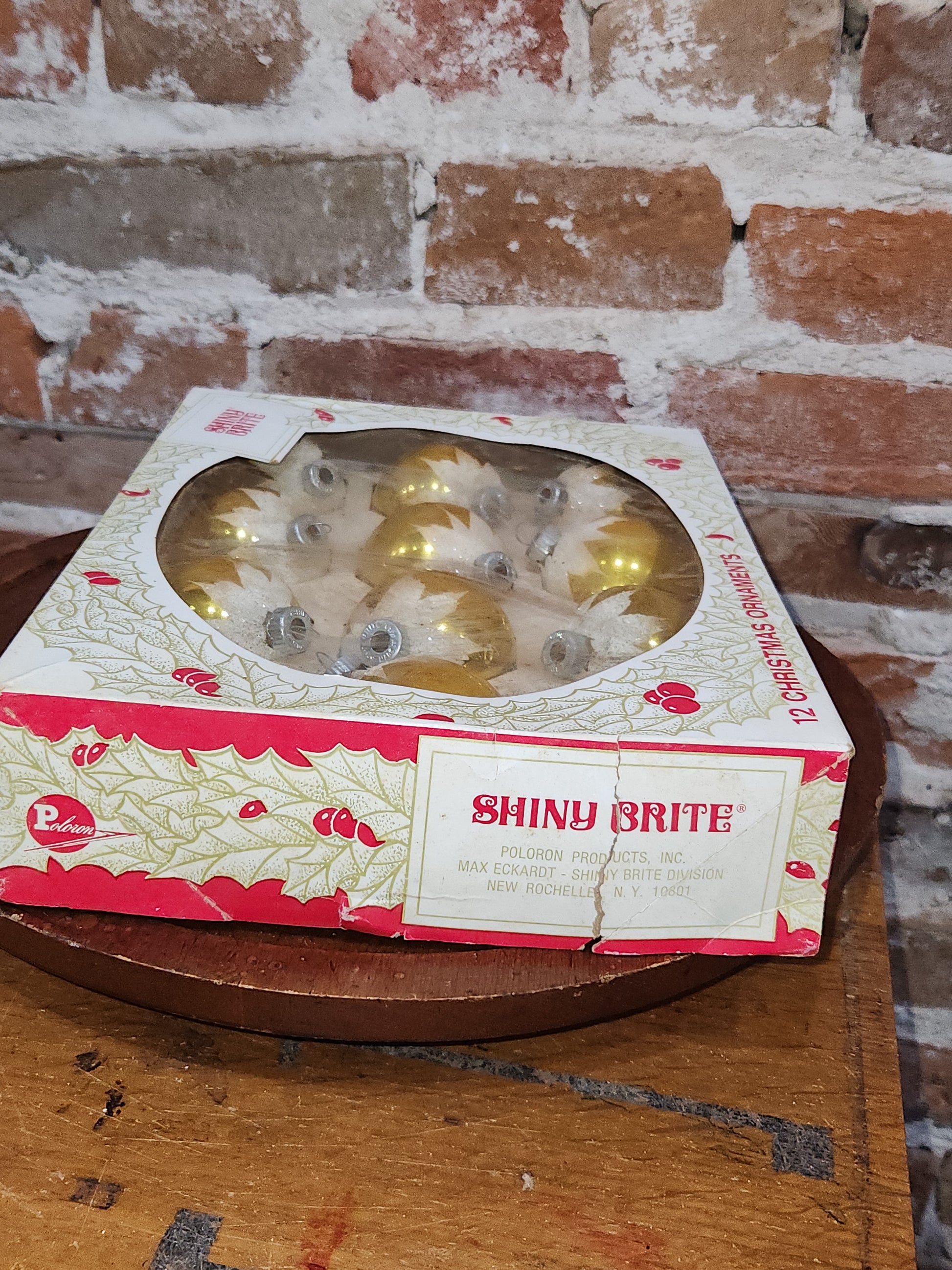 Box of gold 2 1/2" Shiny Bright ornaments box and good condition ornaments appear to be in good vintage condition. The mica to snow cap is a beautiful addition. Box has some shelf wear, several rips. There are still price tags on it. Made by Poloron so made after 1970. When buying vintage ornaments, you may be getting discoloration, paint loss, crazing and ruined boxes, please be aware of this before ordering. Please see photos as they part of the description.