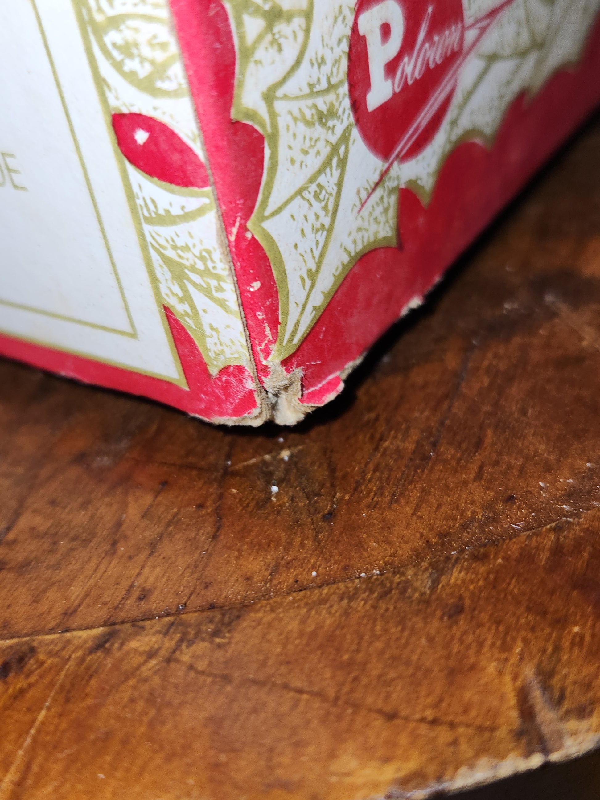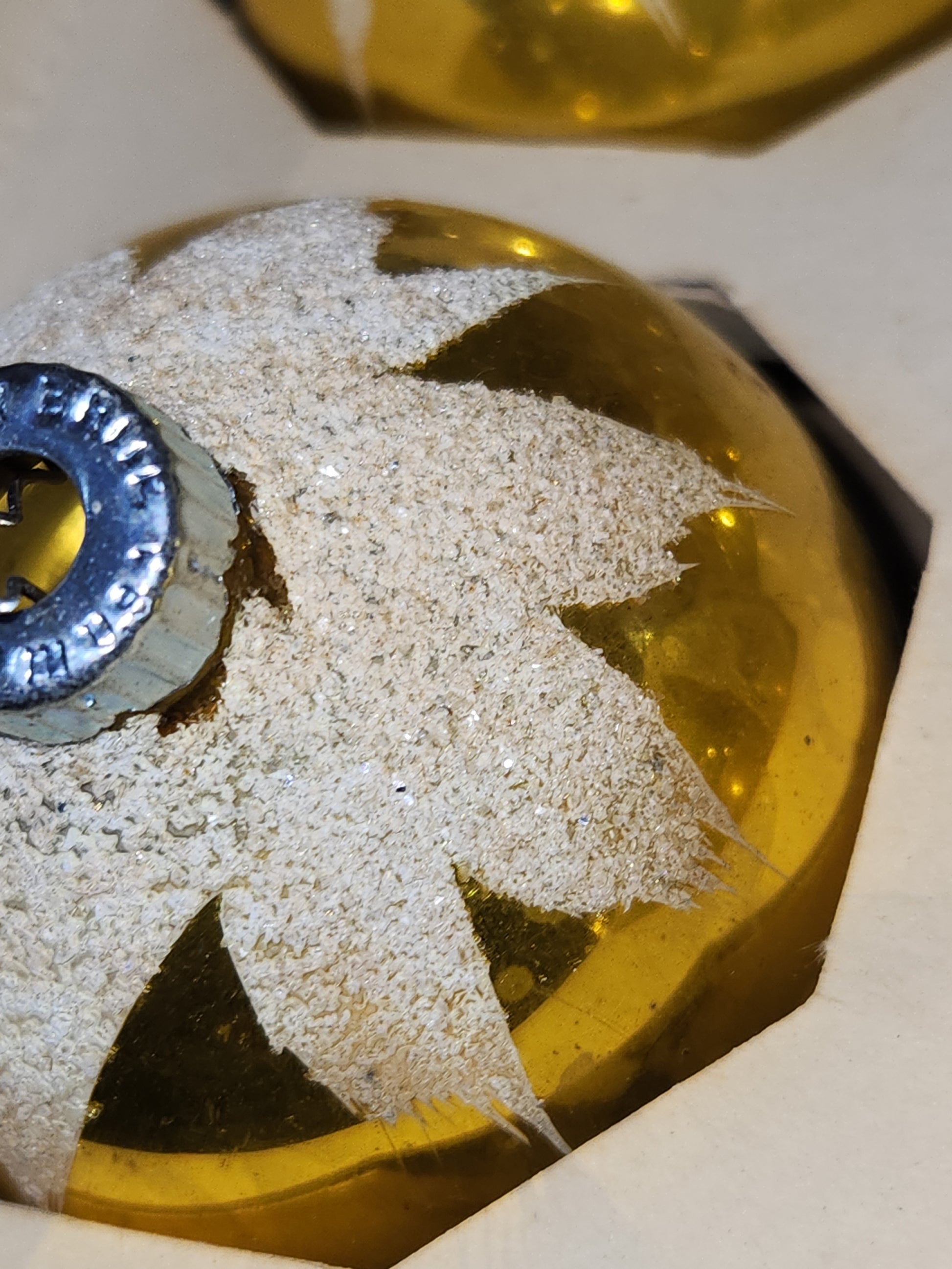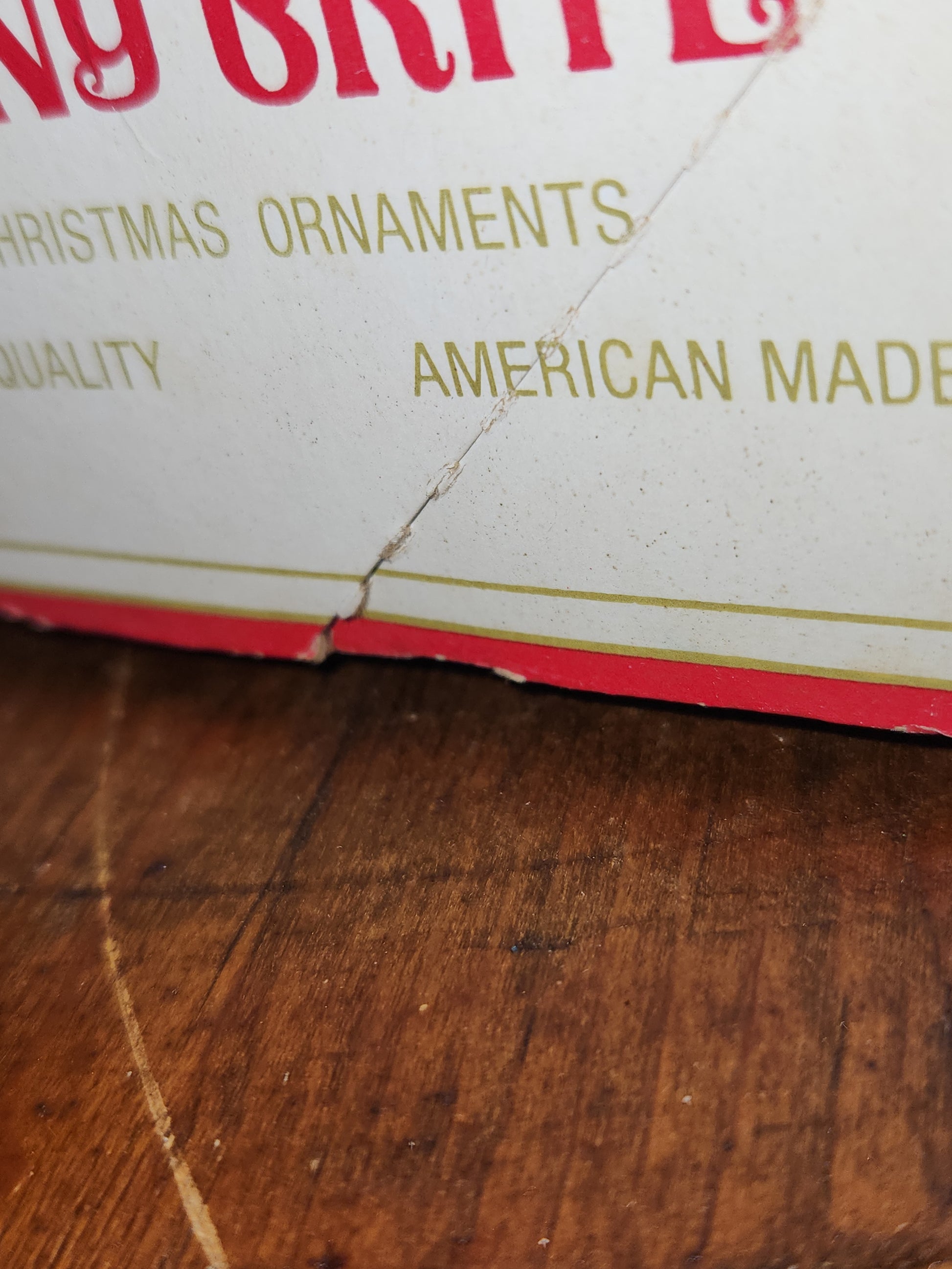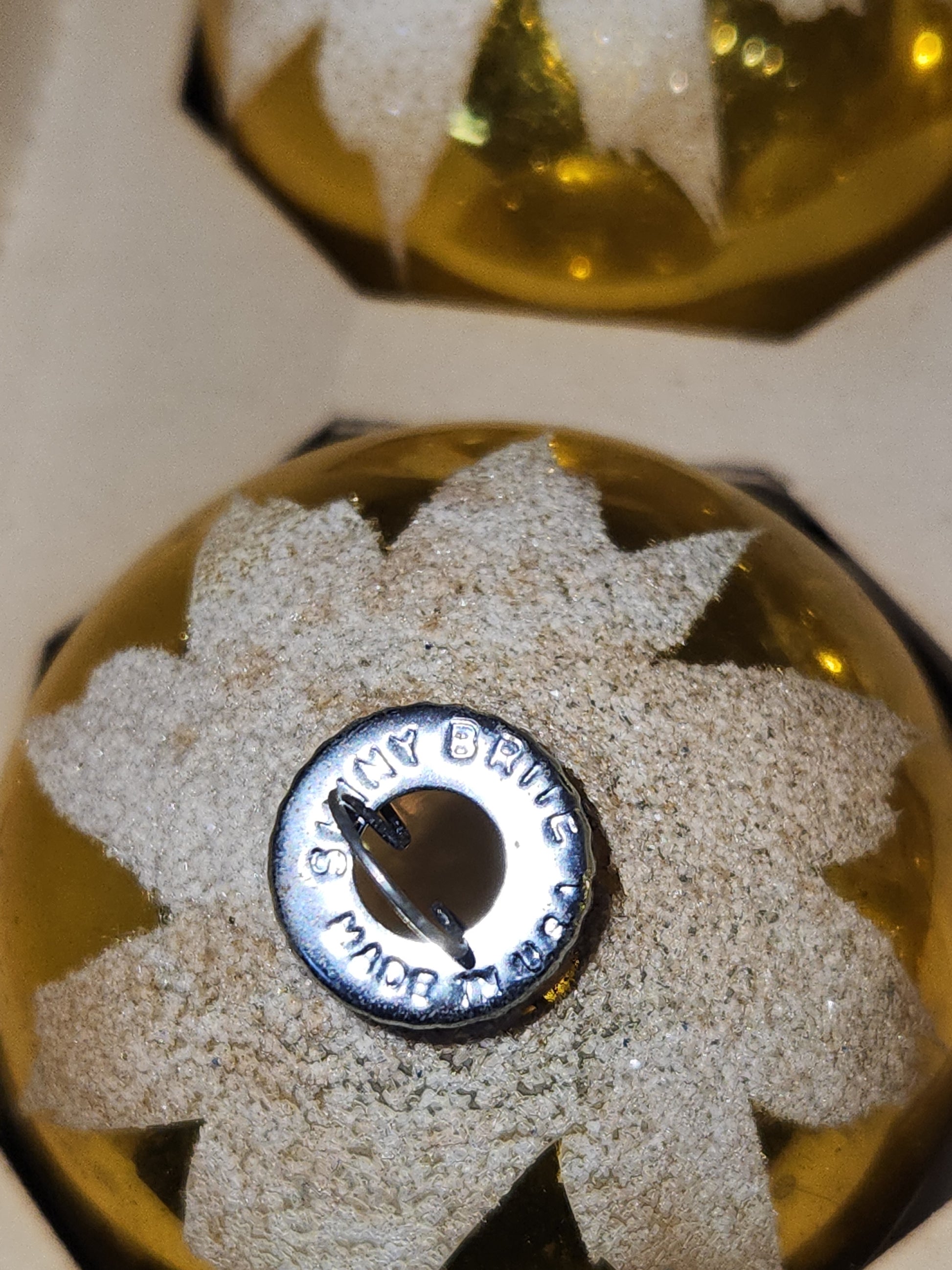 Box of gold 2 1/2" Shiny Bright ornaments box and good condition ornaments appear to be in good vintage condition. The mica to snow cap is a beautiful addition. Box has some shelf wear, several rips. There are still price tags on it. Made by Poloron so made after 1970. When buying vintage ornaments, you may be getting discoloration, paint loss, crazing and ruined boxes, please be aware of this before ordering. Please see photos as they part of the description.