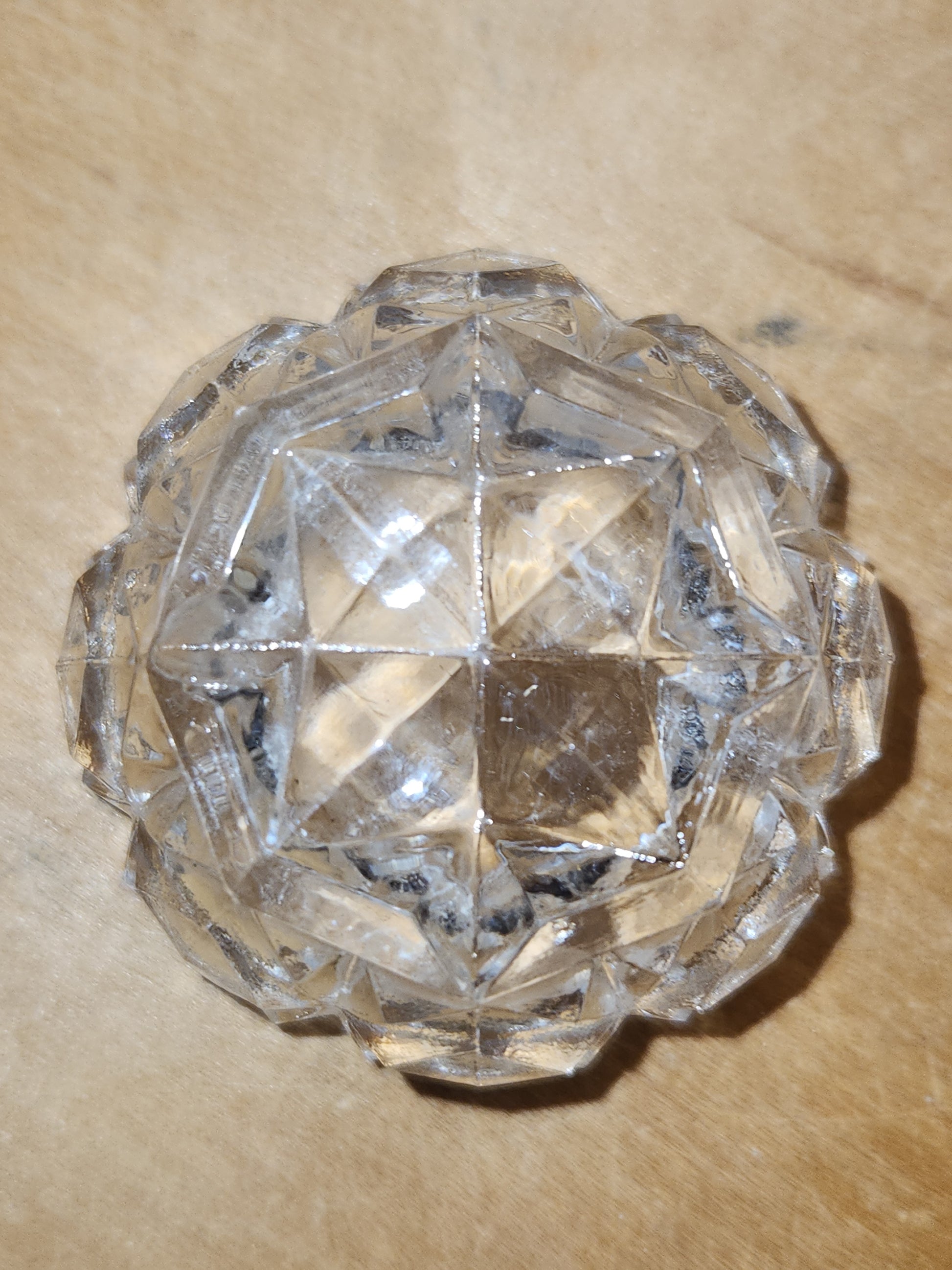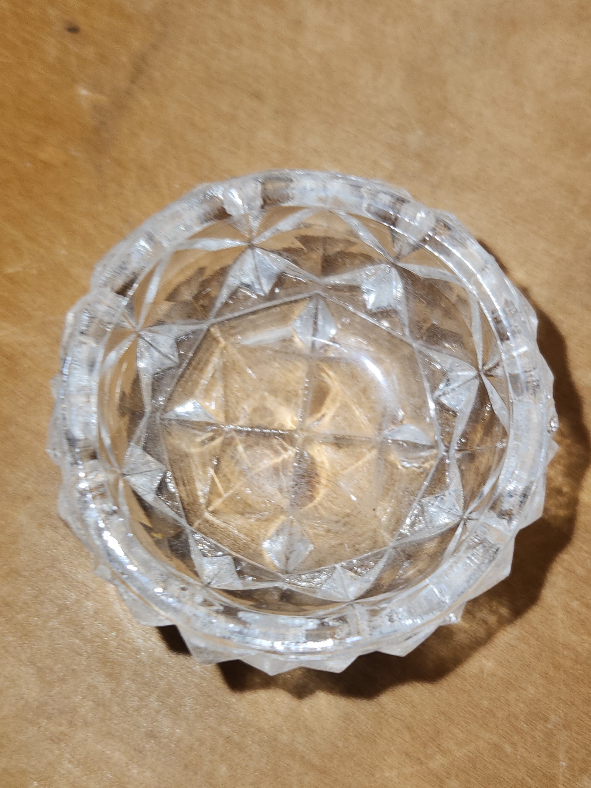Thisbset of salt cellars was well taken care of. I see nor feel any damage in the glass of any of them and I do not see any breakage in the spoons. The box has some shelf wear and a bit of staining on the top and more on the bottom. This is a beautiful set. The top diameter is 1 5/8" and 15/16" tall. Please see photos as they are part of the description