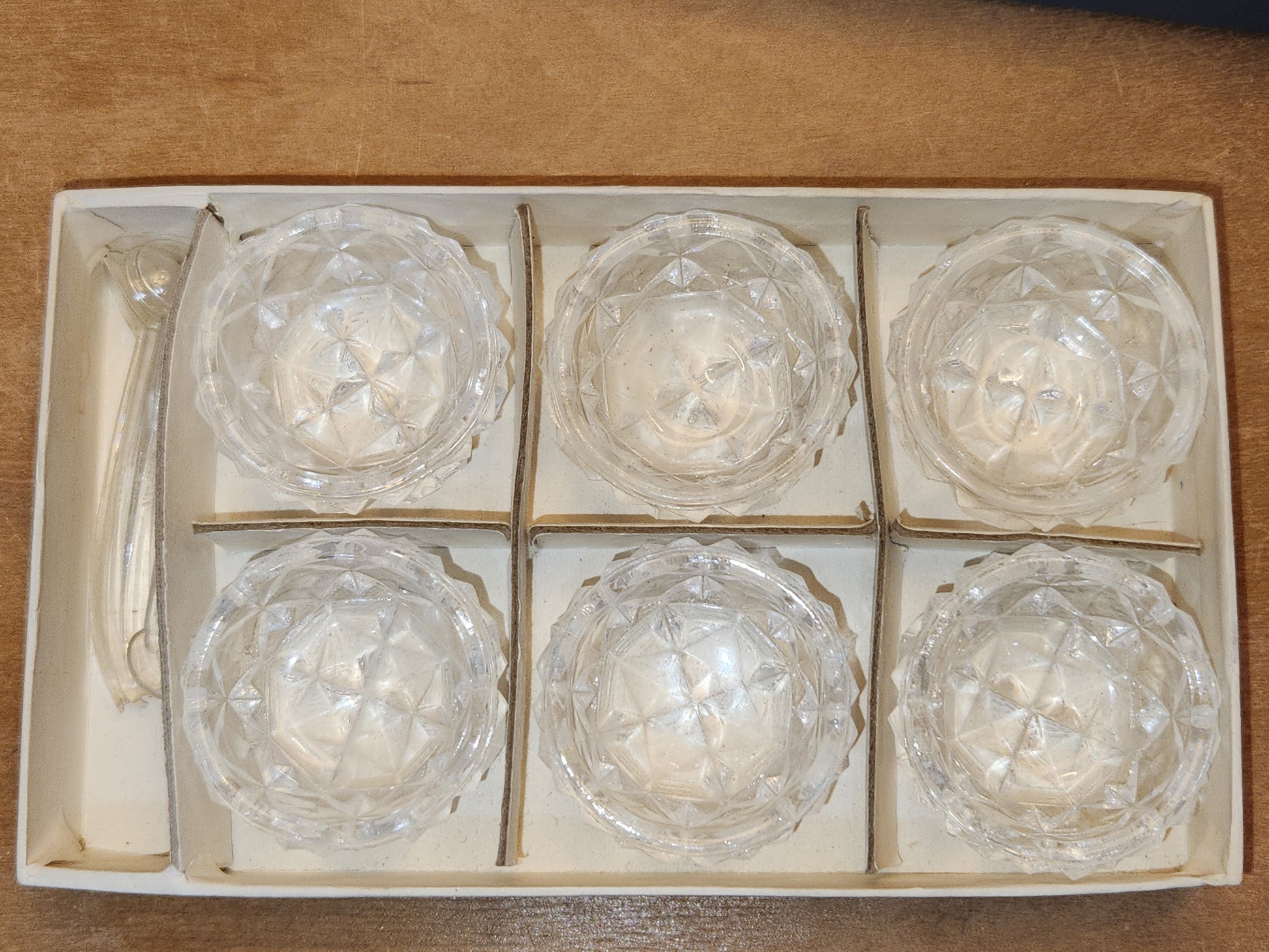 Vintage Pressed Glass Salt Cellars with Plastic Spoons Set of 6 in Original Box Made In Japan ss9