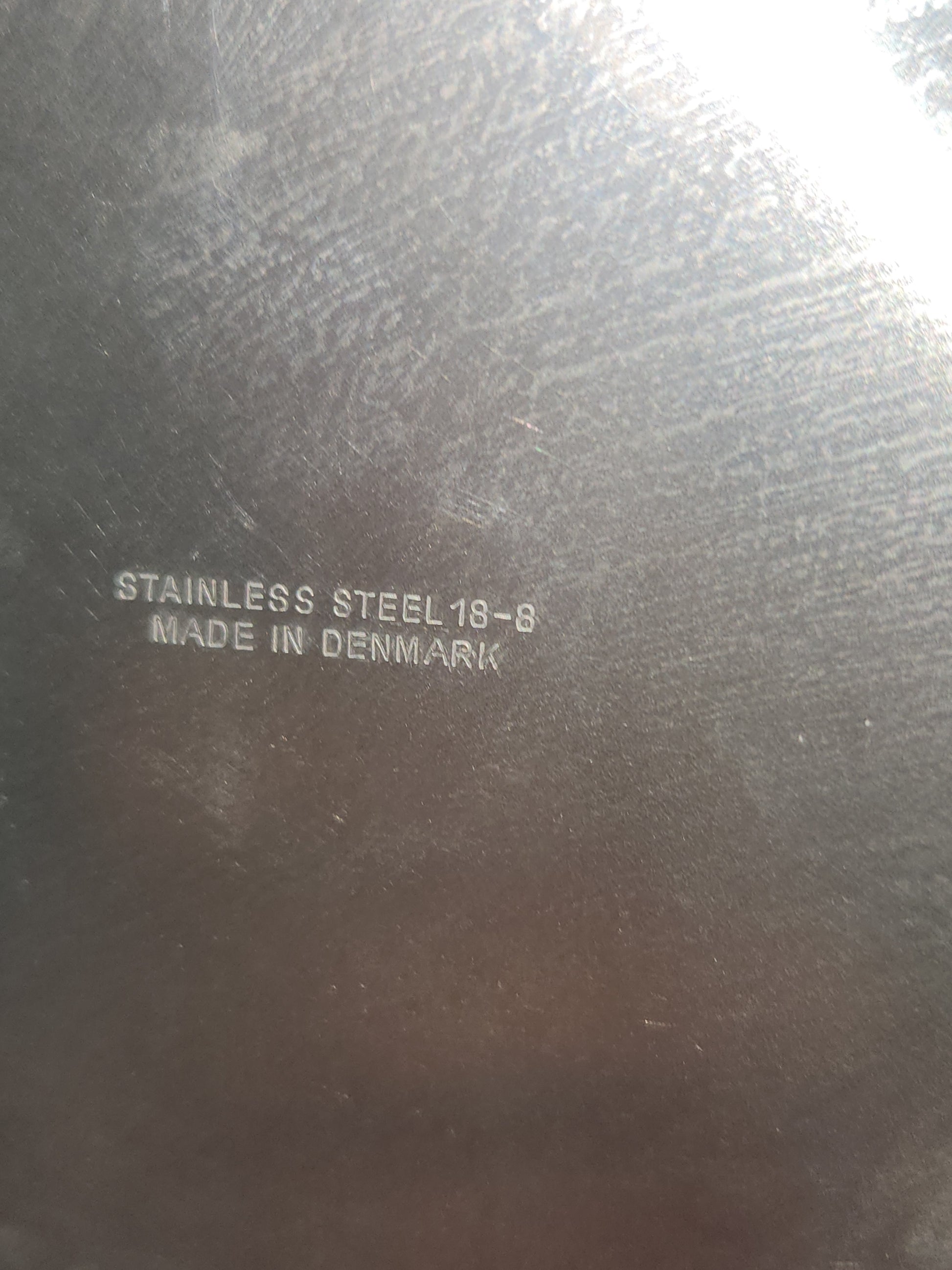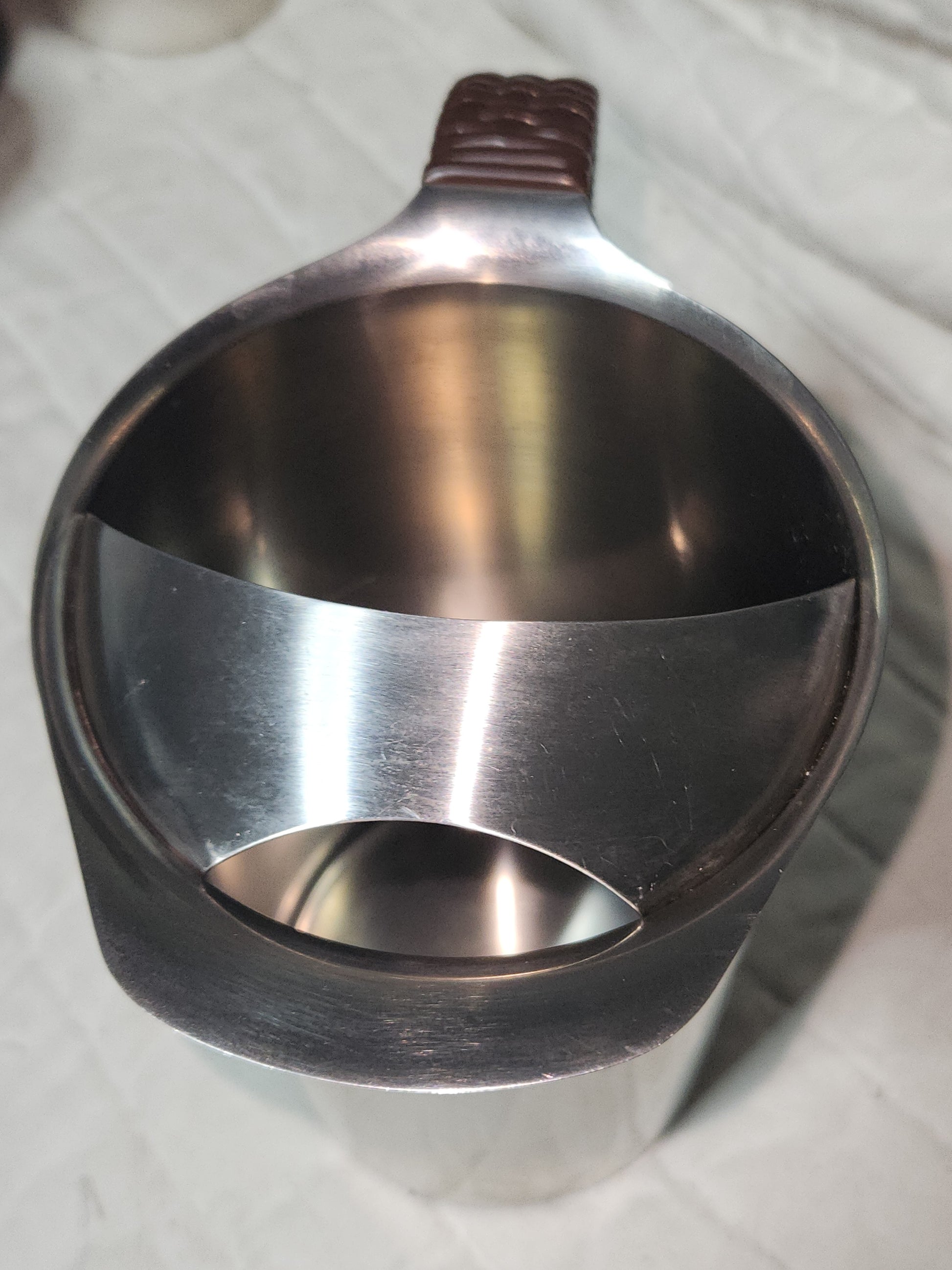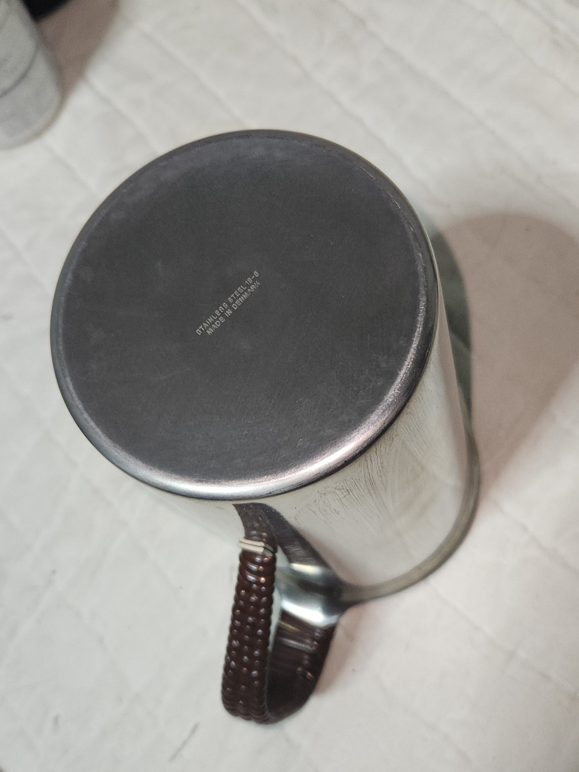 This pitcher is in good vintage condition with no dents or major scratches. The plastic "rattan" handle is in good condition, I see no damage to it. It is stamped on the bottom with Stainless Steel 18-8 Made in Denmark. It is 7 3/4" tall and diameter of 4 1/4 on the lip. Please see photos as they are part of the description.