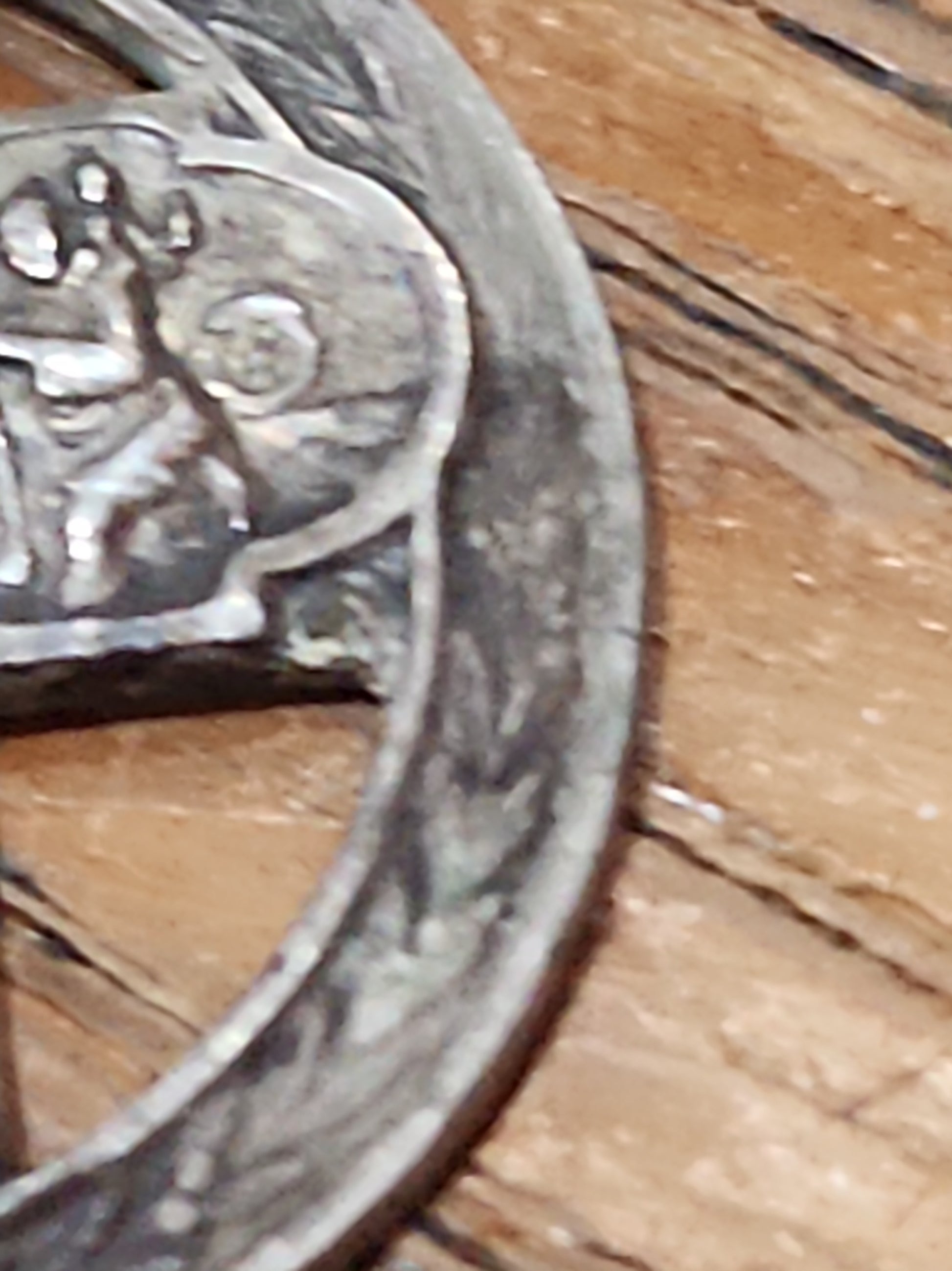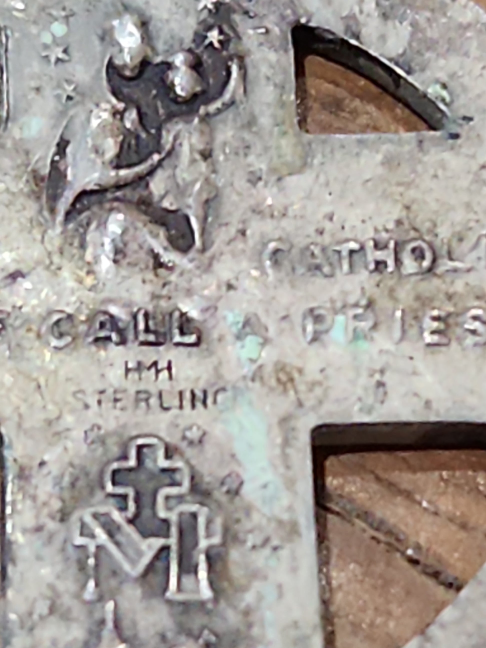 This piece has tarnish, discoloration and lots of patina. It would be beautiful displayed with a tiny vintage Bible. It is 1" in diameter. Please see photos as they are part of the description