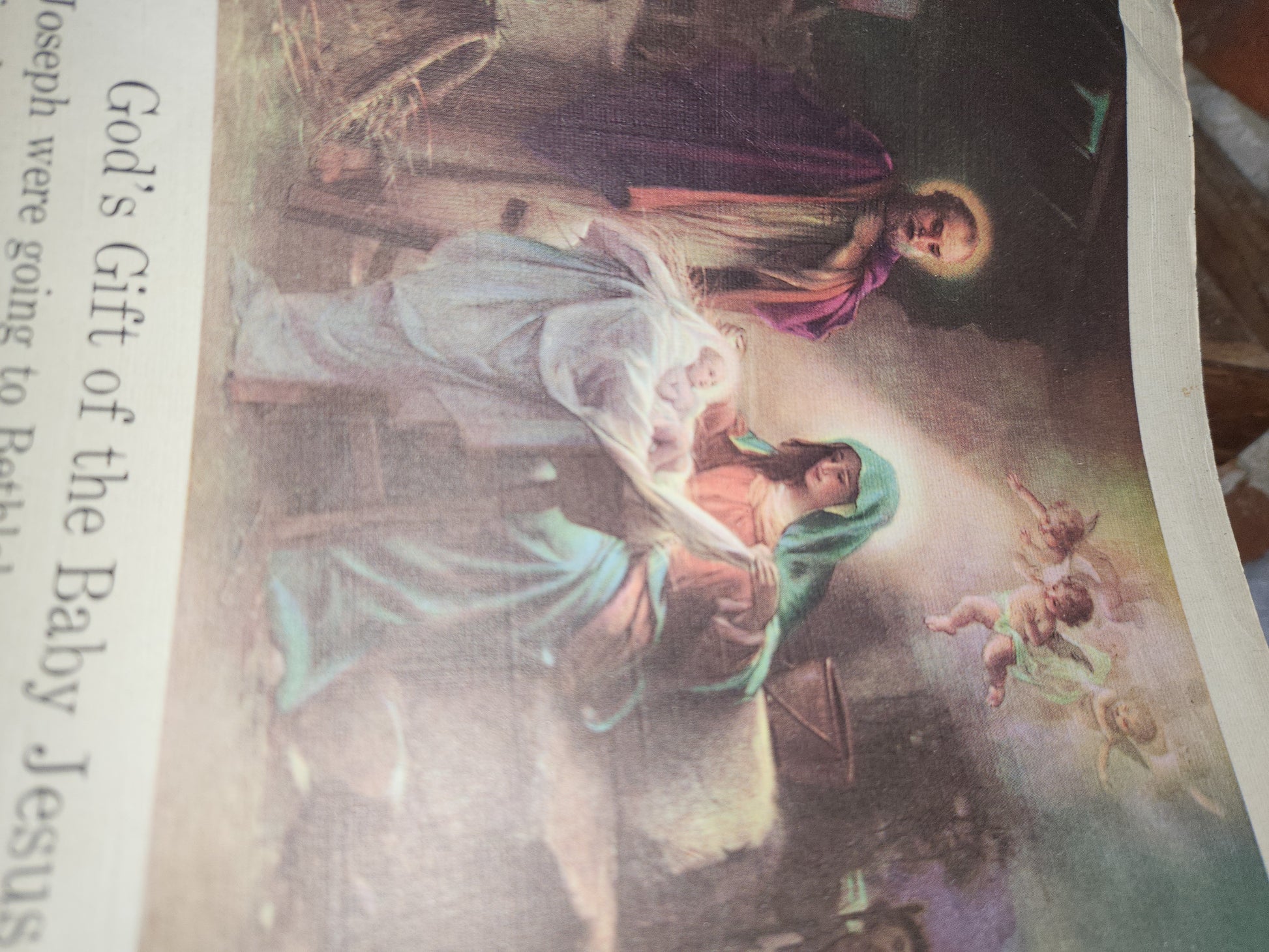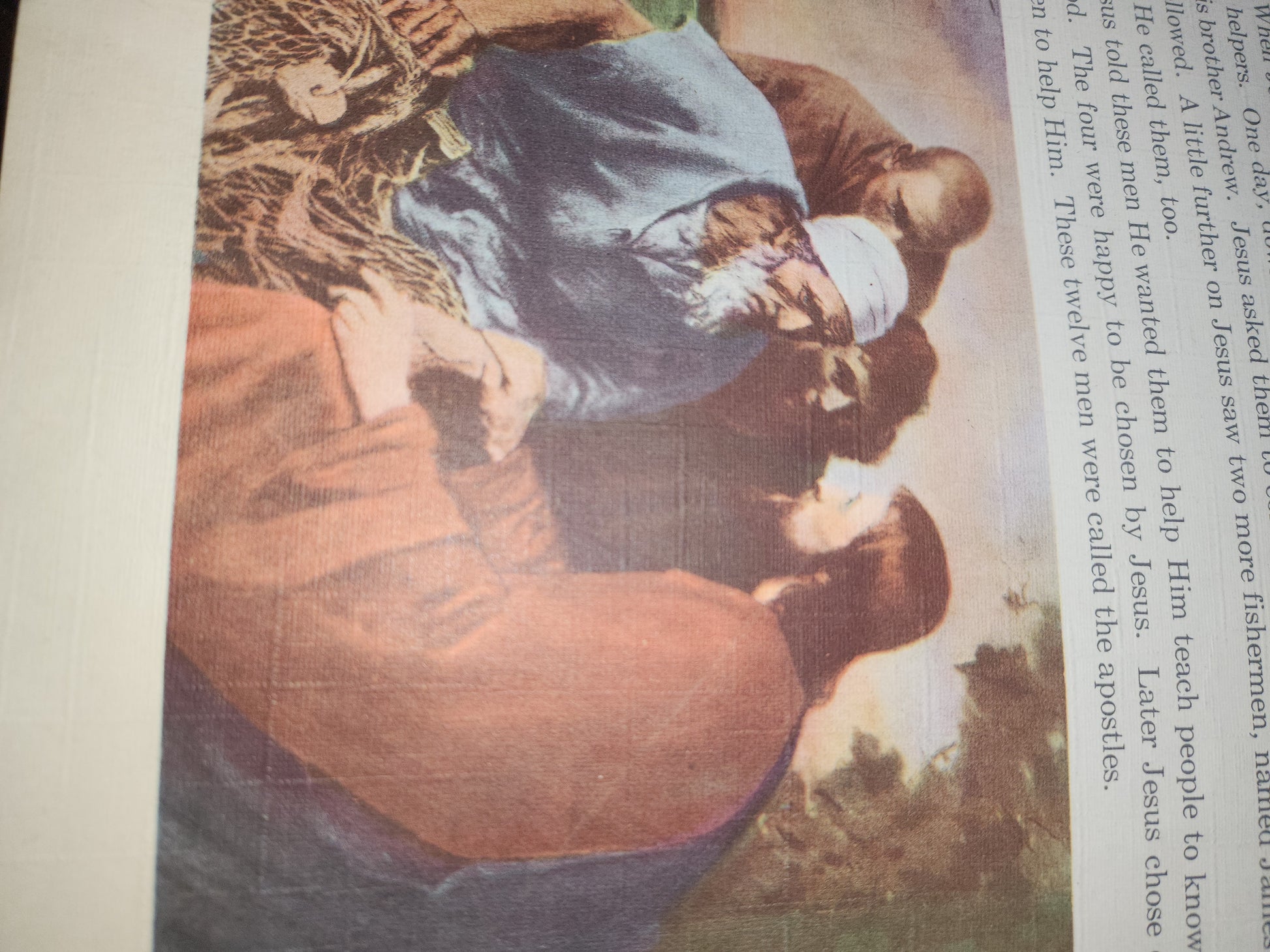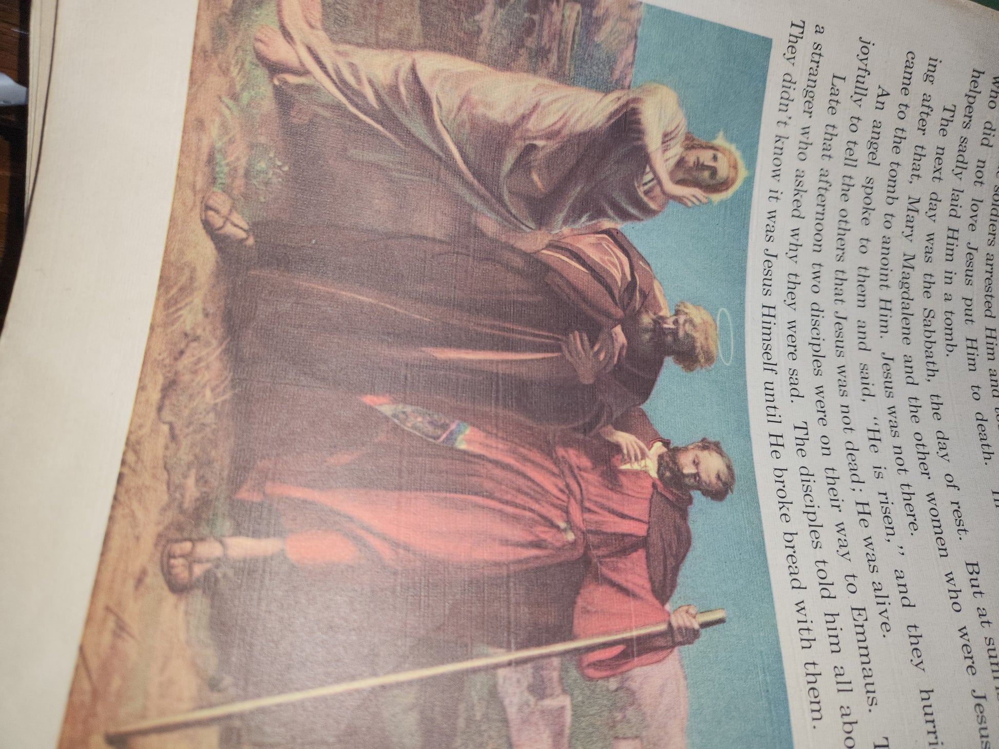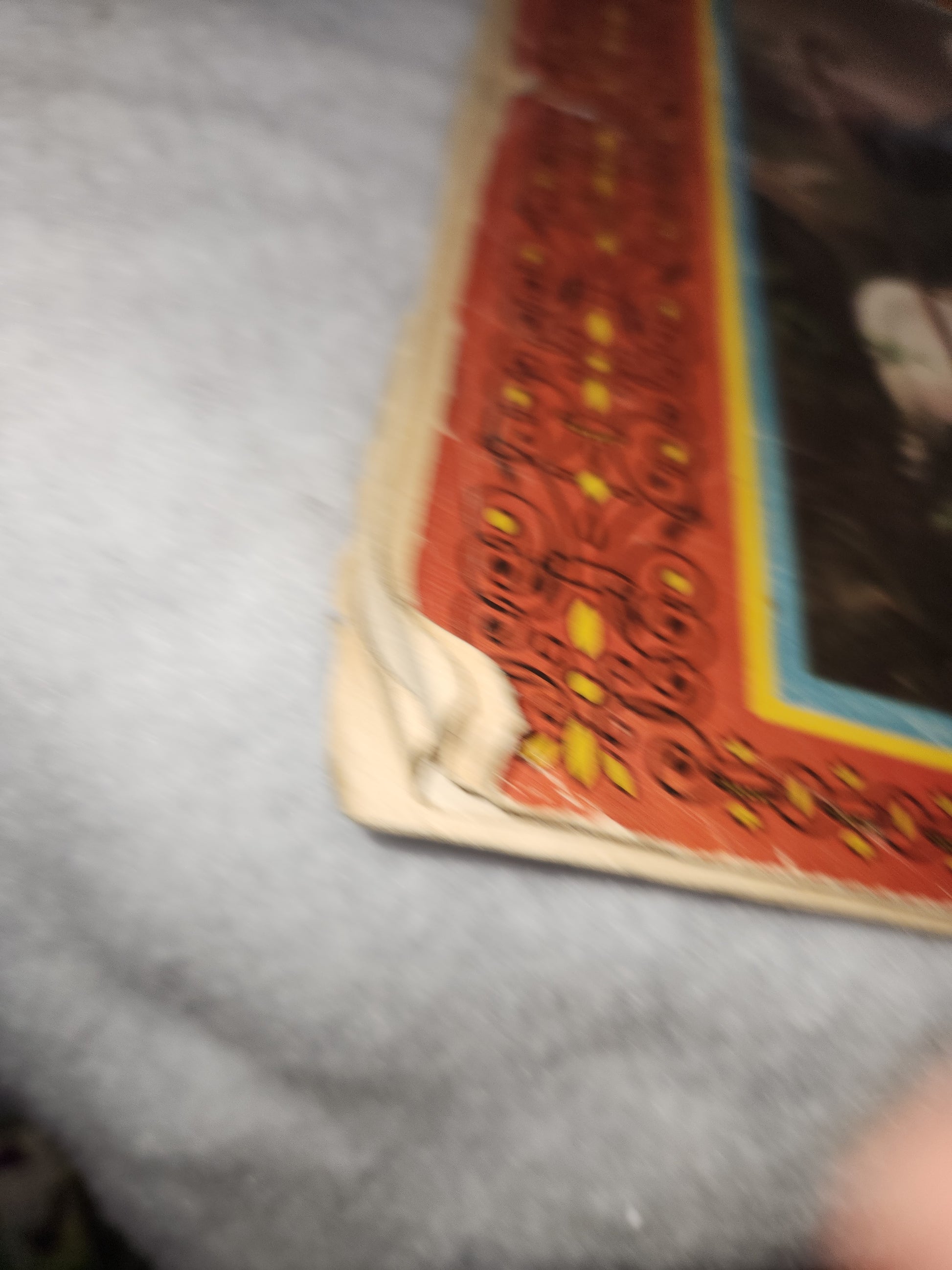 This is a large book with beautiful pictures is on a linen paper. It is not in very good condition. The binding has been taped. The edges are ripped and worn.. There's a name printed inside. But the pictures are still in good condition and stories can still be read. I bought this thinking I would cut out the photos and add to picture frames, but I am not getting it done and it needs to leave my craft stash for someone who will enjoy it. Please see photos.