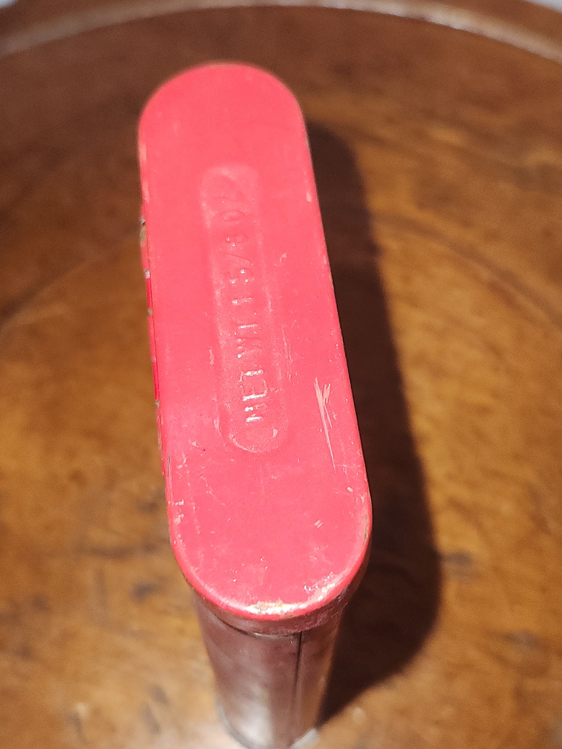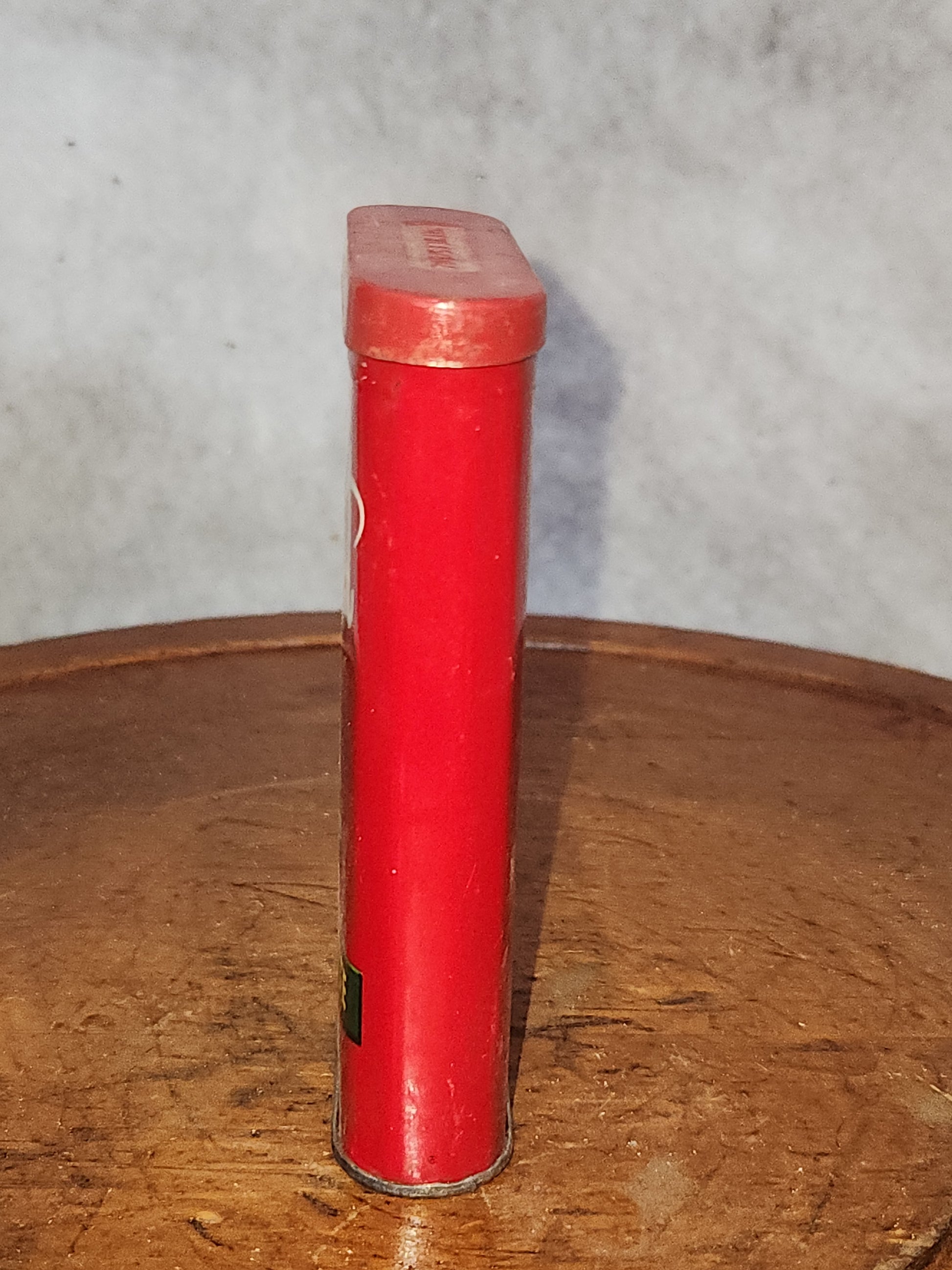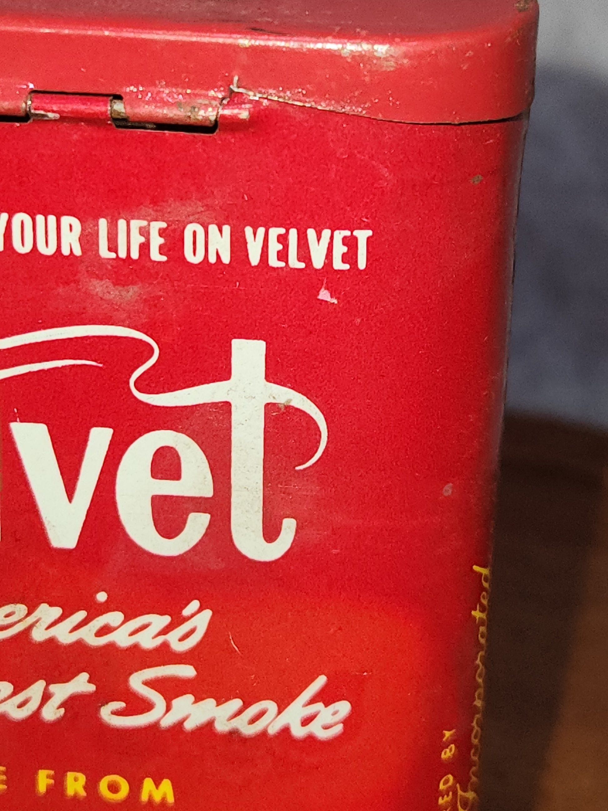 This velvet pipe and cigarette tobacco tin is in decent condition the color is amazing it does have scrtches and paint loss. There is some rust on the hinge and bottom rim. Pinkerton tobacco company St Louis. Please see the photos as they are part of the description.