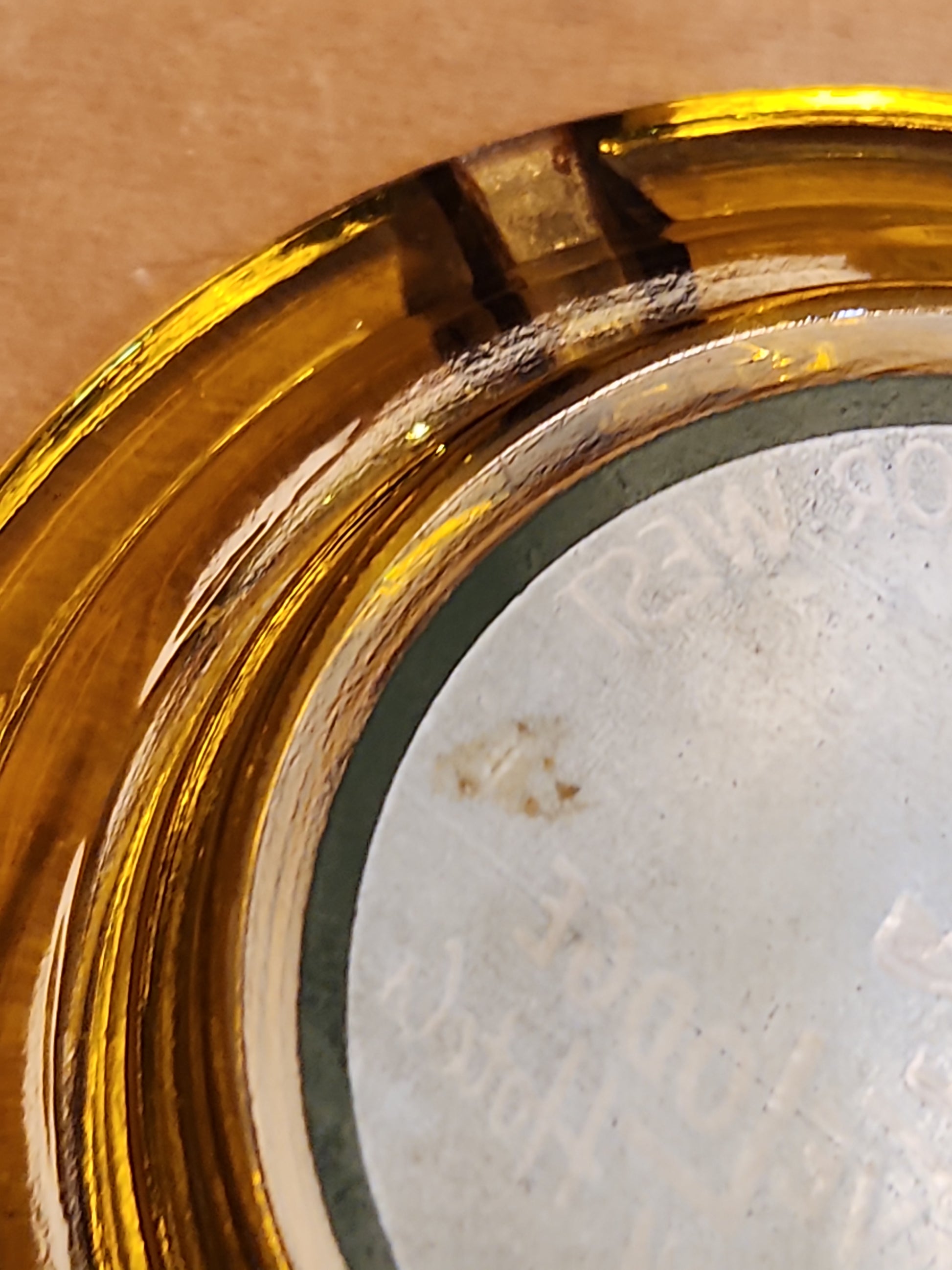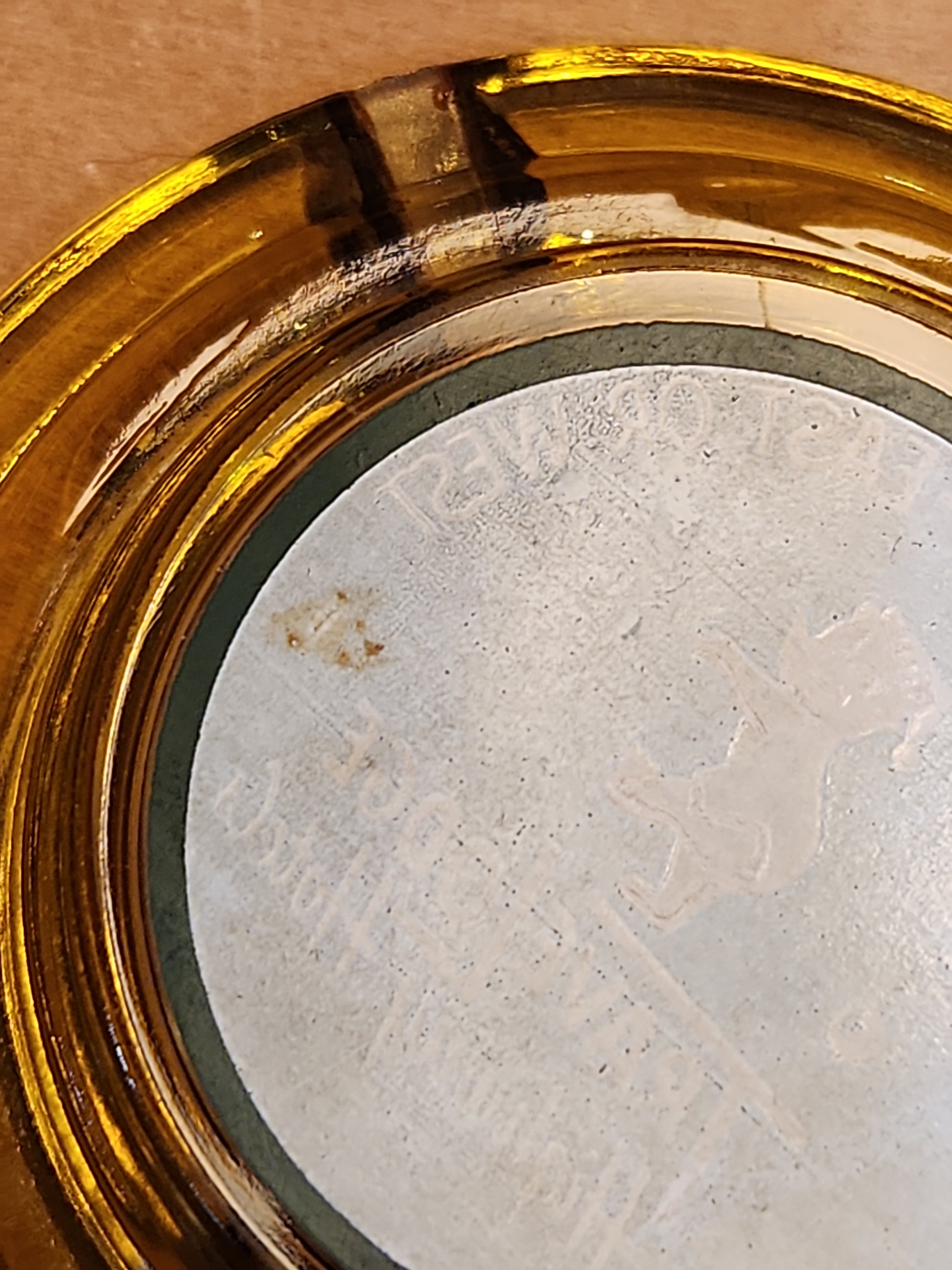 This ashtray has some beautiful graphics.There are no chips, cracks or scratches. There is a stain on the back of the graphic I did not try to get off, for fear of damaging the graphic. It is 4" in diameter a d 1" tall. Please see photos as they are part of the description
