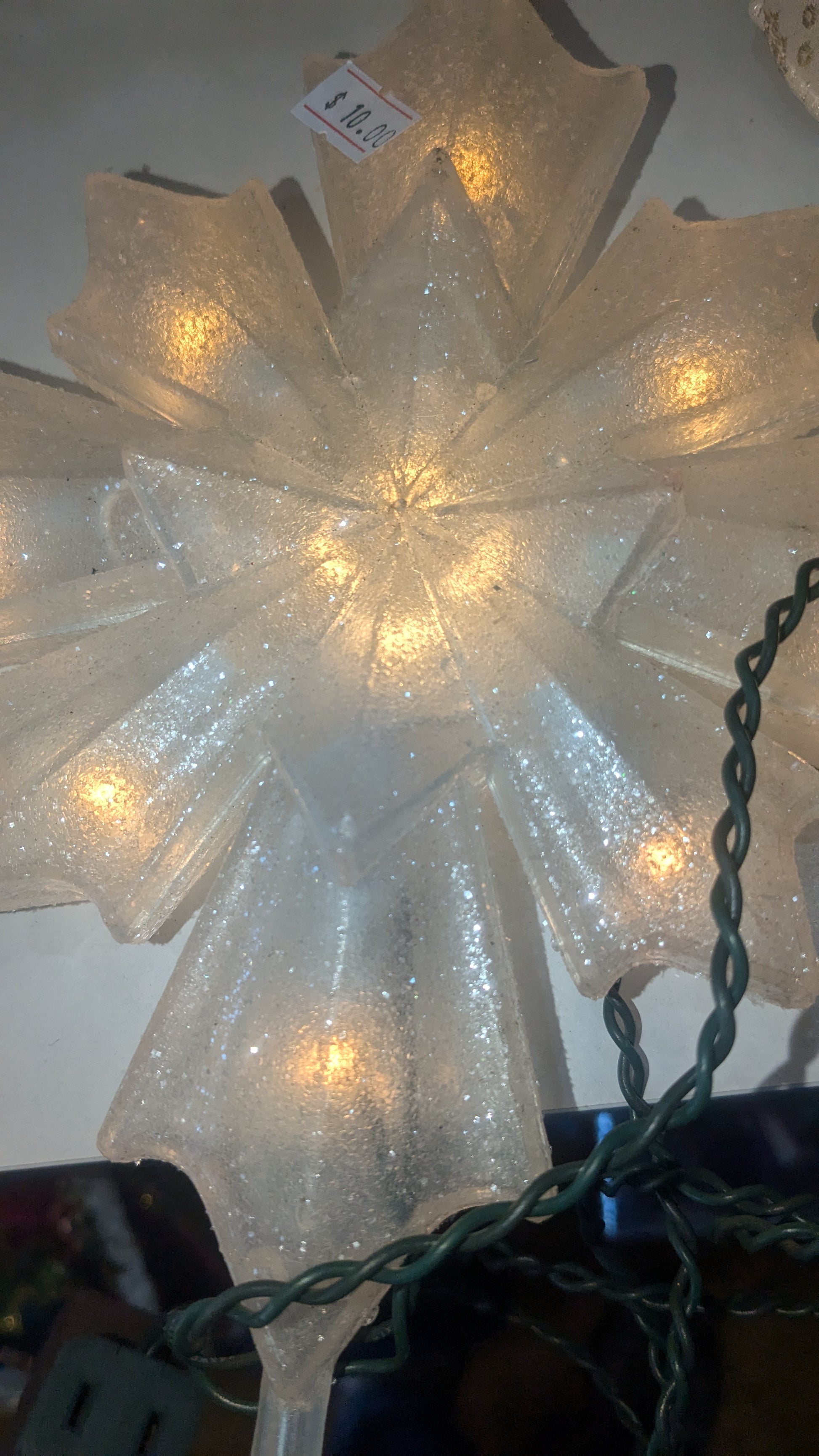 This plastic tree topper has glitter but it does not come off much it does light up it does not have anything to attach it to the tree we would just go fishing line around it and hang it
