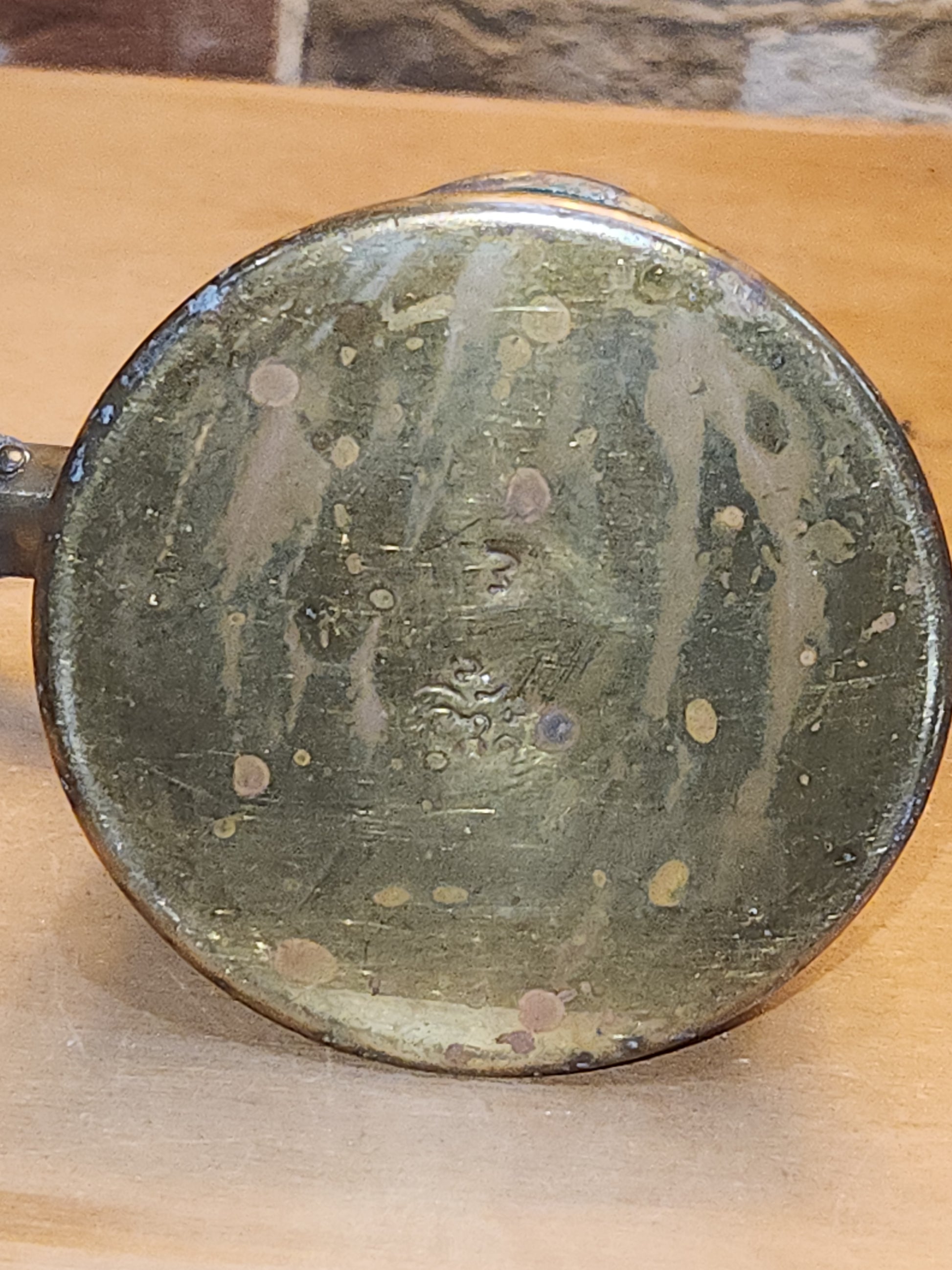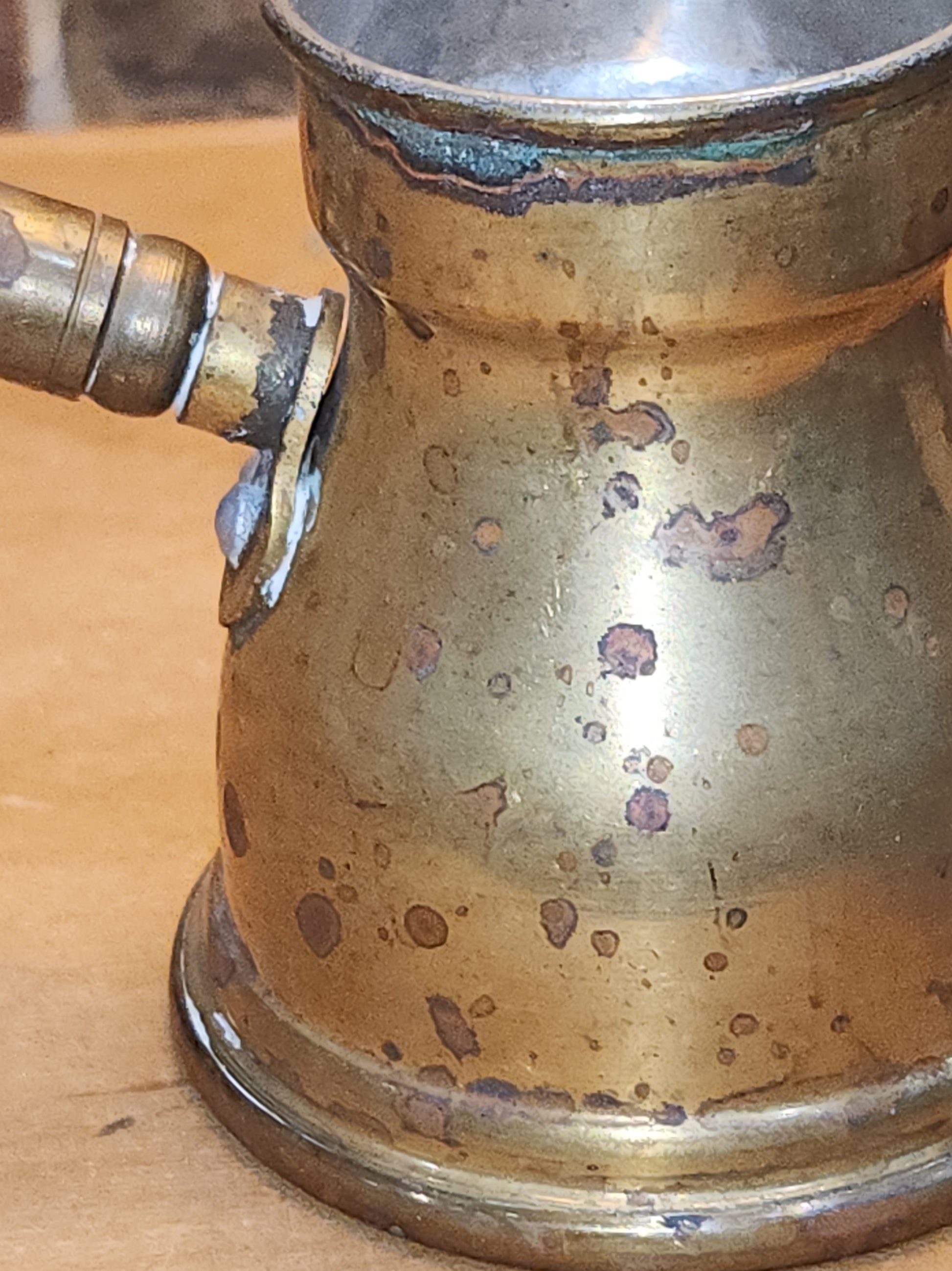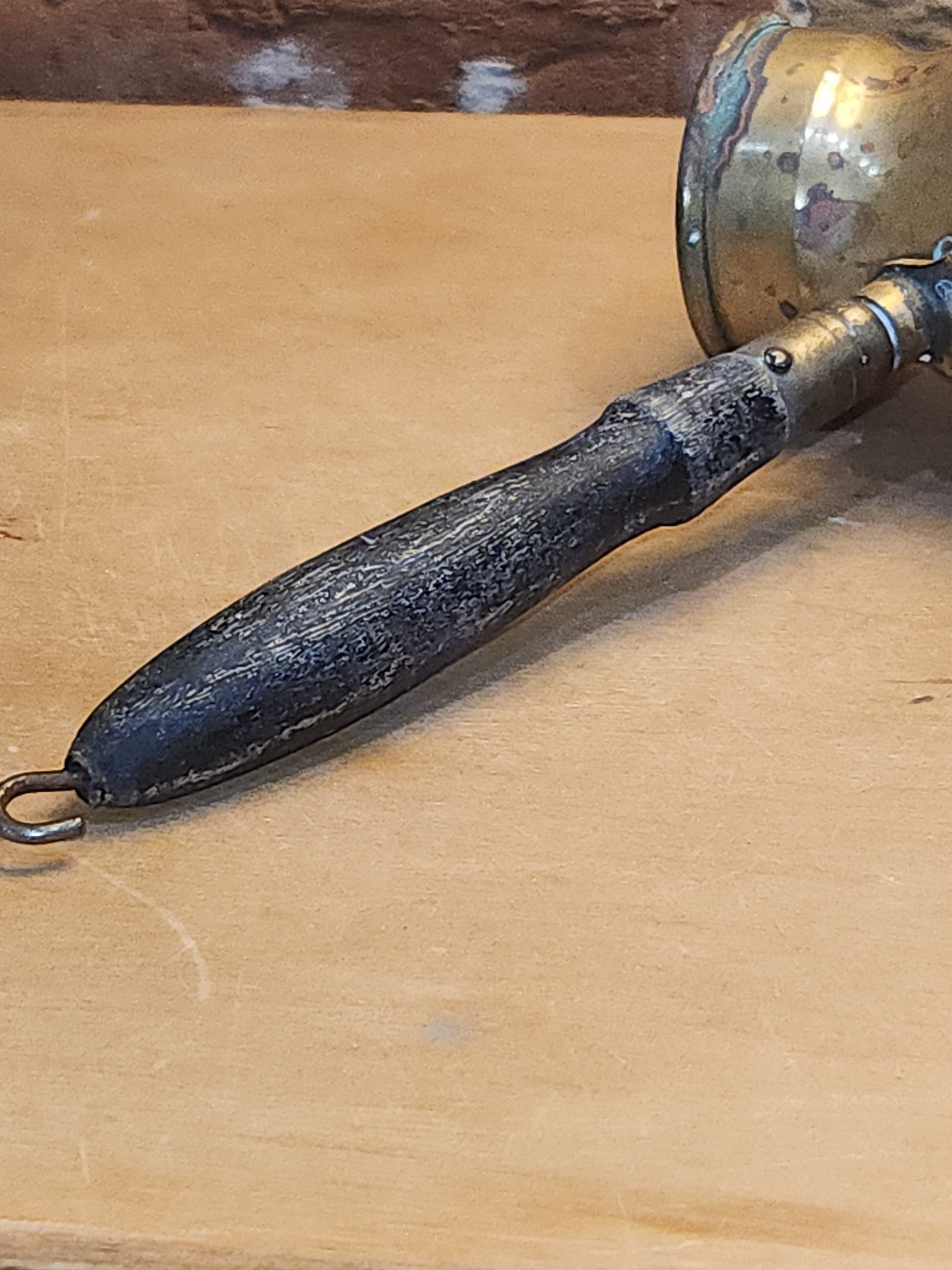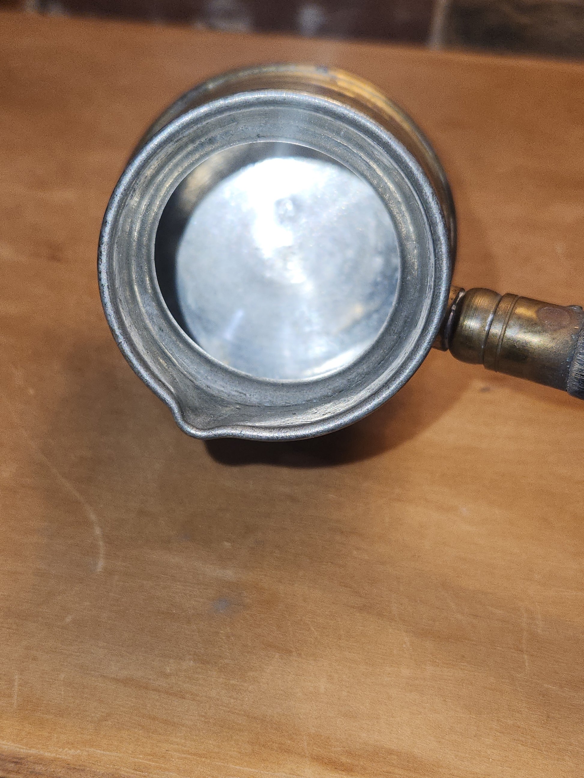 This is a neat piece for your vintage style kitchen, it has a lot of patina or age. It is brass or brass plated. It has a tin lining. The handle has a strong attachment. The wooden handle has seen a lot of wear. There is a stamp on the bottom, but I did not find information about it. Please see photos as they are part of the description and show you what you will recieve