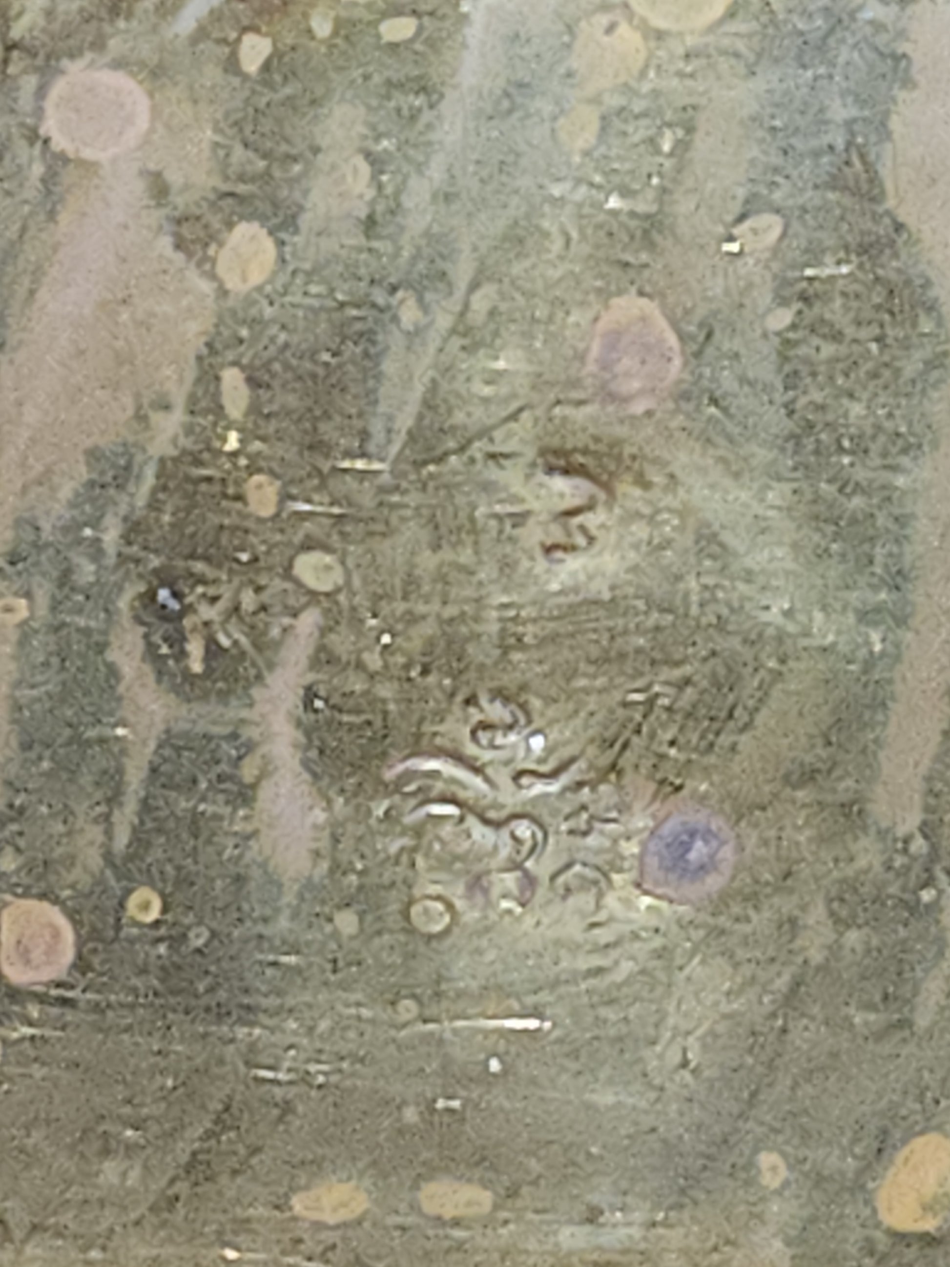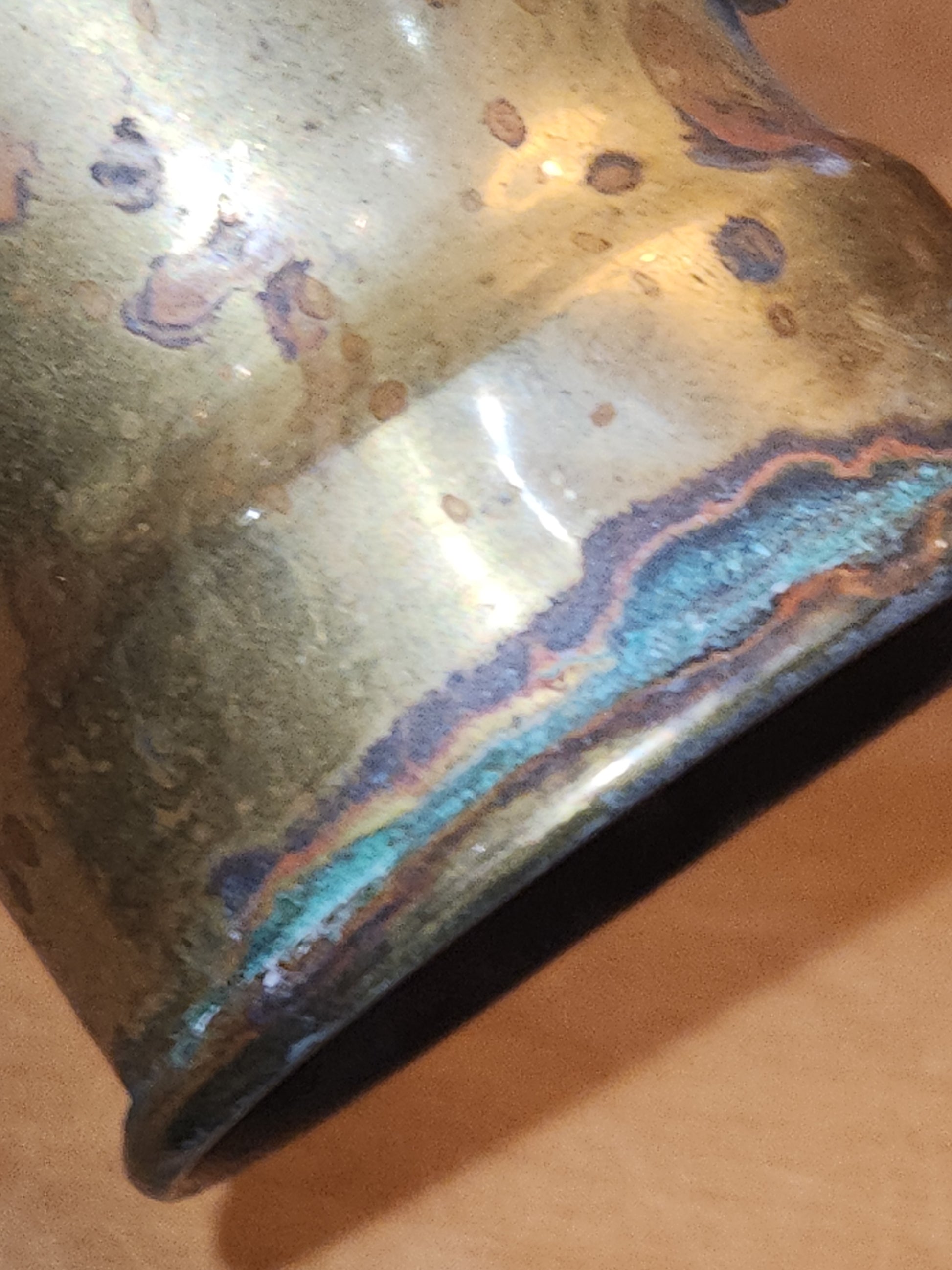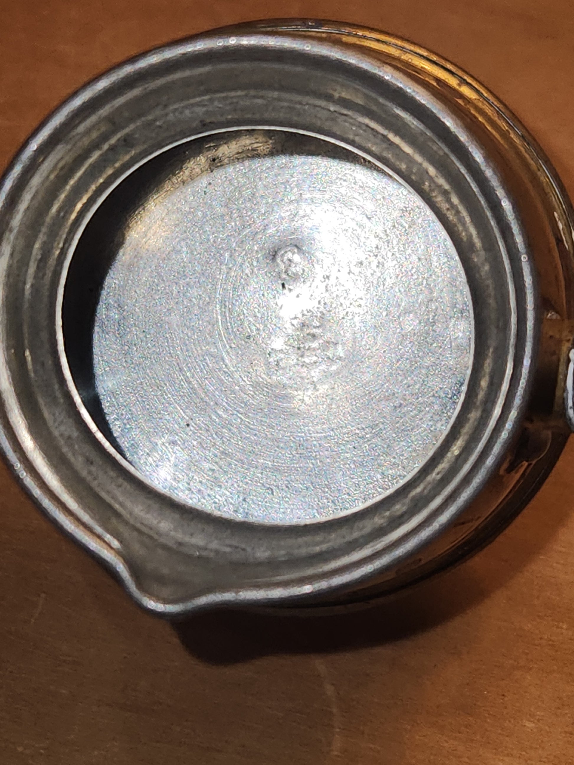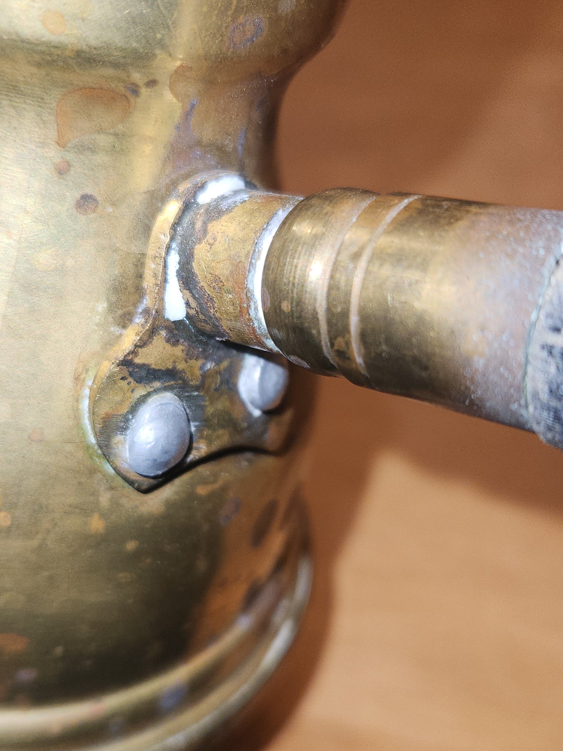 This is a neat piece for your vintage style kitchen, it has a lot of patina or age. It is brass or brass plated. It has a tin lining. The handle has a strong attachment. The wooden handle has seen a lot of wear. There is a stamp on the bottom, but I did not find information about it. Please see photos as they are part of the description and show you what you will recieve