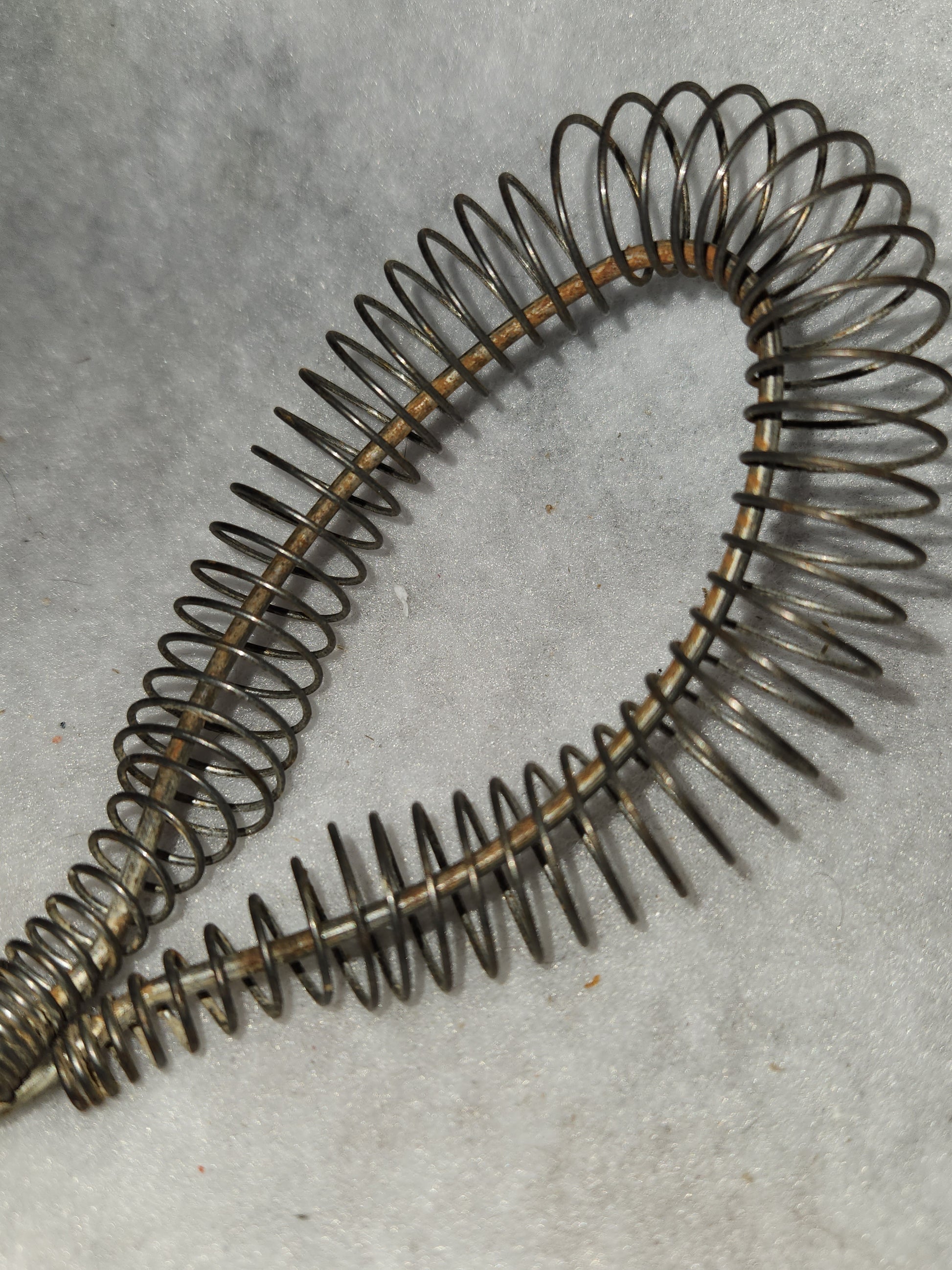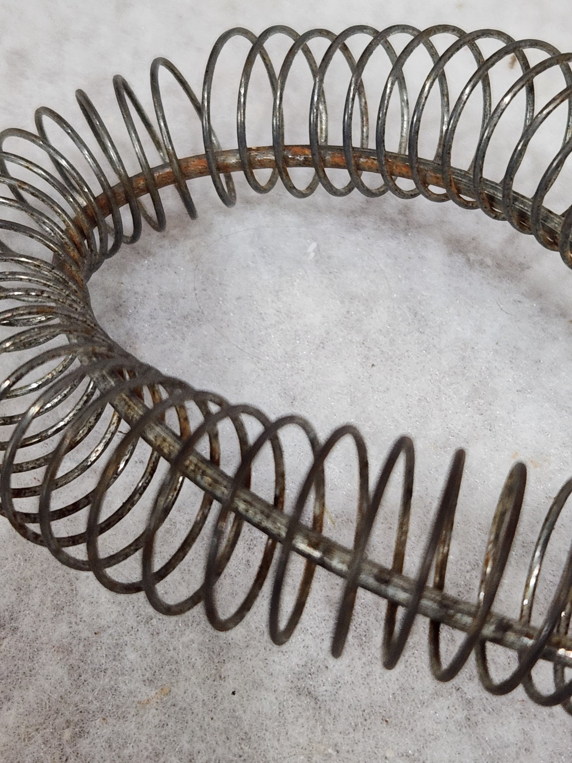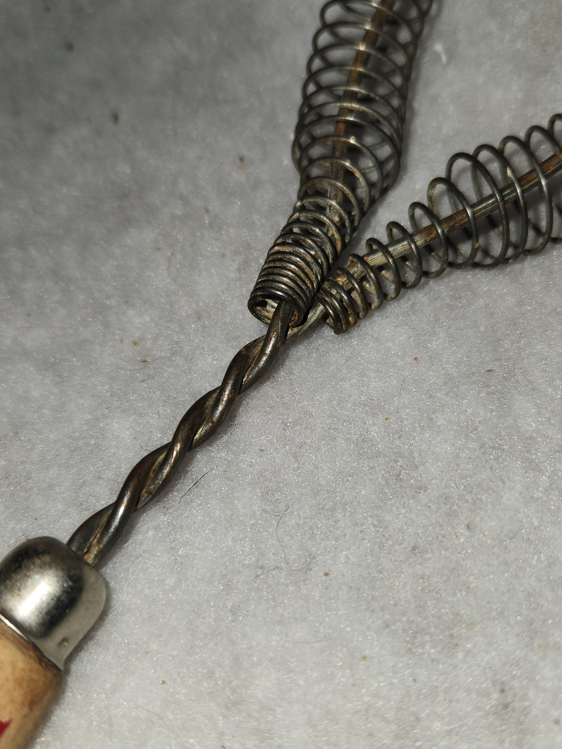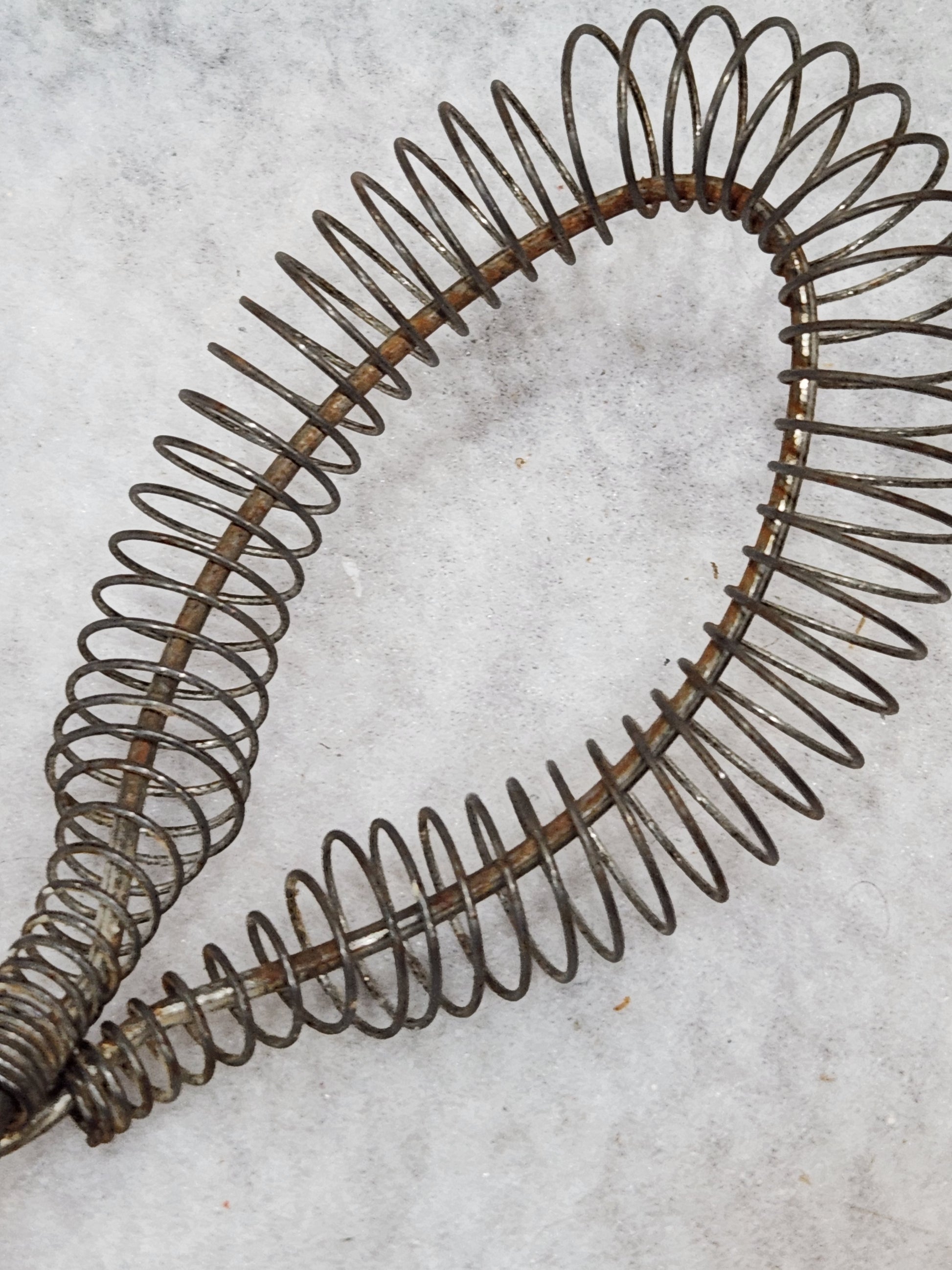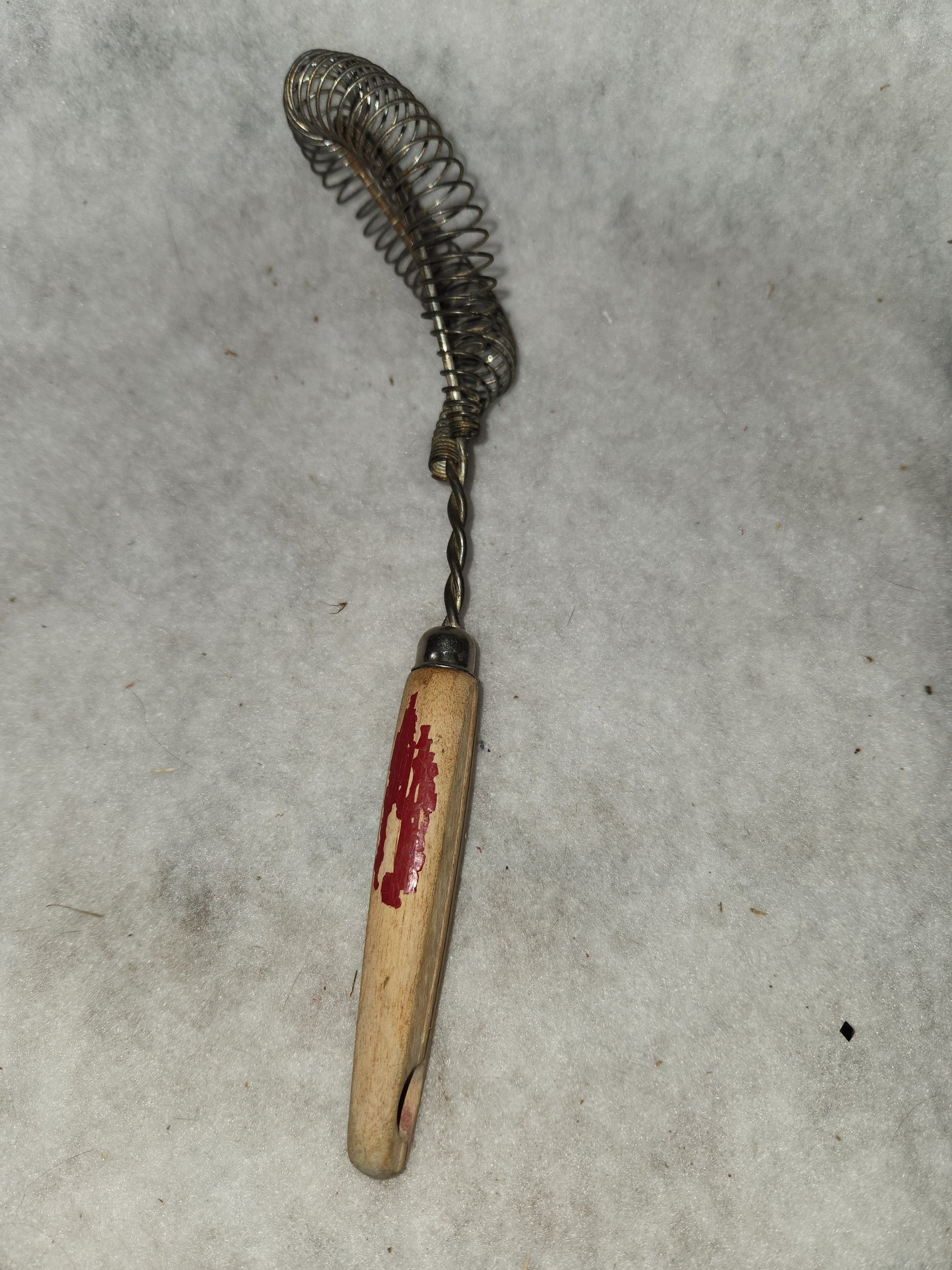Vintage utensil twisted coiled whisk stainless steel worn red wooden handle kit558