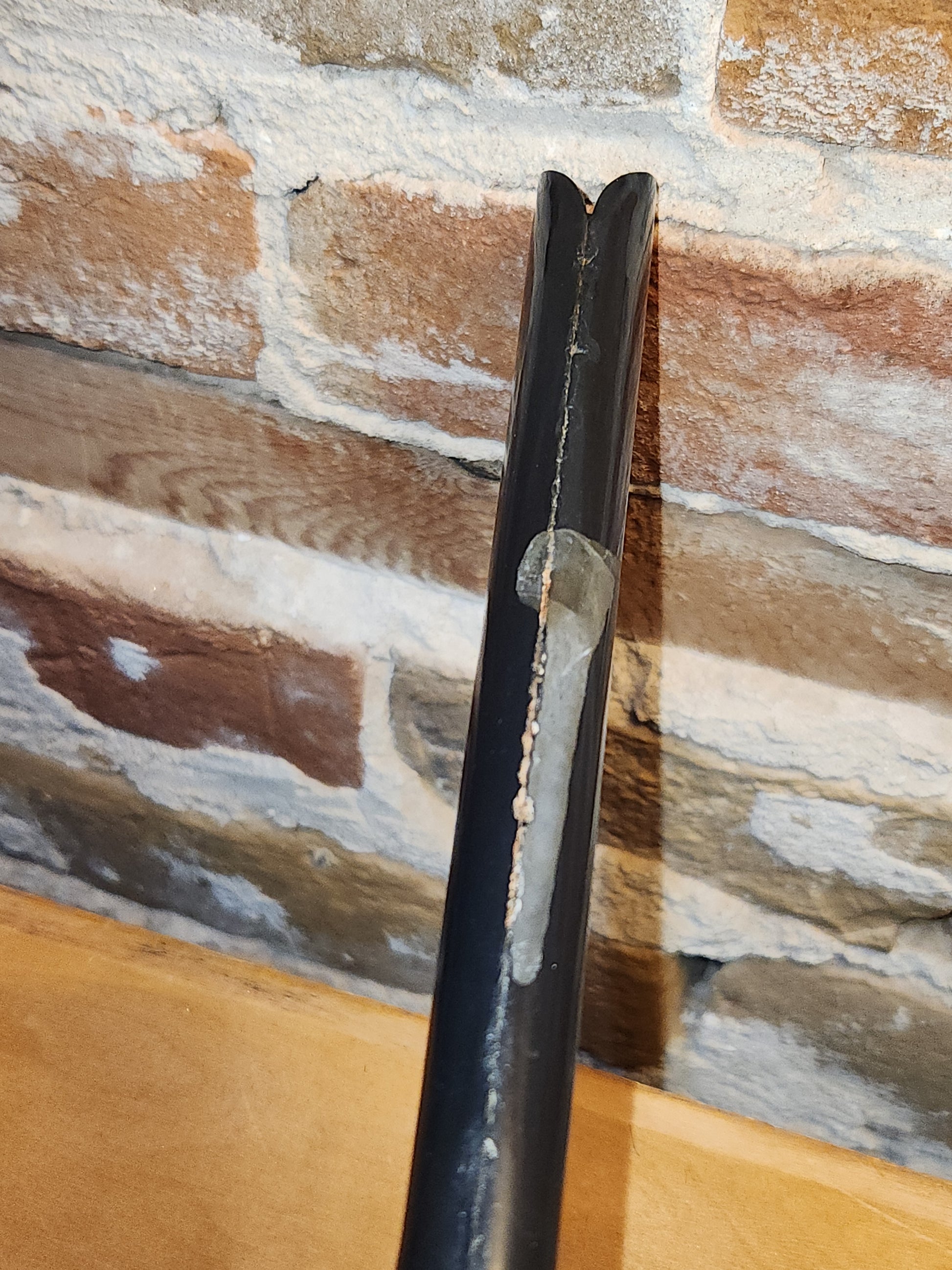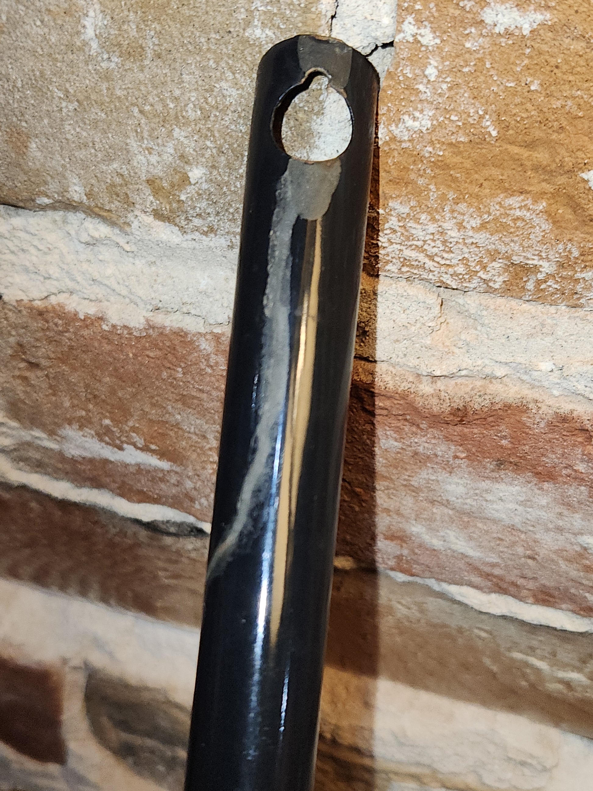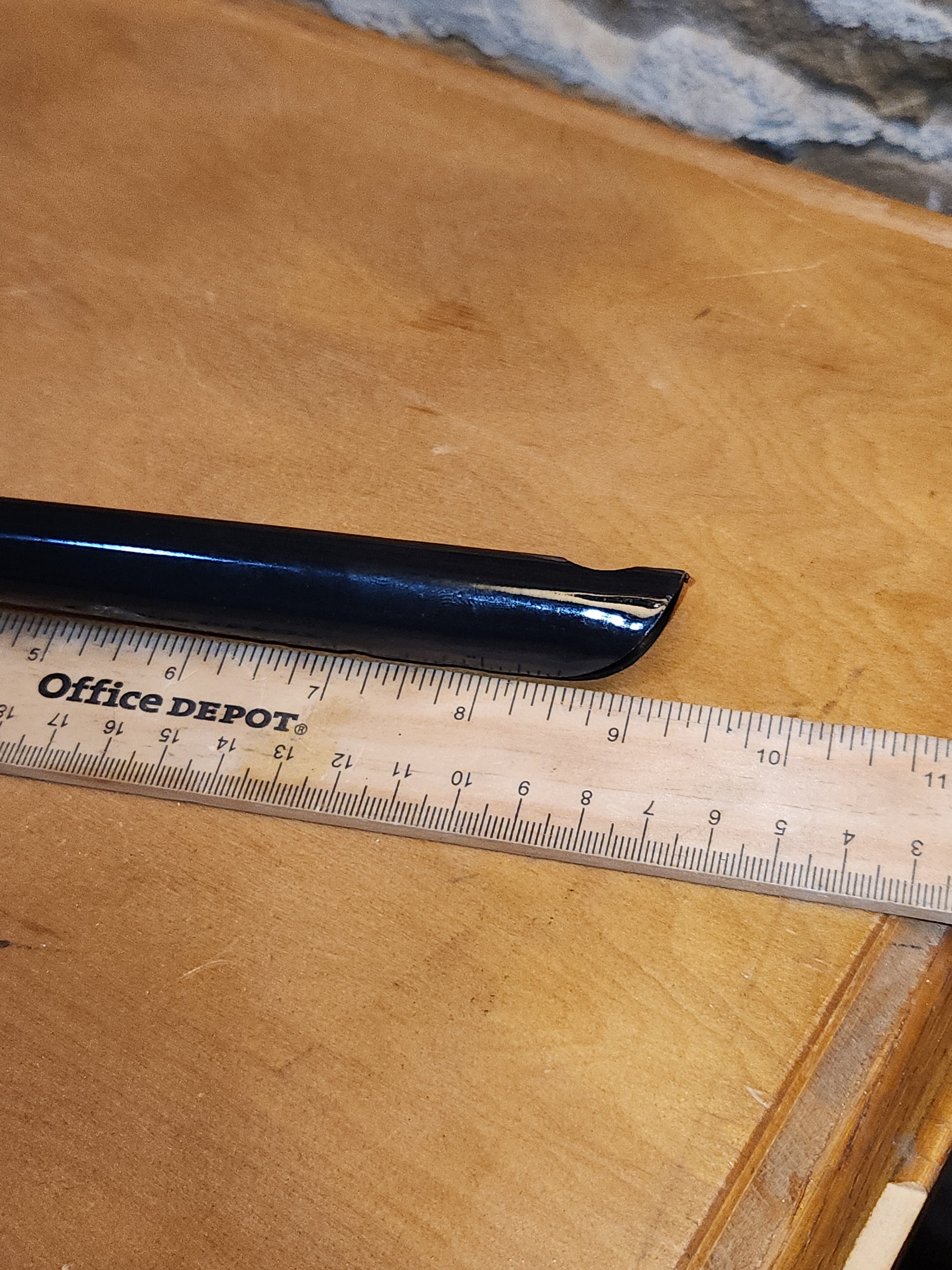 From tip of cup to handle it is nearly 13" will require a box bigger than 12" that tend to cost a bit more. It had fantastic patina for decorating vintage kitchen of add a pixie or santa and greenery to the ladle and hang from the wall. It has spots that enamel has chipped off or paint worn off. The dimension of top of label is 5" please look at all photos as they are part of this description.