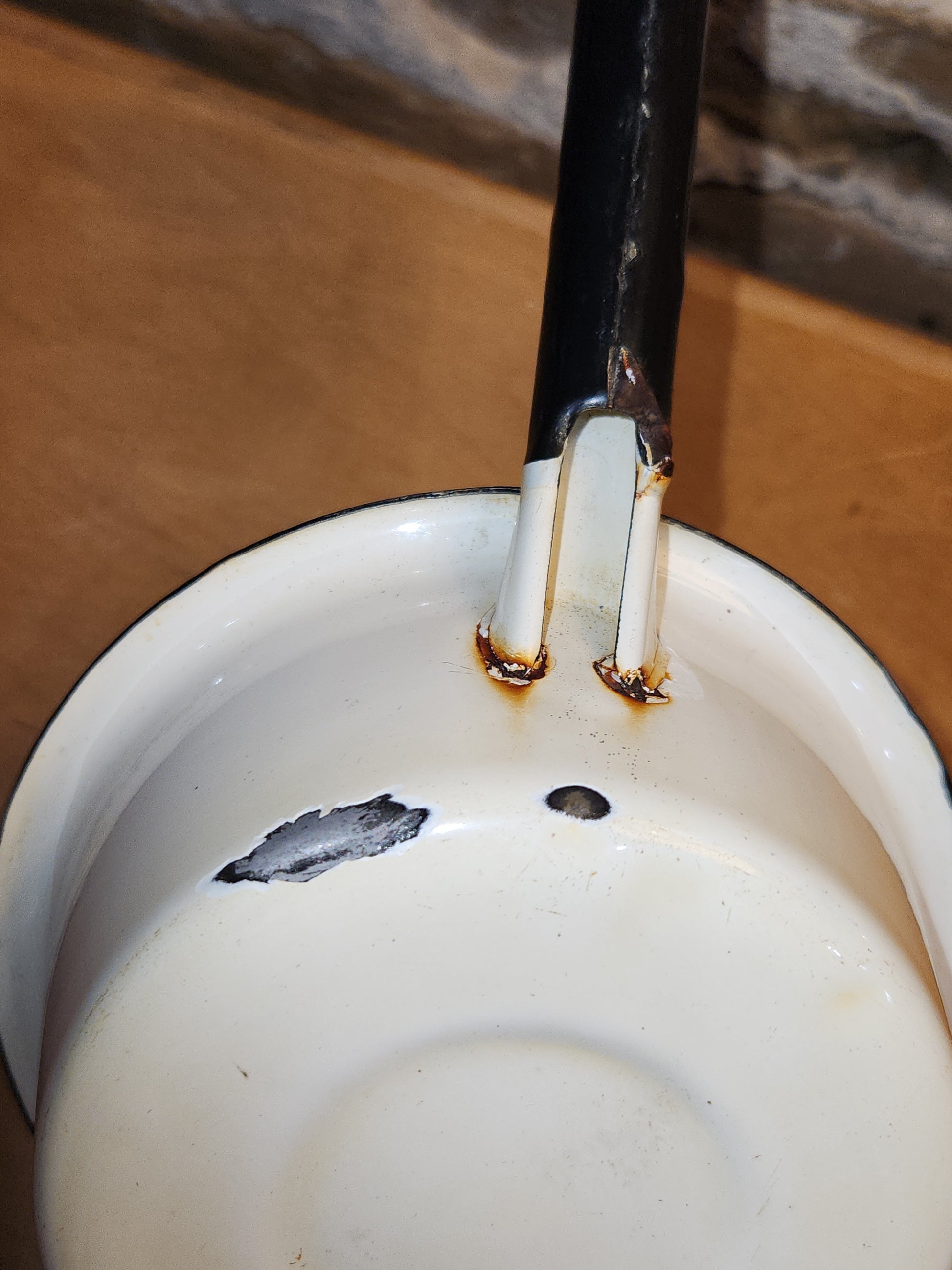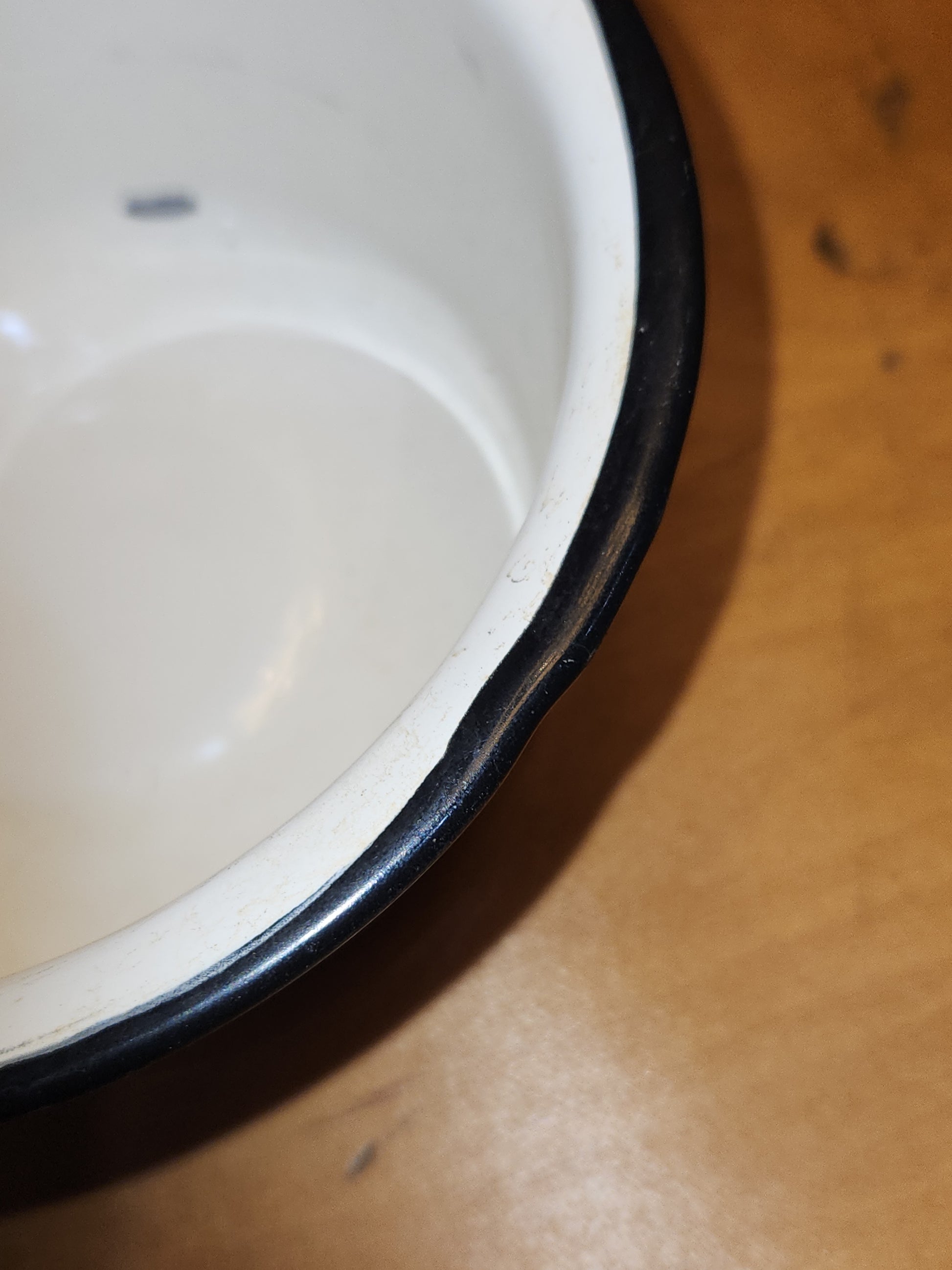 Vintage White Enamel Ladle Water Diooer with black handle and trim. En87