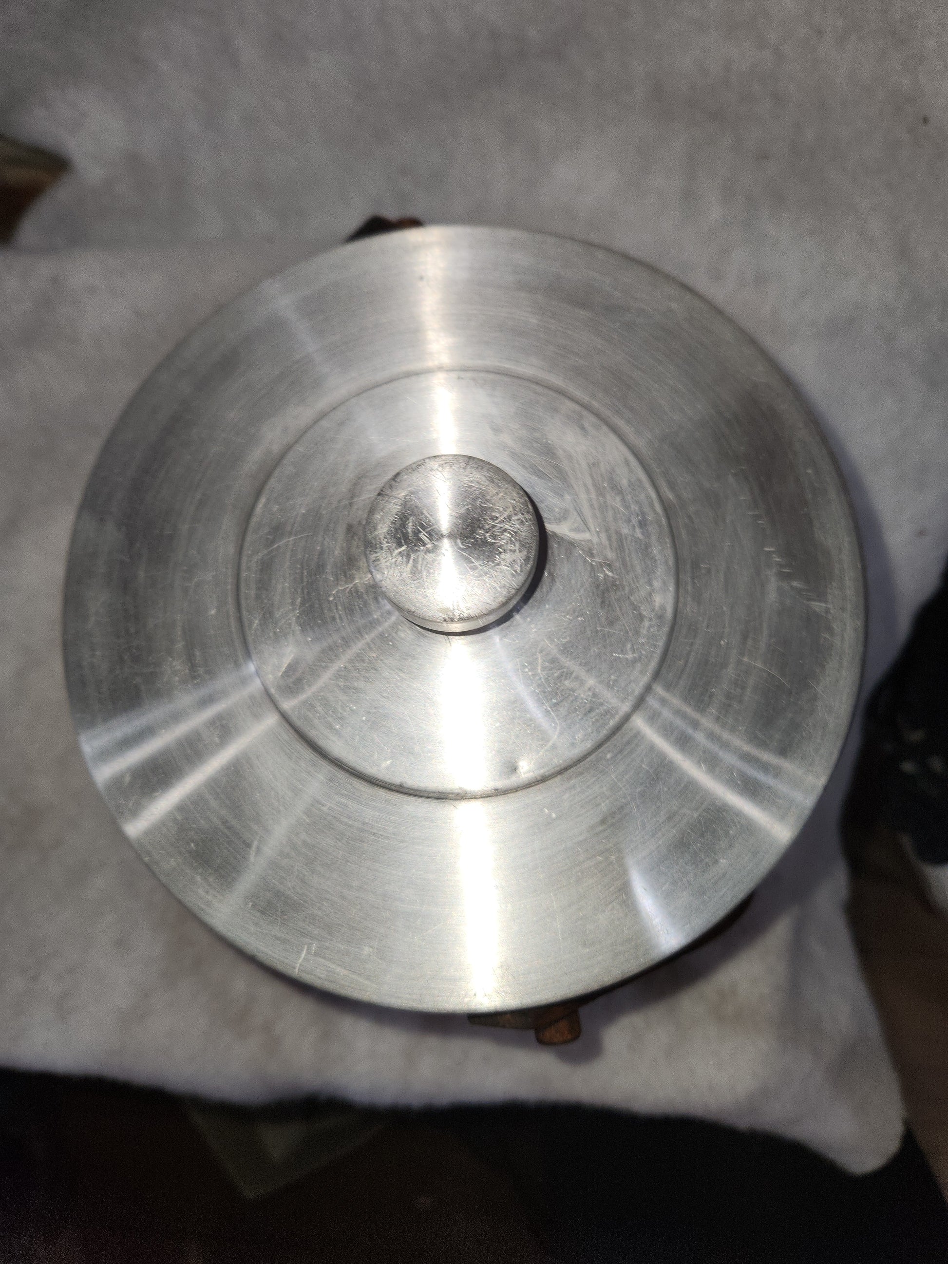 This is vintage wooden and aluminum ice bucket is roughly eleven inches high eight inches across. There is some wear as to be expected on a piece this old and there's a few tiny dents in the lid. Otherwise it's in good condition. Please see photos as they are part of the description.